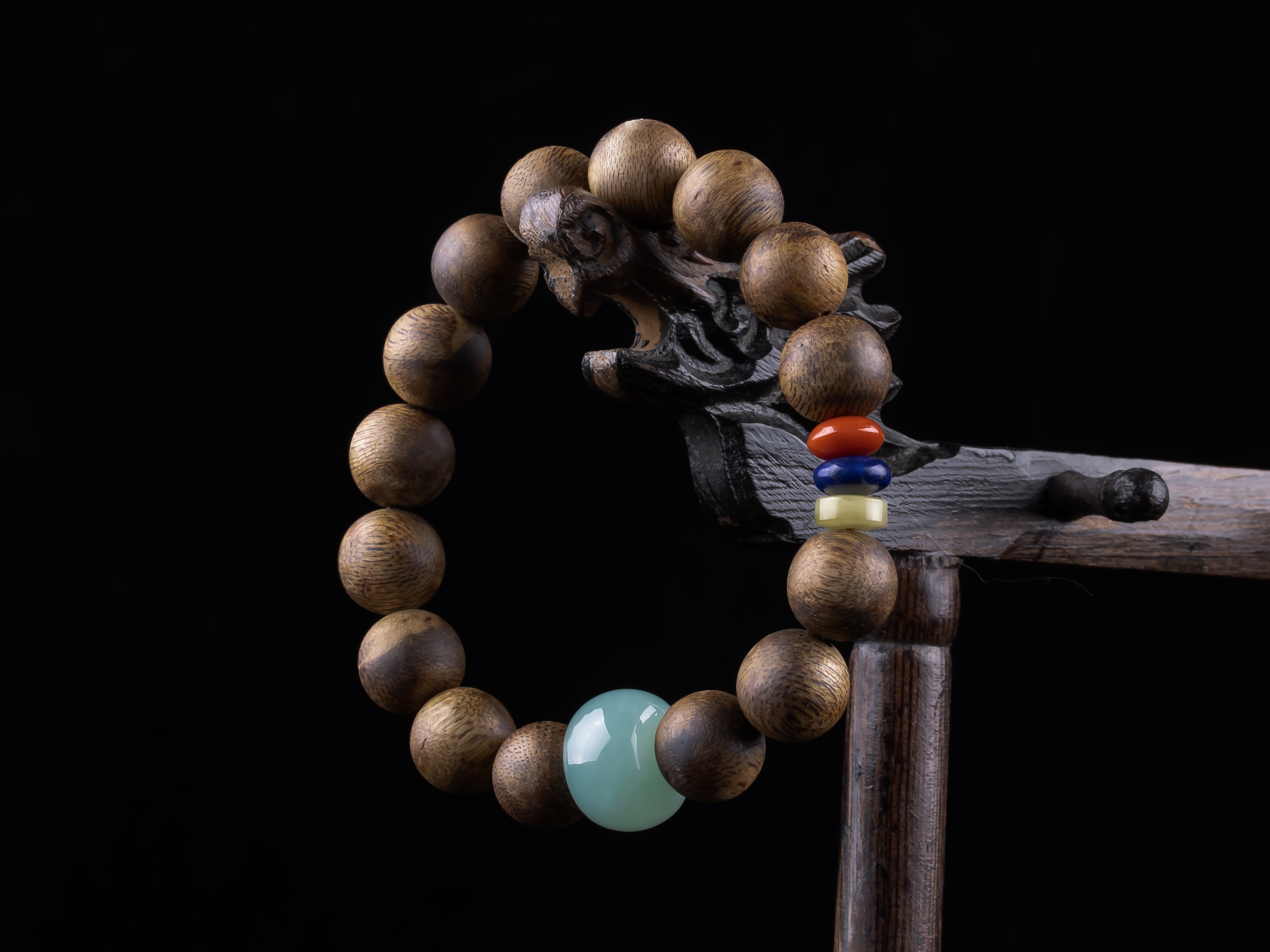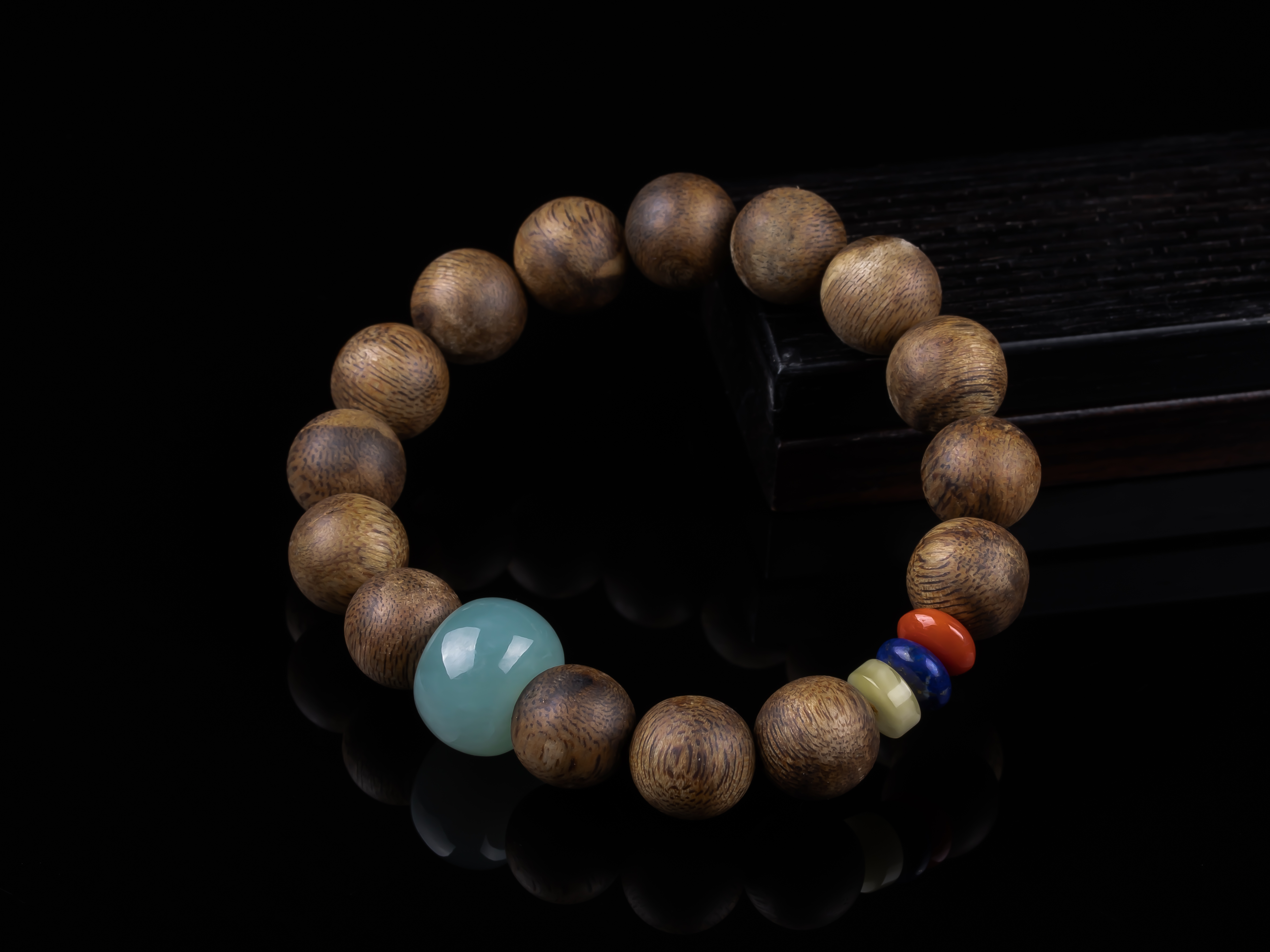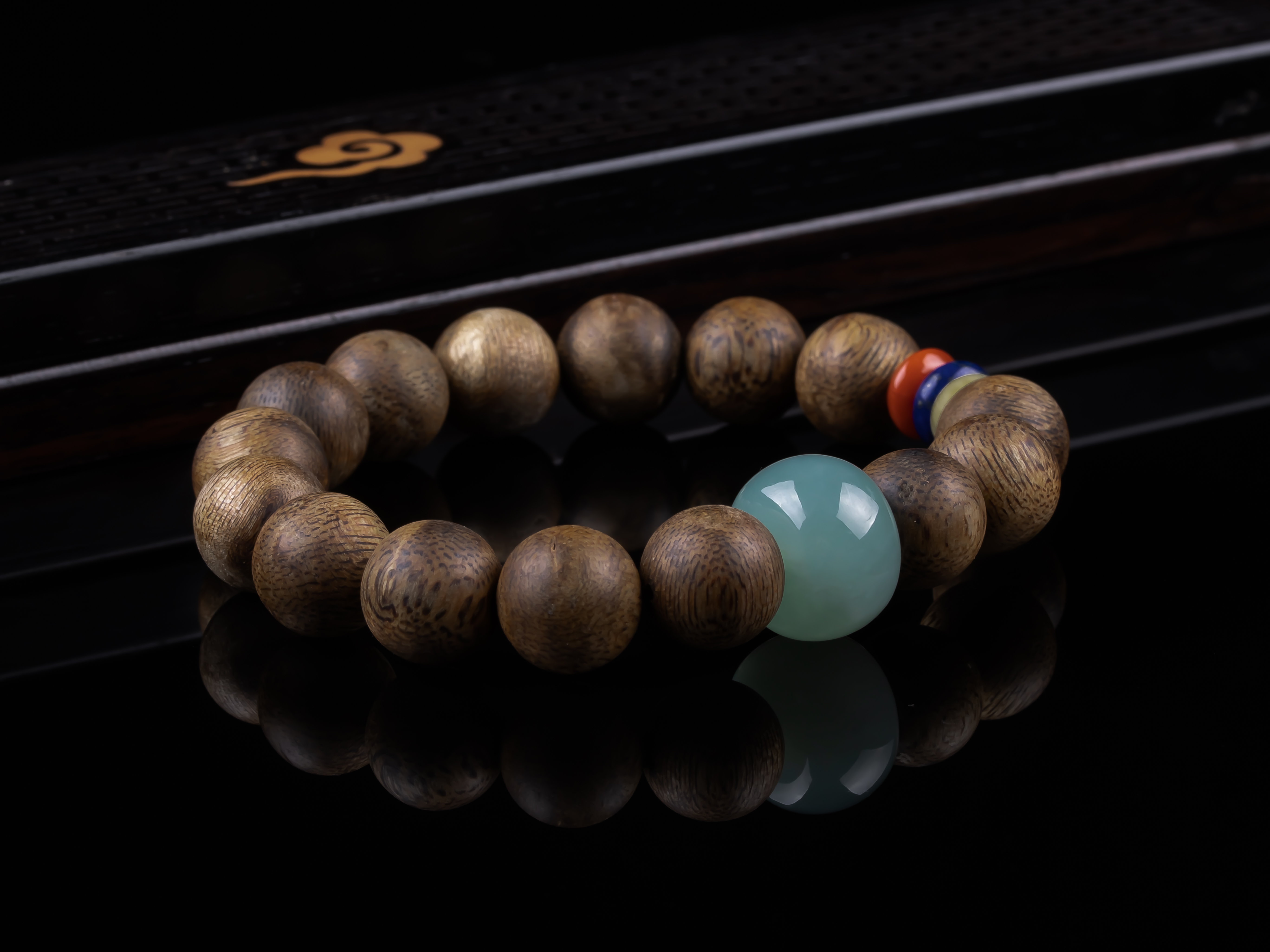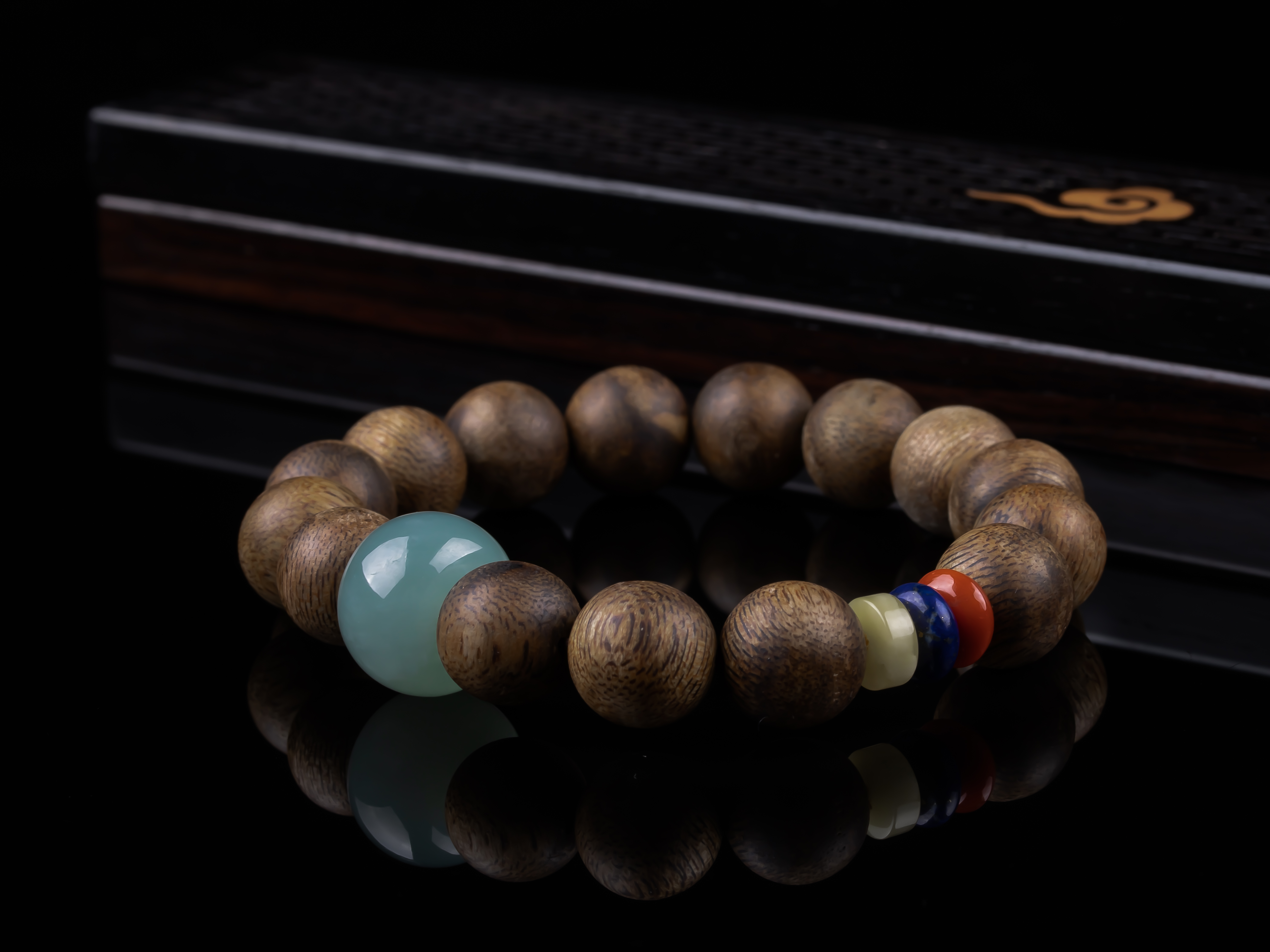 XY0234沉香+翡翠苹果珠三宝手串,天然沉香12mm,原色原味,香味自然清甜,一颗冰种蓝底色的翡翠大苹果珠,再搭蜜蜡、南红、青金石,集齐文玩三宝,整体古韵大方,上手非常大气。
