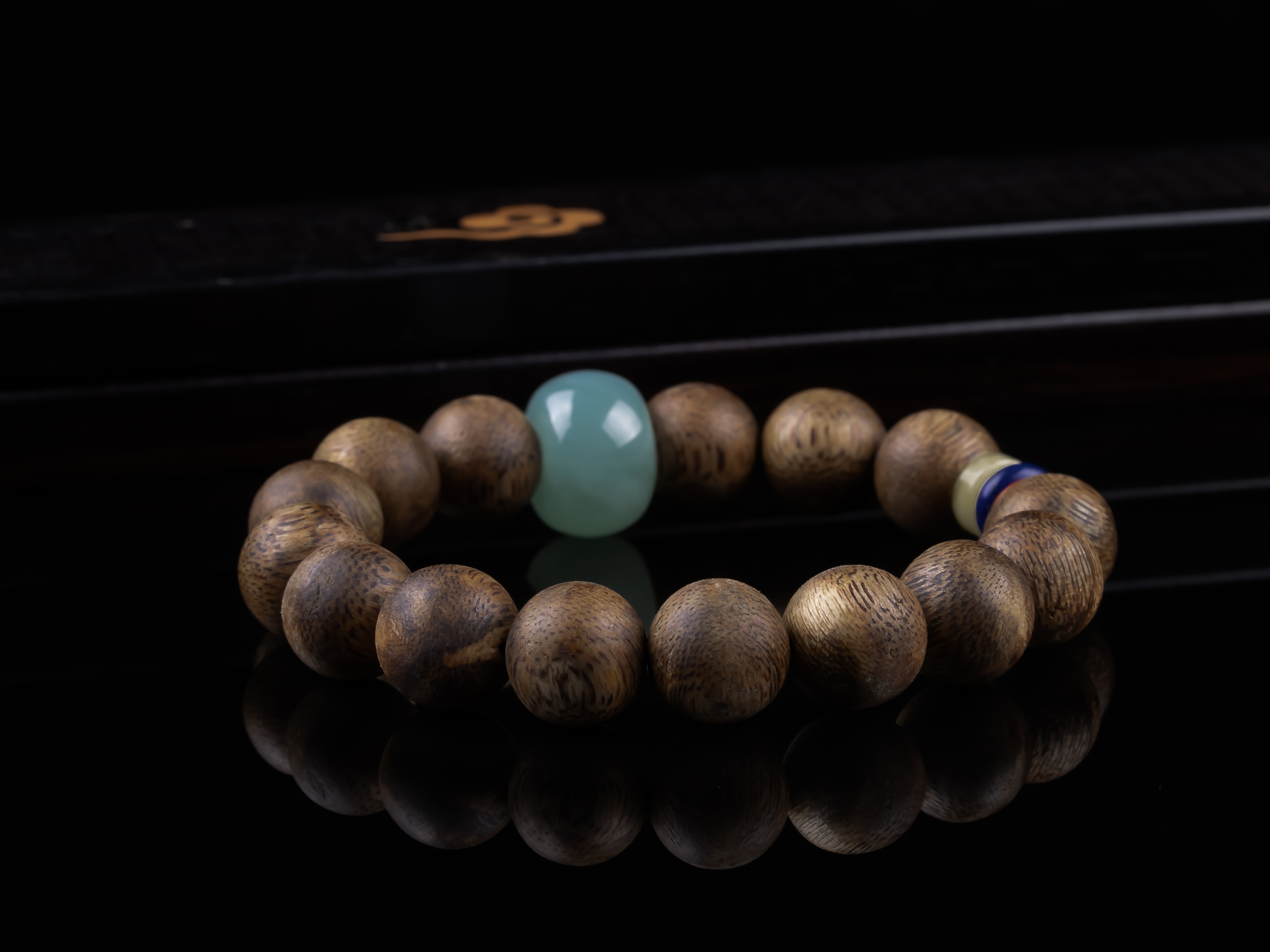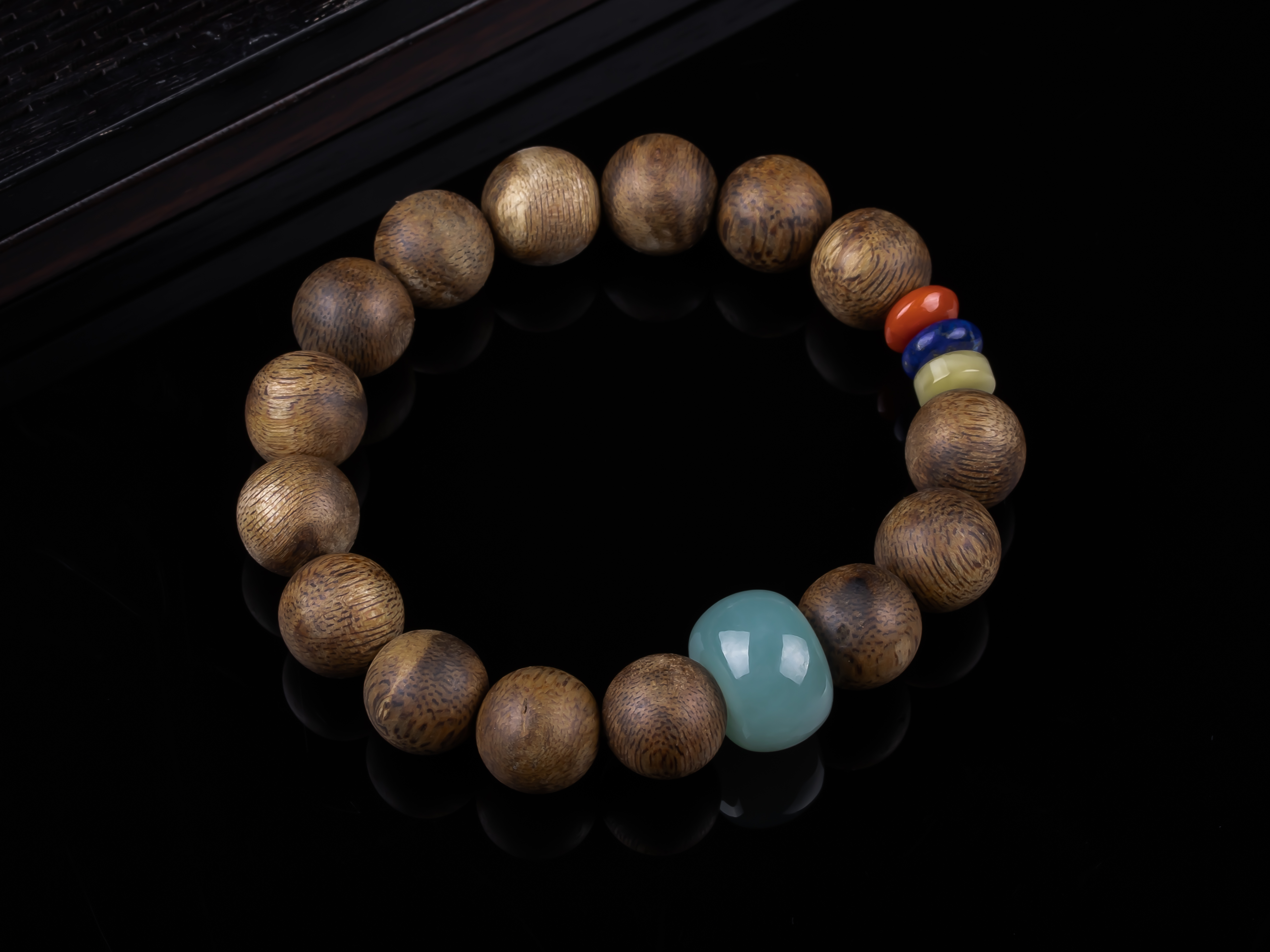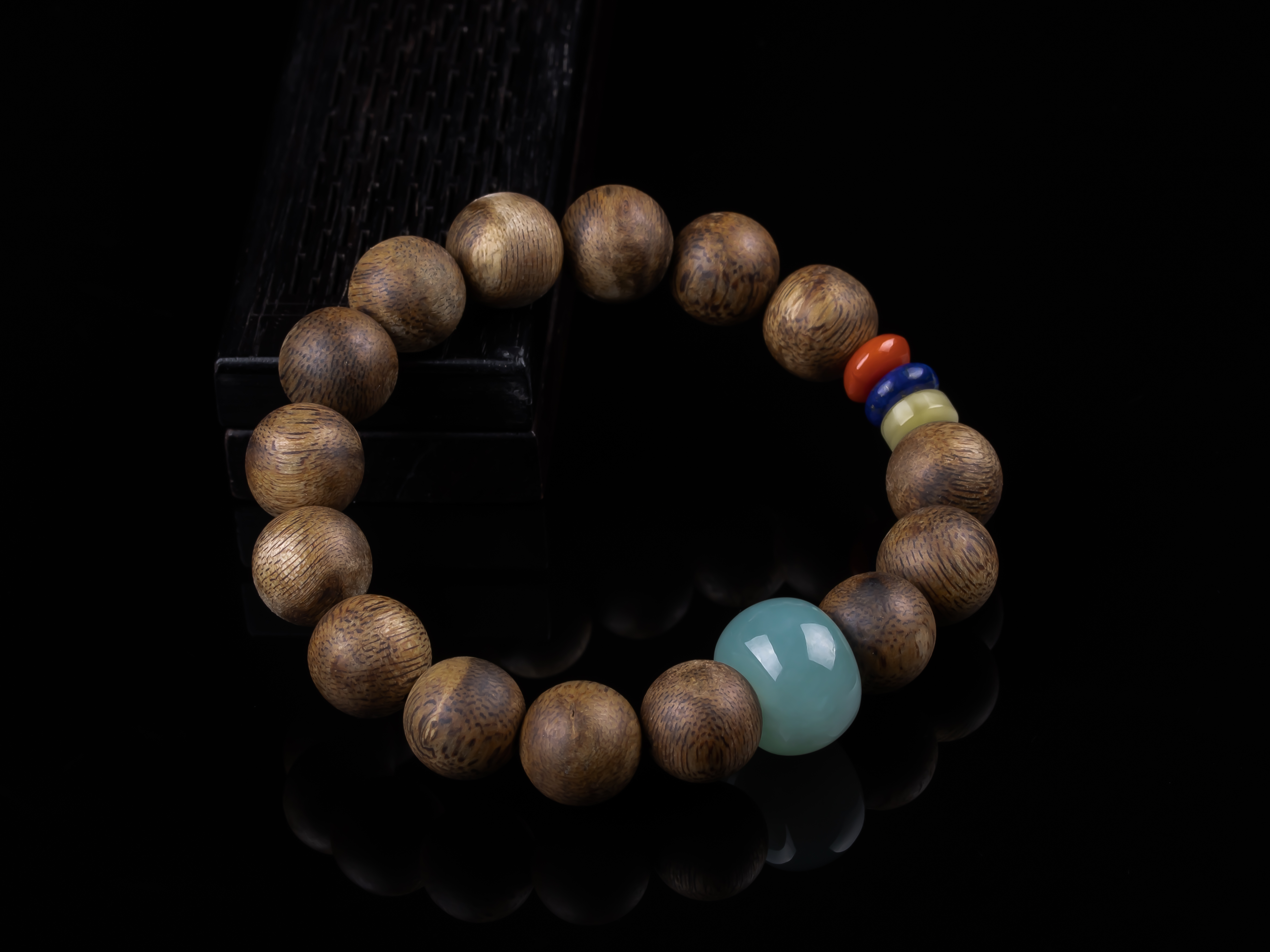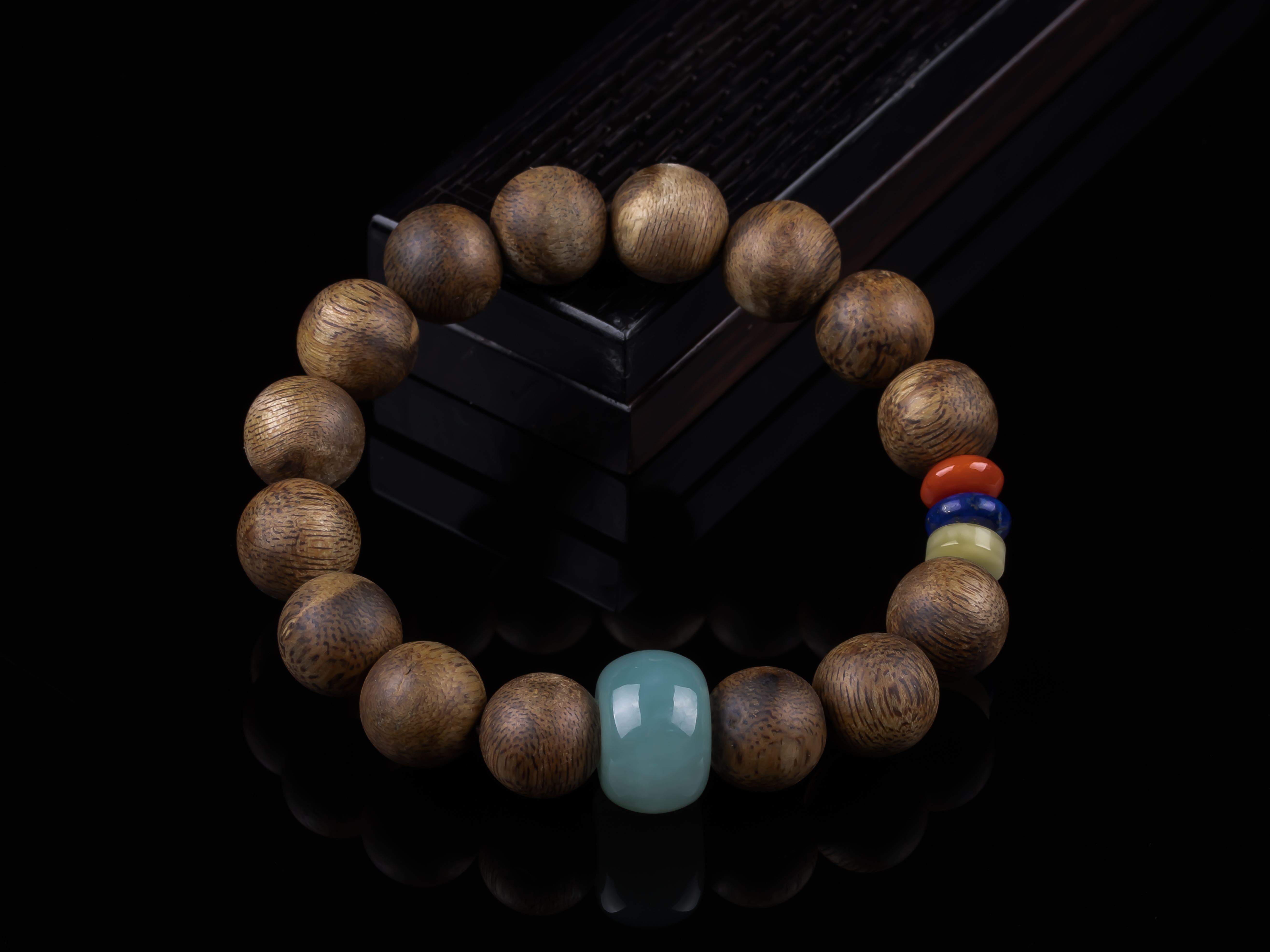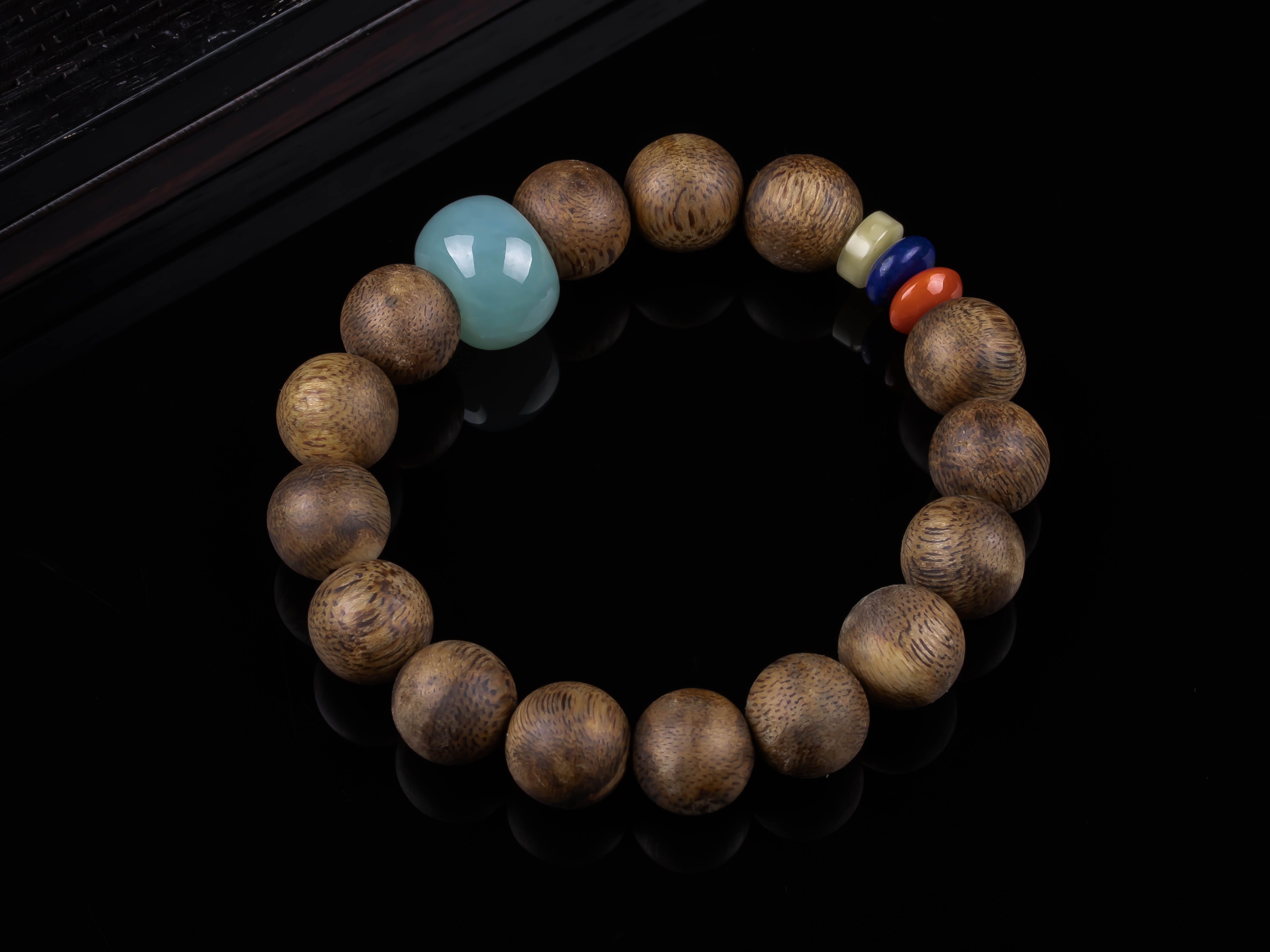 XY0234沉香+翡翠苹果珠三宝手串,天然沉香12mm,原色原味,香味自然清甜,一颗冰种蓝底色的翡翠大苹果珠,再搭蜜蜡、南红、青金石,集齐文玩三宝,整体古韵大方,上手非常大气。