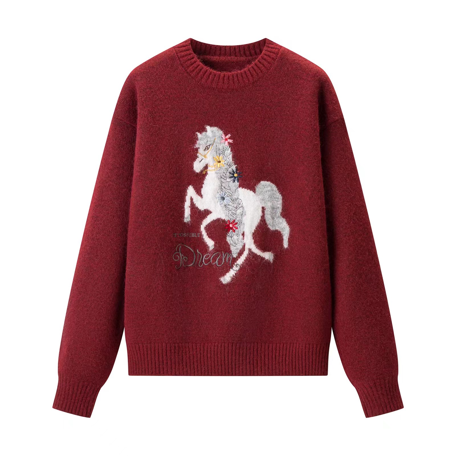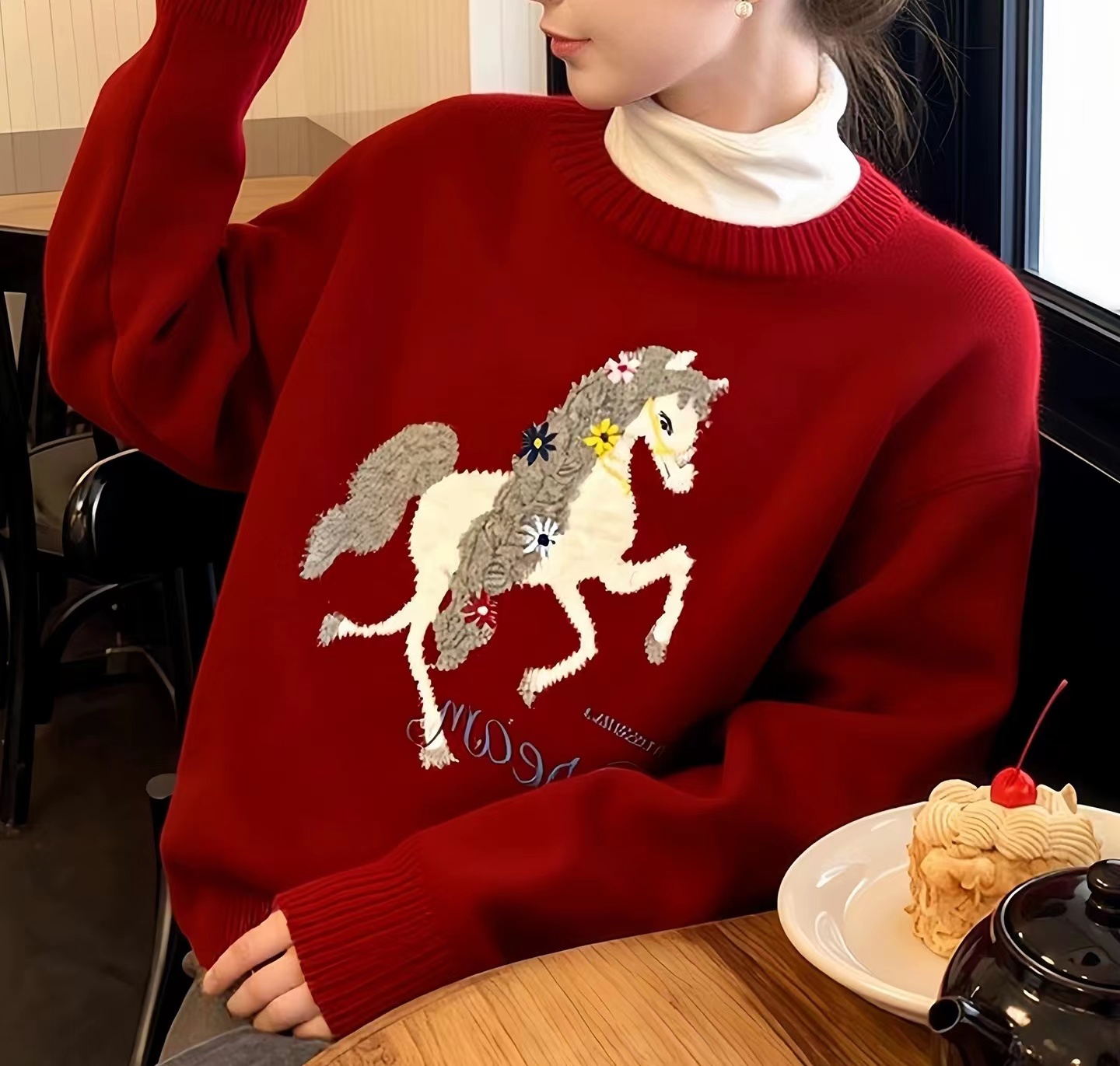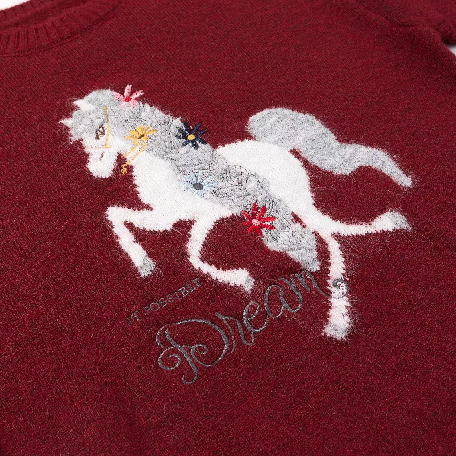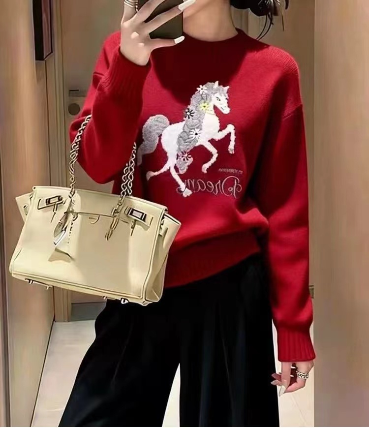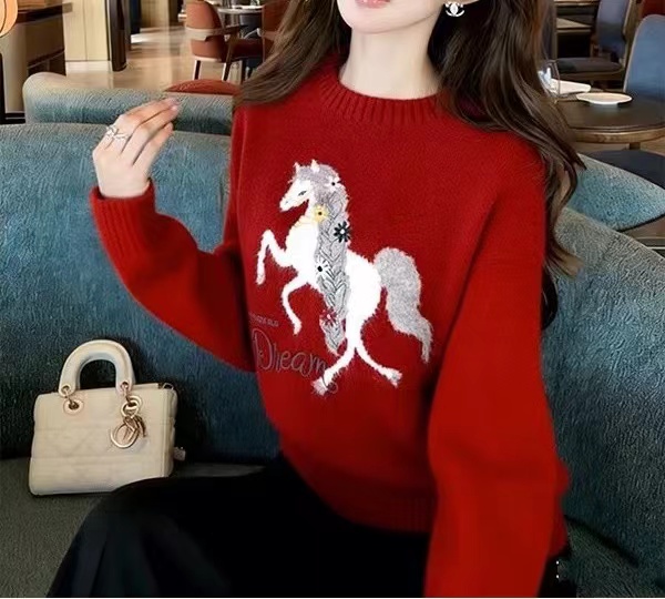 圆领小马刺绣针织衫本命年红色小马图案针织衫女秋冬慵懒风软糯圆领圣诞穿搭加厚毛衣,梦幻骏马刺绣毛衣 新年红氛围感针织衫,软糯亲肤的针织面料,触感细腻不扎身,冬日穿保暖又舒适~圆领设计不挑脖颈线条,宽松落肩版型对各种身材都超包容,藏肉又显瘦。衣身的立体骏马刺绣超有质感,灵动的造型搭配jing致的装饰细节,打破单调更具设计感。新年红与精典黑两款配色,红色款自带节日氛围,过年穿超应景,黑色款简约百搭,日常穿也超有腔调,内搭外穿都好看!