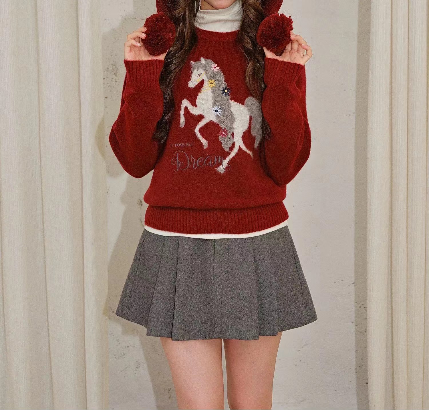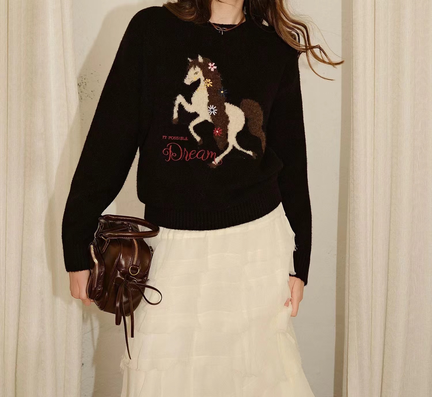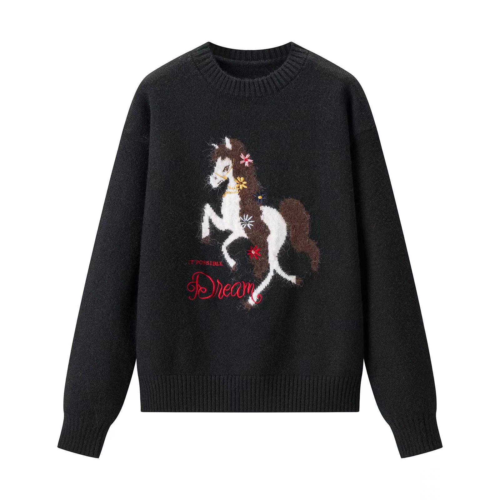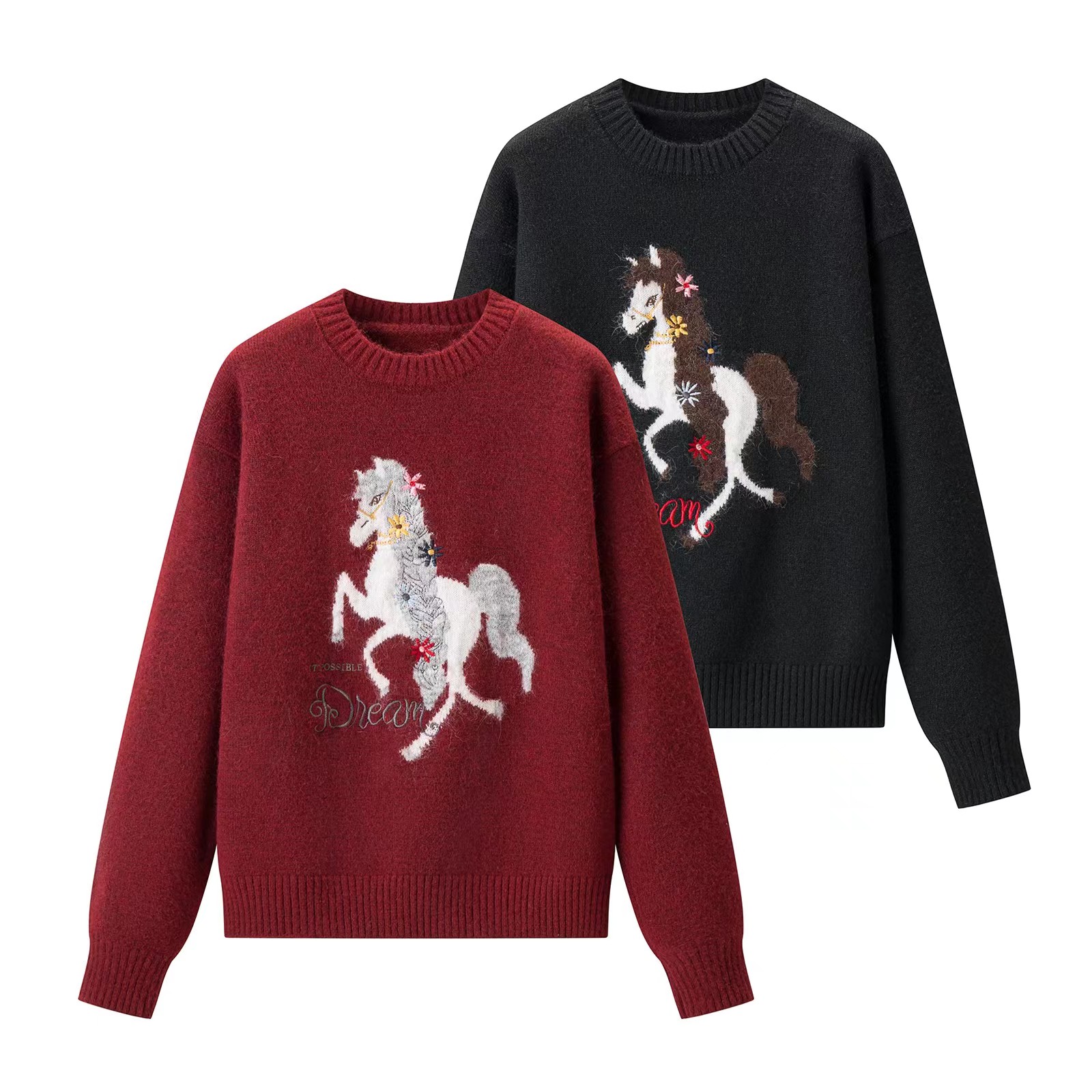 圆领小马刺绣针织衫本命年红色小马图案针织衫女秋冬慵懒风软糯圆领圣诞穿搭加厚毛衣,梦幻骏马刺绣毛衣 新年红氛围感针织衫,软糯亲肤的针织面料,触感细腻不扎身,冬日穿保暖又舒适~圆领设计不挑脖颈线条,宽松落肩版型对各种身材都超包容,藏肉又显瘦。衣身的立体骏马刺绣超有质感,灵动的造型搭配jing致的装饰细节,打破单调更具设计感。新年红与精典黑两款配色,红色款自带节日氛围,过年穿超应景,黑色款简约百搭,日常穿也超有腔调,内搭外穿都好看!
