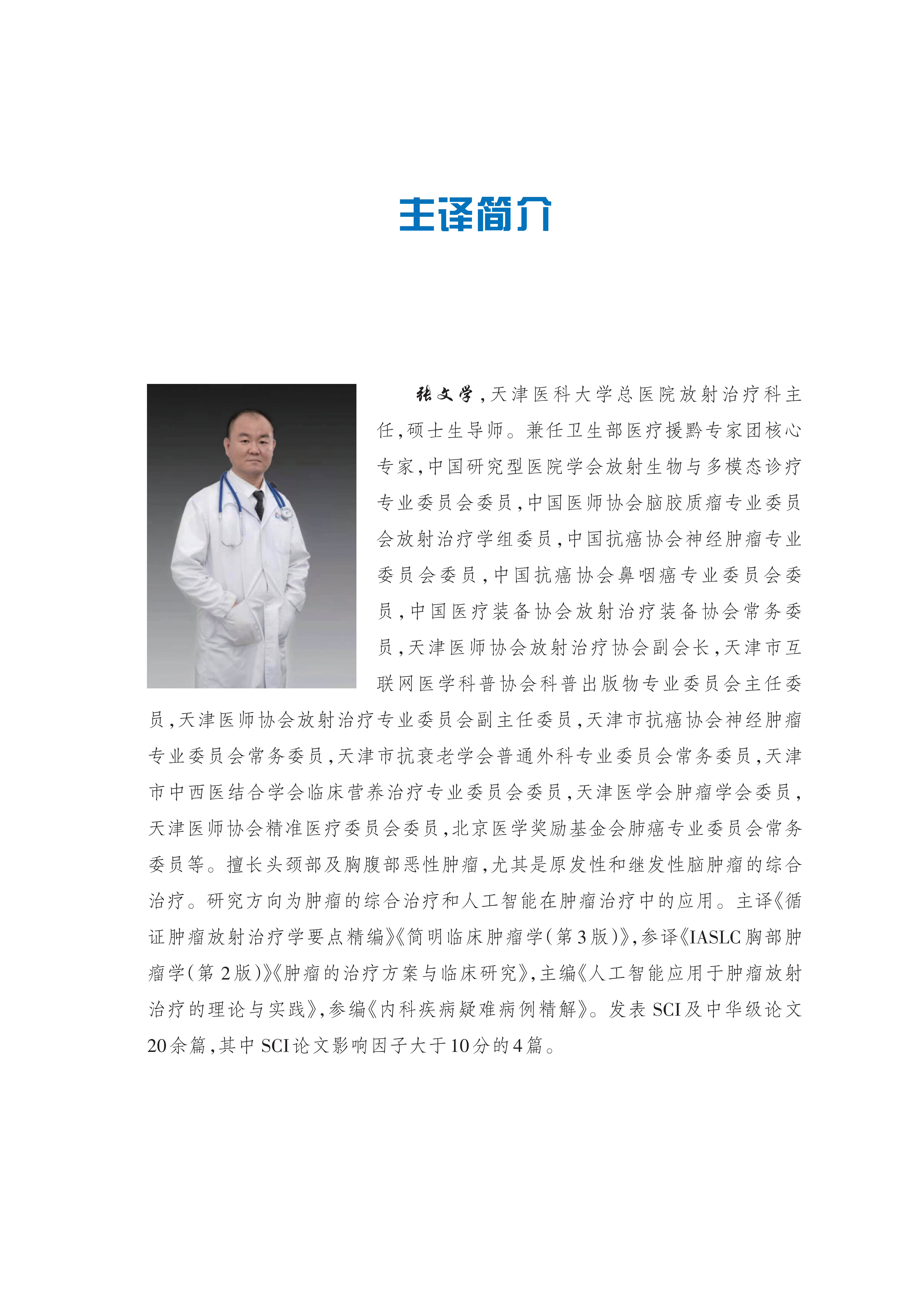 张文学,天津医科大学总医院放射治疗科主任,硕士生导师。兼任卫生部医疗援黔专家团核心专家,中国研究型医院学会放射生物与多模态诊疗专业委员会委员,中国医师协会脑胶质瘤专业委员会放射治疗学组委员,中国抗癌协会神经肿瘤专业委员会委员,中国抗癌协会鼻咽癌专业委员会委员,中国医疗装备协会放射治疗装备协会常务委员,天津医师协会放射治疗协会副会长,天津市互联网医学科普协会科普出版物专业委员会主任委员,天津医师协会放射治疗专业委员会副主任委员,天津市抗癌协会神经肿瘤专业委员会常务委员,天津市抗衰老学会普通外科专业委员会常务委员,天津市中西医结合学会临床营养治疗专业委员会委员,天津医学会肿瘤学会委员,天津医师协会精准医疗委员会委员,北京医学奖励基金会肺癌专业委员会常务委员等。擅长头颈部及胸腹部恶性肿瘤,尤其是原发性和继发性脑肿瘤的综合治疗。研究方向为肿瘤的综合治疗和人工智能在肿瘤治疗中的应用。主译《循证肿瘤放射治疗学要点精编》《简明临床肿瘤学(第3版)》,参译《IASLC胸部肿瘤学(第 2版)》《肿瘤的治疗方案与临床研究》,主编《人工智能应用于肿瘤放射治疗的理论与实践》,参编《内科疾病疑难病例精解》。发表 SCI及中华级论文20余篇,其中 SCI论文影响因子大于10分的4篇。