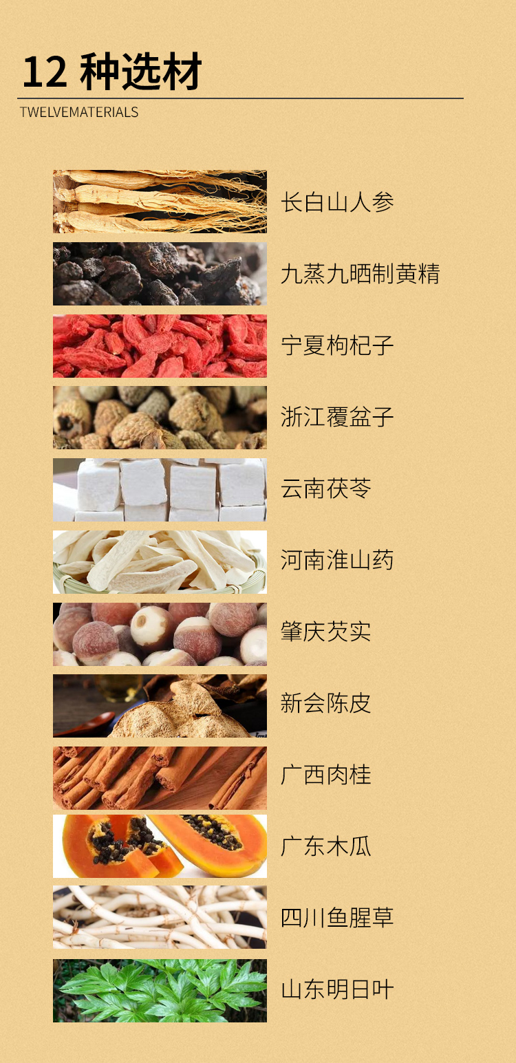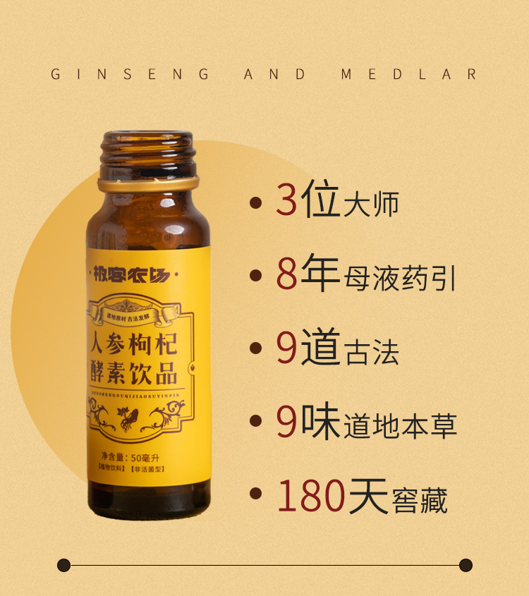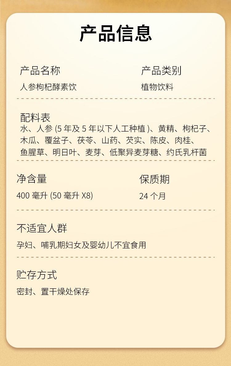 【配料表】水、人参(5年及5年以下人工种植)、黄精、枸杞子、木瓜、覆盆子、茯苓、山药、芡实、陈皮、肉桂、鱼腥草、明日叶、麦芽、低聚异麦芽糖、约氏乳杆菌