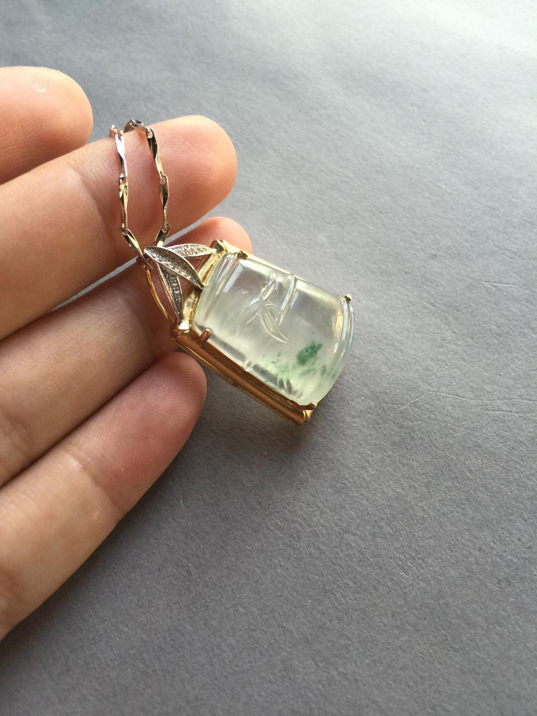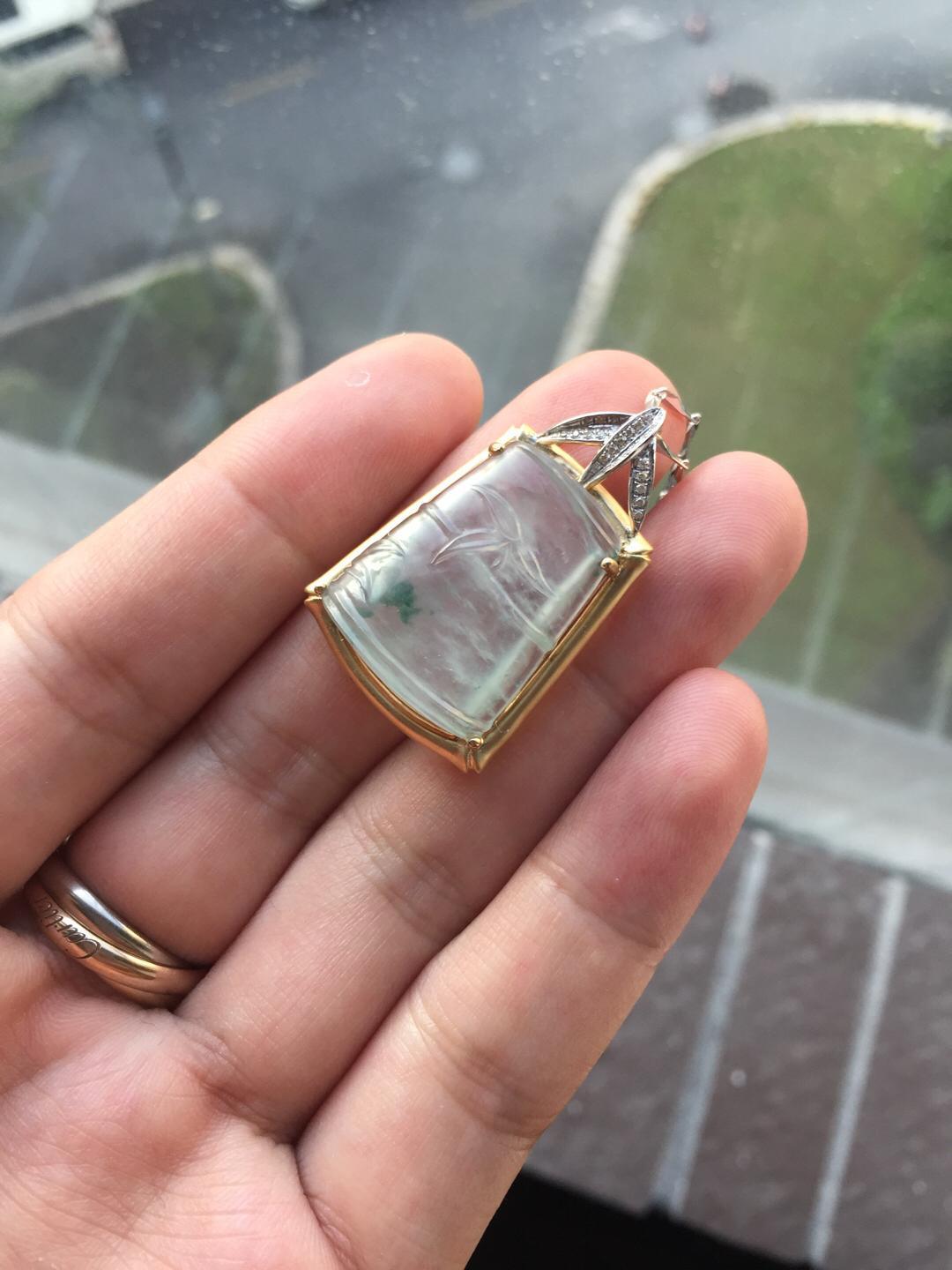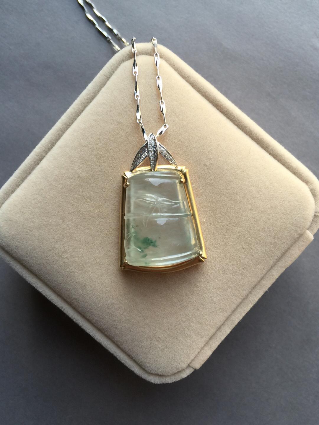 玻璃种翡翠飘花节节高,种水尖货,22.6*18.5*6.5mm,镶嵌后34.5*21.9*10mm,正装尺寸,厚庄,厚实饱满,就像一个糖块一样,一看就是特别的好东西,种气极老,荧光四射,点点飘花灵动洒脱,卓尔不群的镶嵌款式,18k黄金雕琢竹节,18k白金钻石刻画竹叶,简约而不简单的设计更加烘托出竹节高雅的气质。不可多得的一件精品,推荐