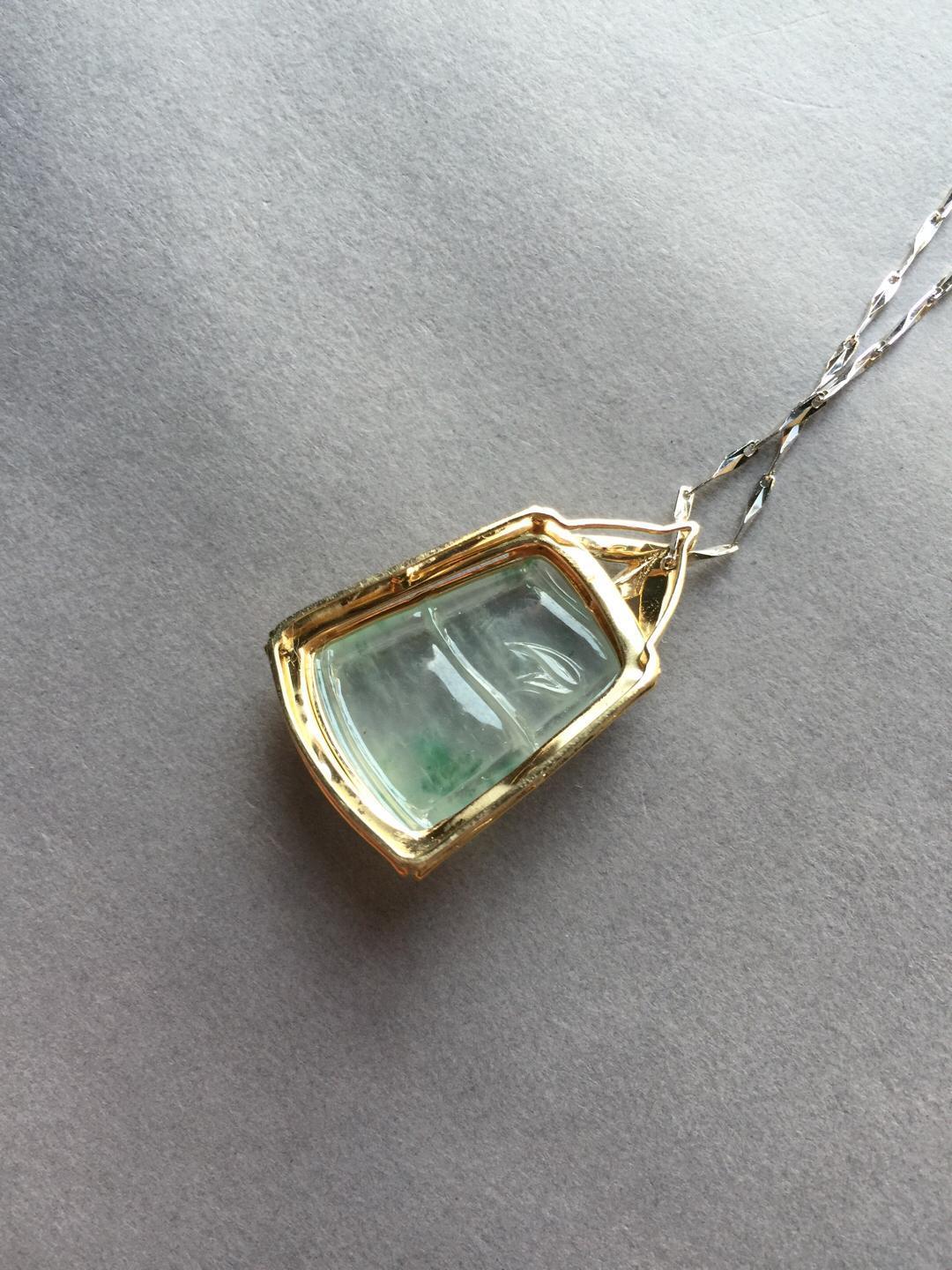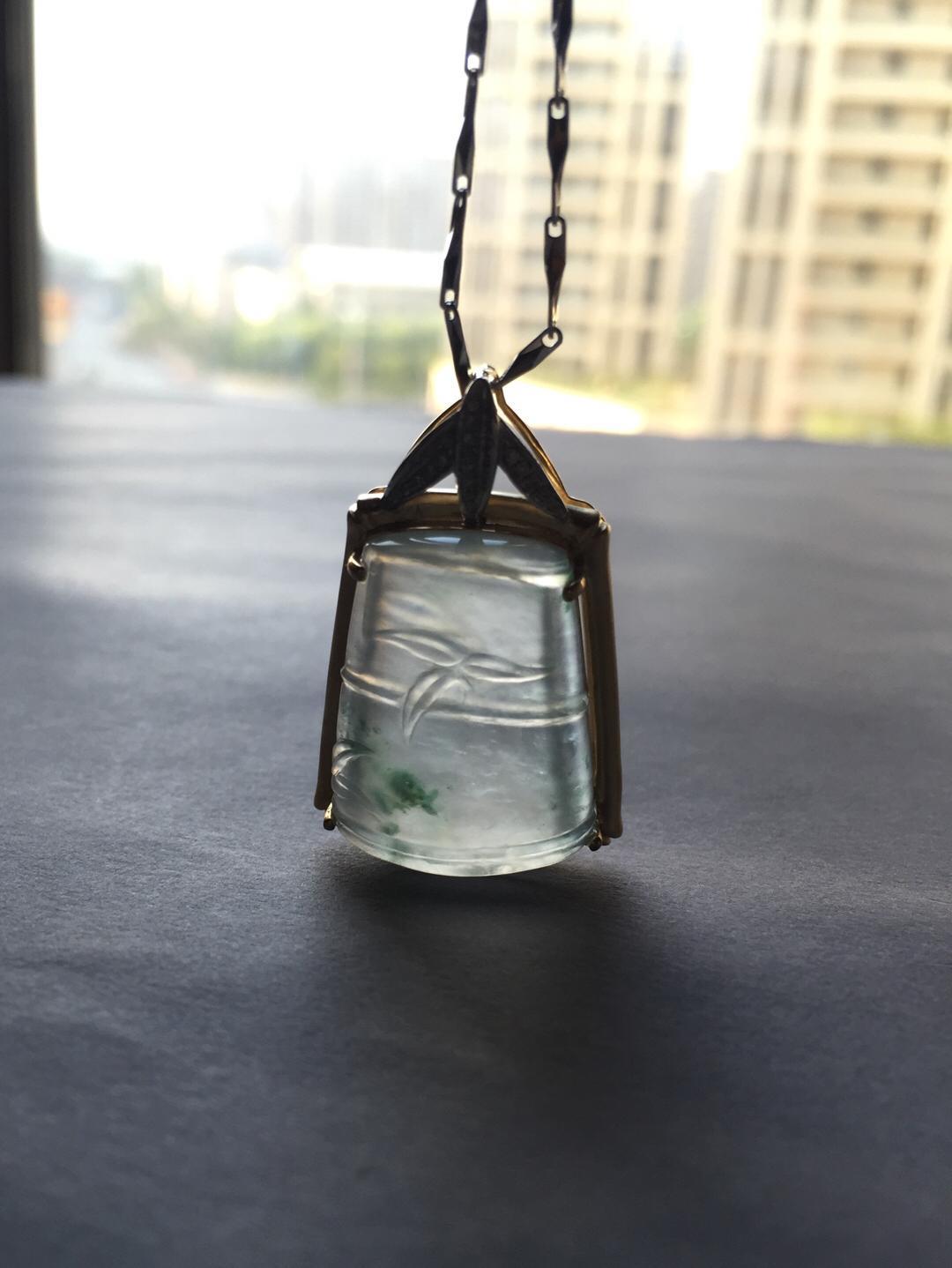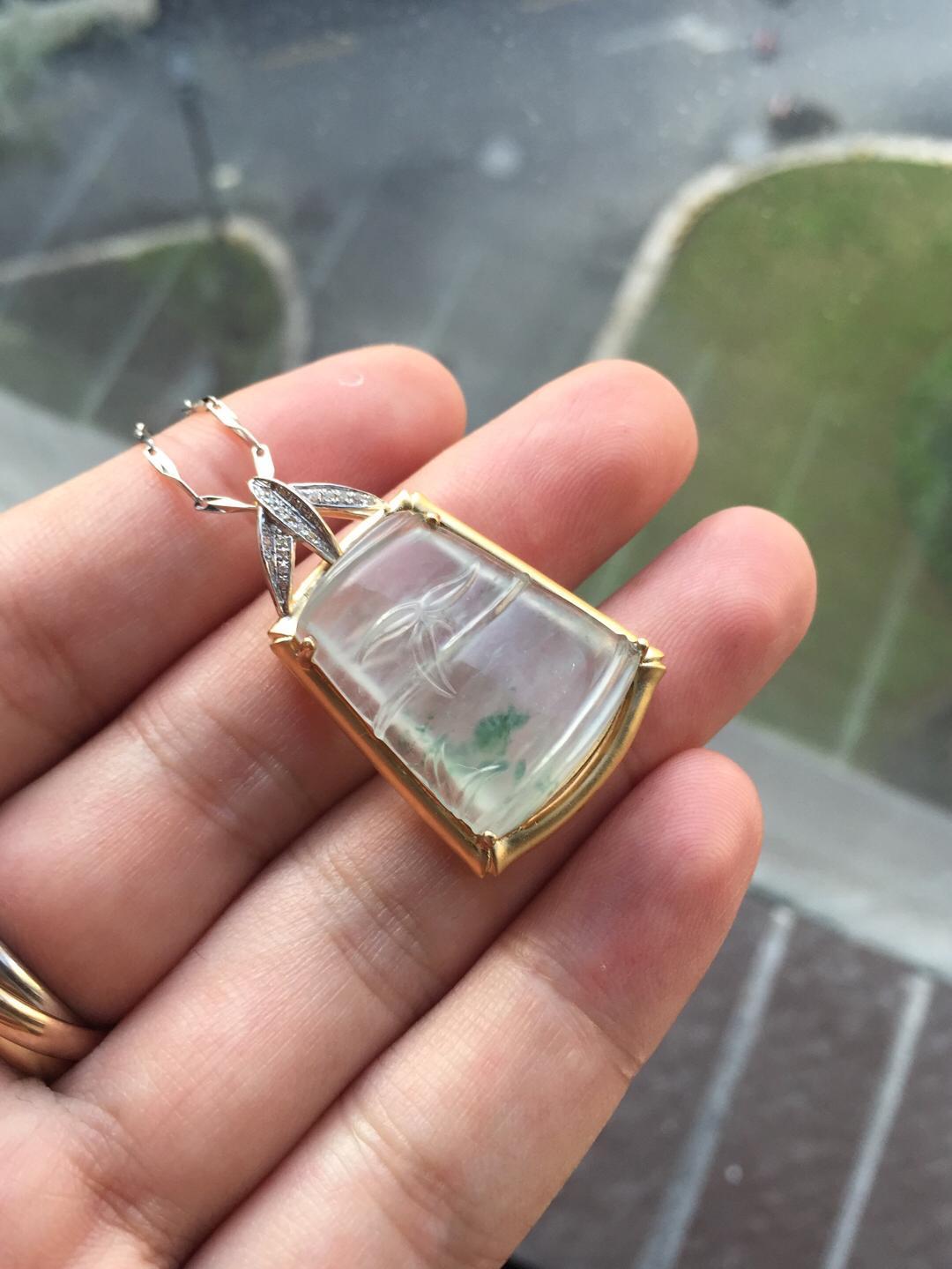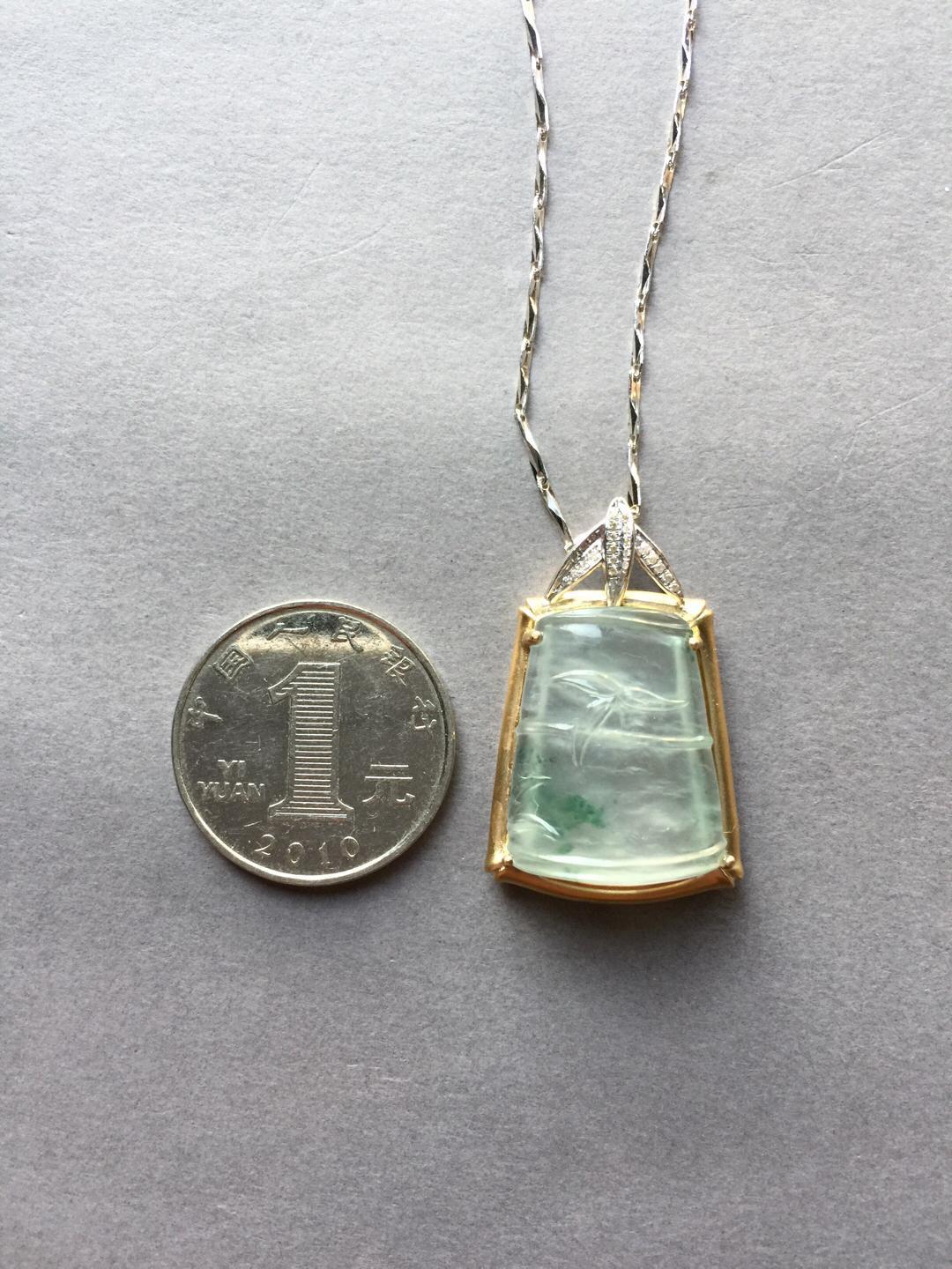 玻璃种翡翠飘花节节高,种水尖货,22.6*18.5*6.5mm,镶嵌后34.5*21.9*10mm,正装尺寸,厚庄,厚实饱满,就像一个糖块一样,一看就是特别的好东西,种气极老,荧光四射,点点飘花灵动洒脱,卓尔不群的镶嵌款式,18k黄金雕琢竹节,18k白金钻石刻画竹叶,简约而不简单的设计更加烘托出竹节高雅的气质。不可多得的一件精品,推荐