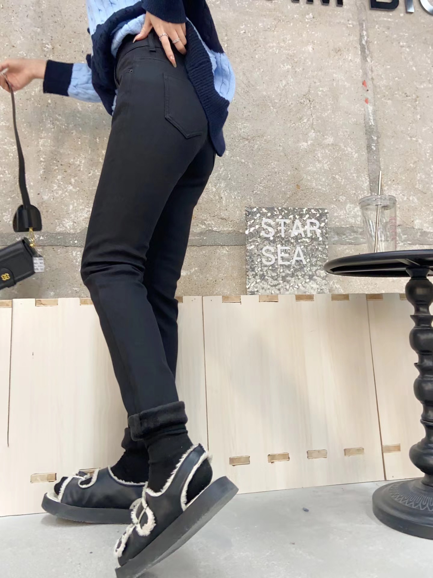 全新秋冬加绒系列,兼具暖与型,秋冬出街不再妥协,加绒裤一样穿出好身材!这个裤型特点就是高腰紧身拥有回弹特性,雕塑线条,并根据亚洲女性腰臀到腿部的曲线剪裁,修饰腿部线条,以高腰设计拉长身影,勾勒出女性曲线!就这裤型,没有一个能不心动的!而且黑色无疑是蕞蕞显瘦的,不是纯黑哈,经过水洗颜色自然!上身效果绝了,修身的裤子也能把你的身材修饰的妥妥的~关于细节~两粒扣高腰,五金铆钉带品牌logo,底钉刻有logo!后腰精典棕色皮标,主打细节,高品没错了!两侧口袋也很实用,日常通勤等等各种场合都很OK,轻松打造好身材。棉混纺材质,紧实弹力 ,上身可以收肉肉那种,舒服又显瘦!内里加绒, 蓄热抗寒,绒不是那种很厚的,但是又软又紧致细腻,不会臃肿还有保暖效果~不管是裤型还是裤长都很好,穿上比例很好,很利落!