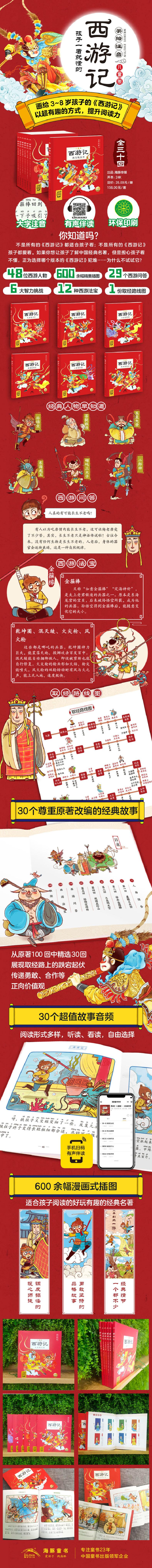《西游记》(儿童版)作为专门为3-8岁孩子量身打造的注音版名著启蒙读物,旨在为孩子打开经典学习之门,让孩子摆脱对文学巨著的畏难情绪,轻轻松松爱上名著。全书从原著100回中选取家喻户晓的30回情节,根据3-8岁儿童的阅读水平和思维特点进行合理改编,去除血腥、暴力情节,专注传递正向精神,帮助孩子轻松养成勇敢、协作、坚持等优秀品质;600多张漫画式插图,浓郁的中国韵味加上夸张的表情、搞笑的动作,生动再现跌宕起伏、扣人心弦的情节,给孩子留下名著并不枯燥、晦涩的良好印象;每册文前人物预告、文后“西游问答”“西游法宝”“取经路线图”版块,帮助孩子厘清故事脉络,积累西游知识点;随书附赠30个故事的音频,搞怪的角色配音,带你认识不一样的唐僧师徒。孩子模仿语调,不知不觉提升语言表达能力,故事听着听着就会讲啦!