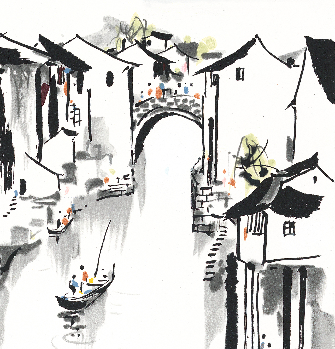 点线面是吴冠中绘画的特点,用线条勾勒形体边缘,不同大小的面表现墙体和屋顶以及水面,用点来表现南方建筑的小窗户,通过不同的点线面组合使画面充满了灵动绘画性与写意性。