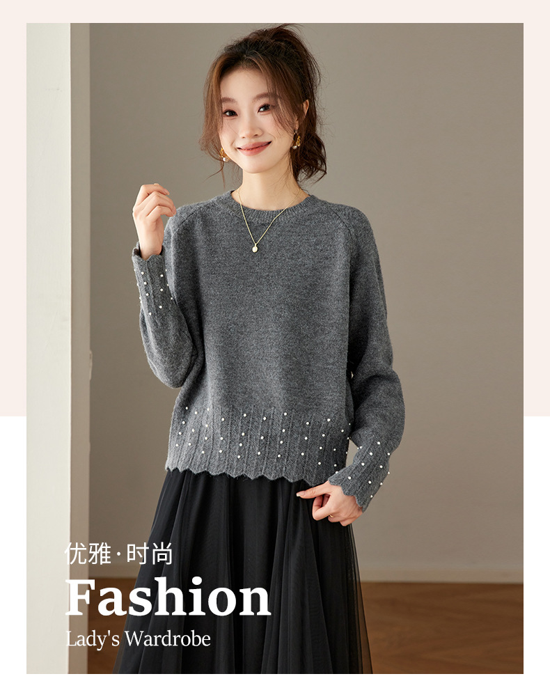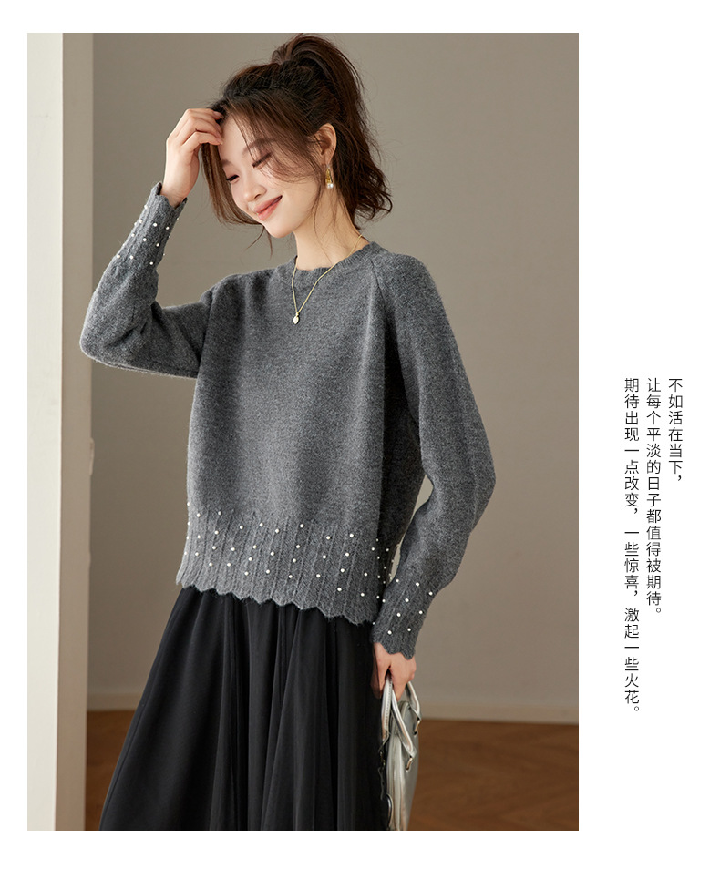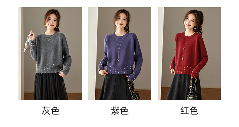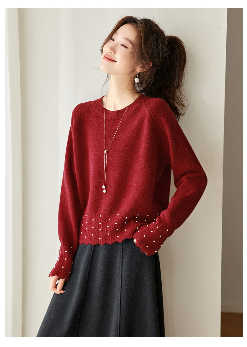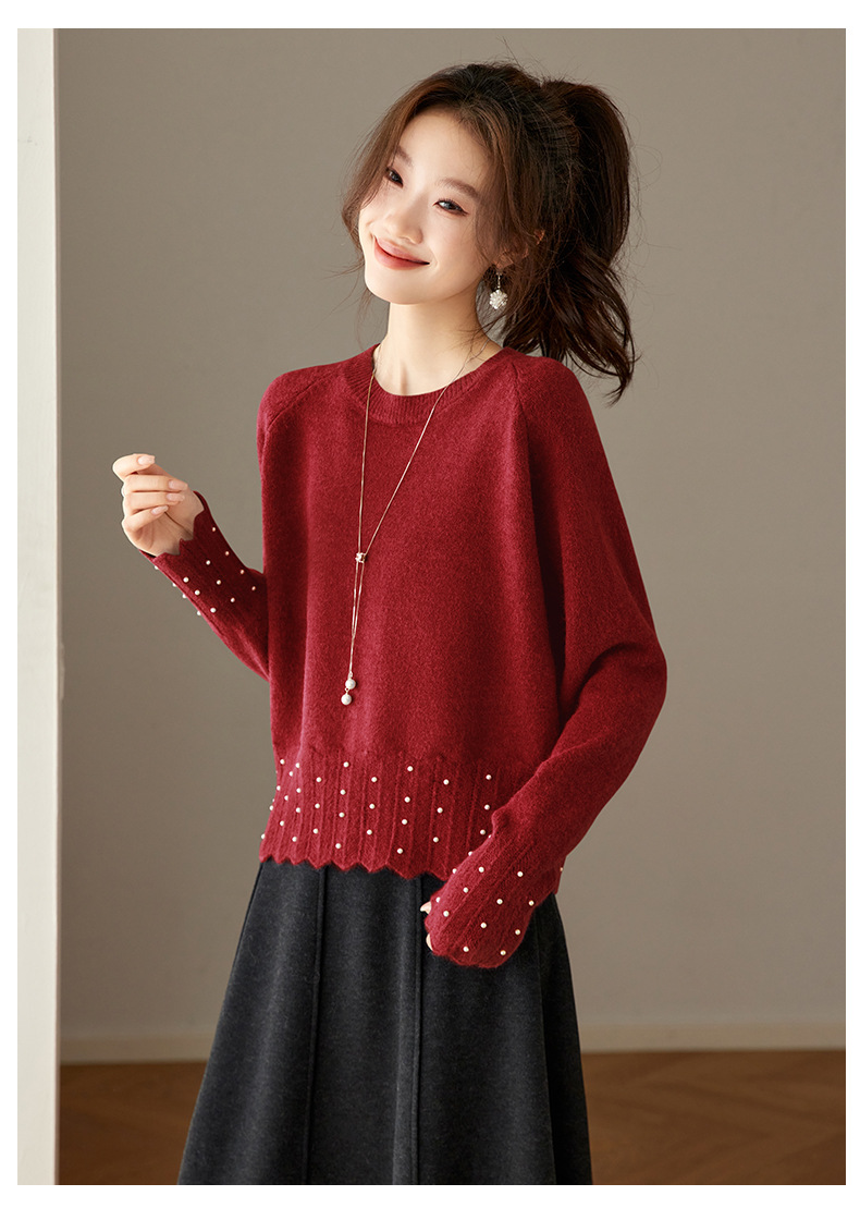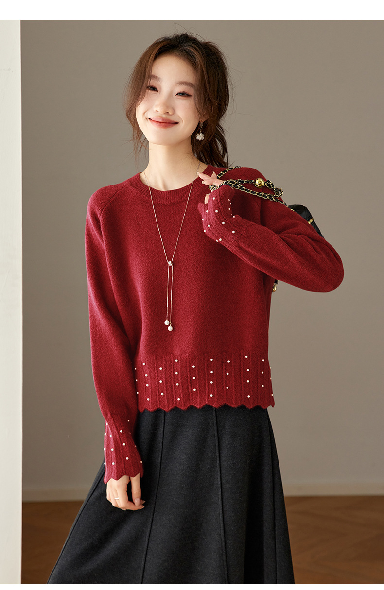 CC红色本命年圆领针织衫女秋冬高级感厚款慵懒宽松毛衣内搭打底上衣