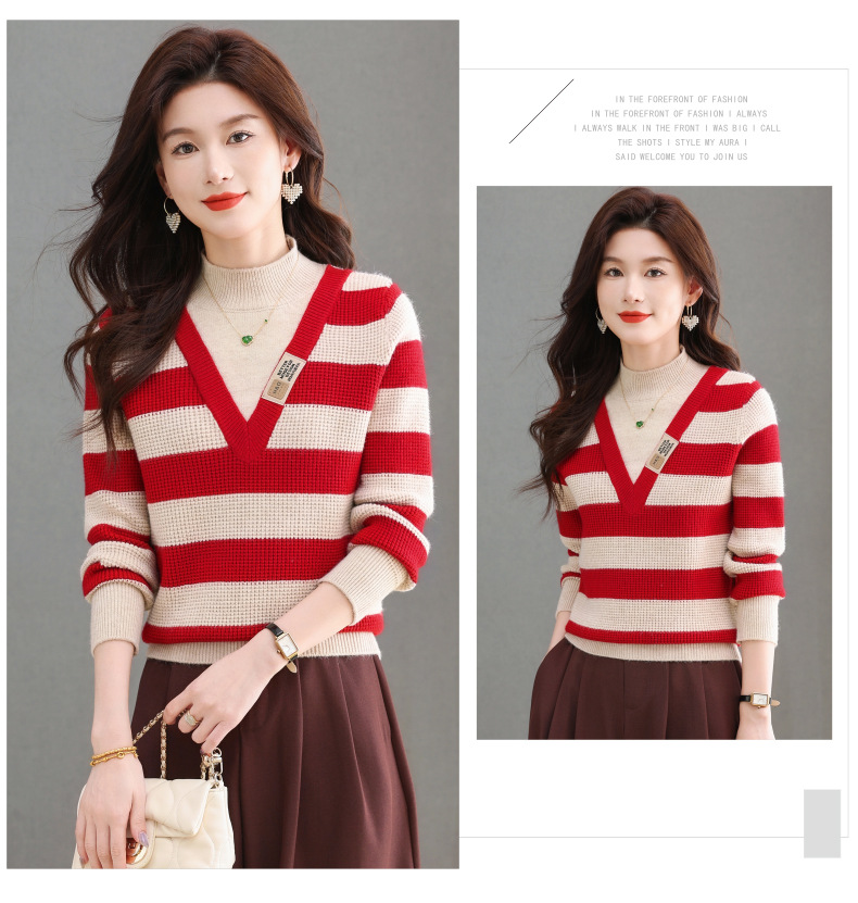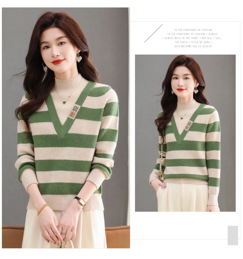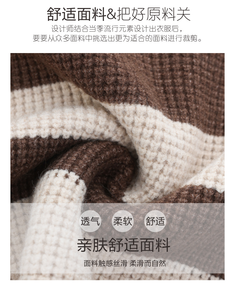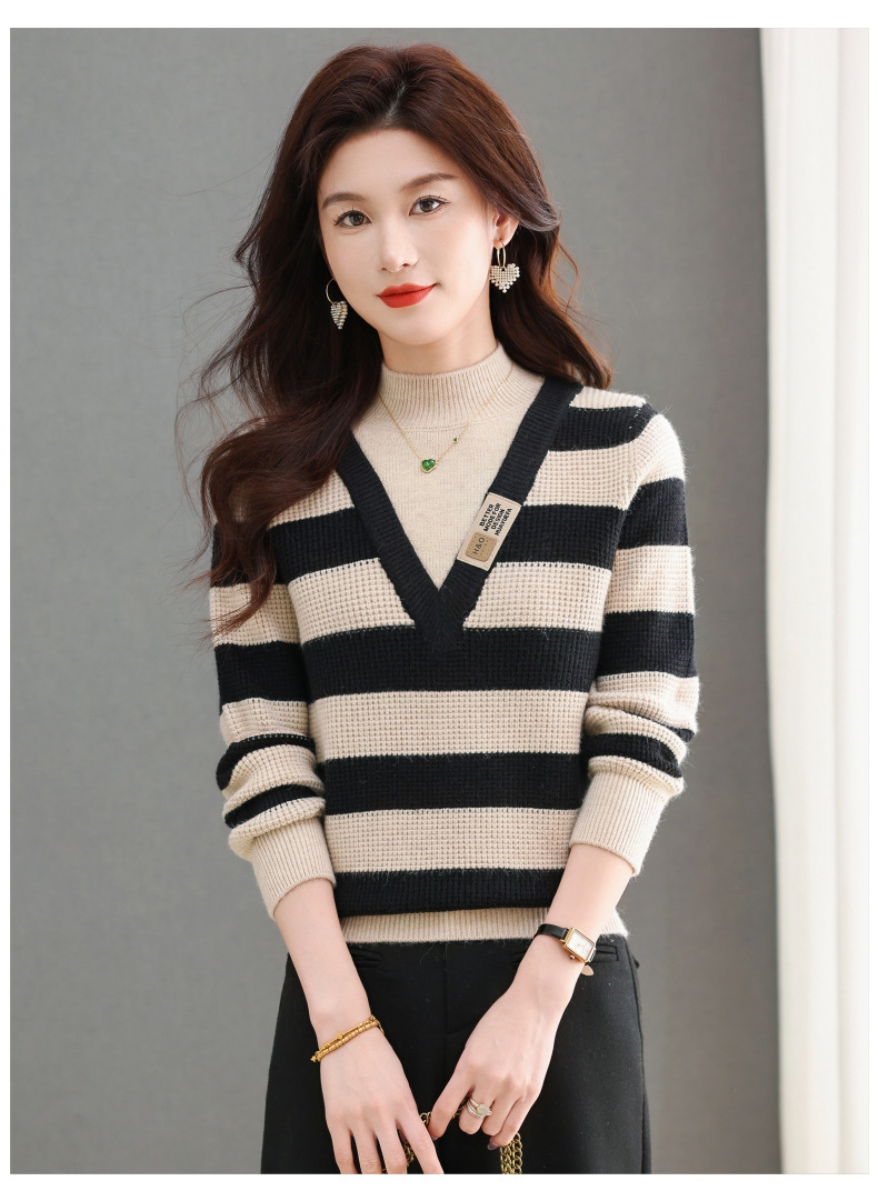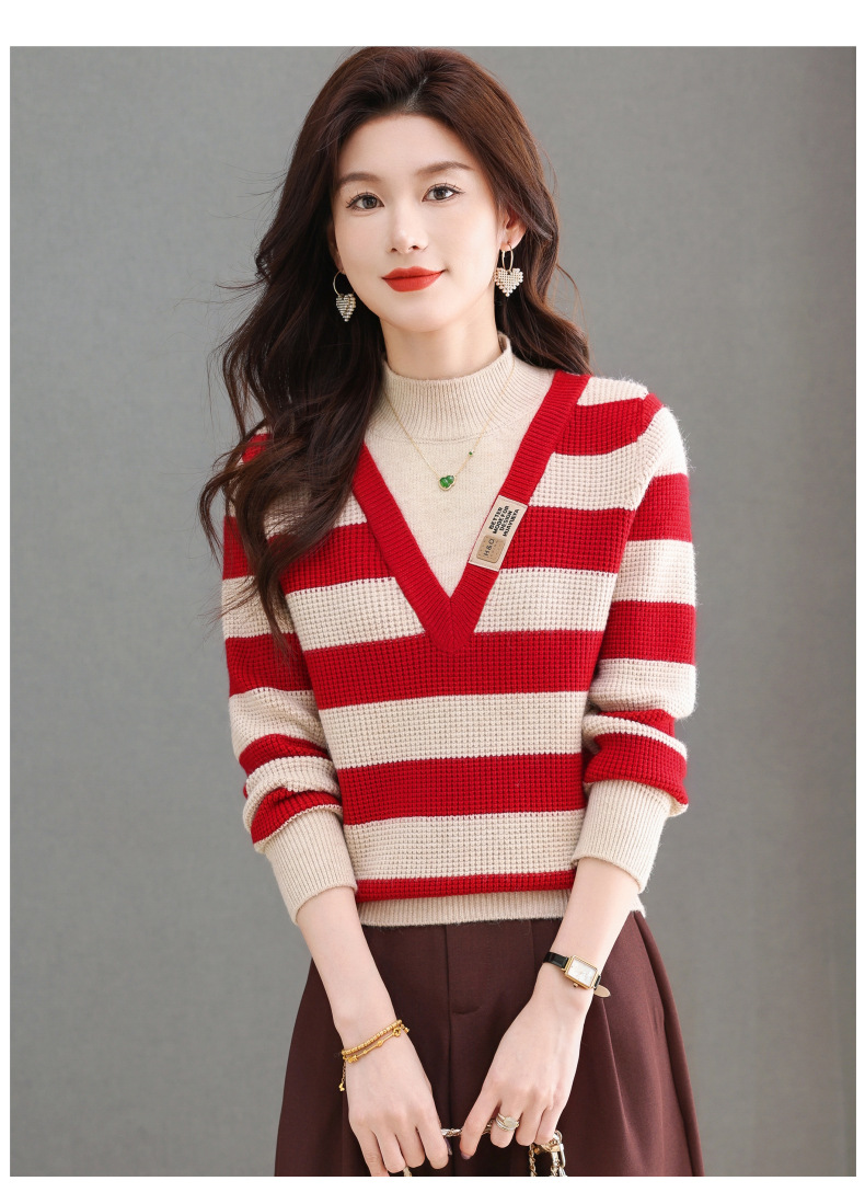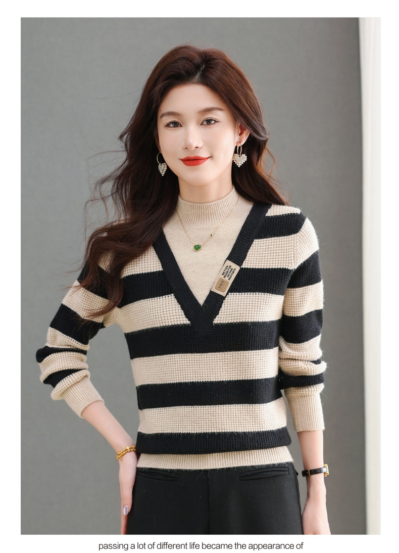 CC-tbrk-X1810条纹半高领打底衫毛衣2024秋冬新款套头厚款撞色宽松假两件上衣女