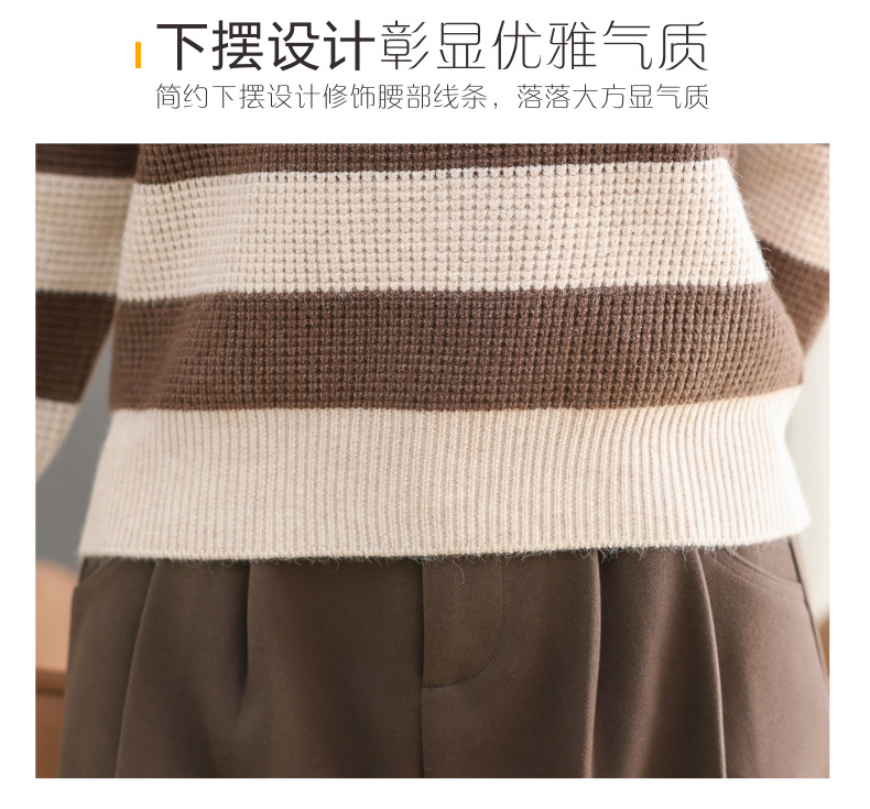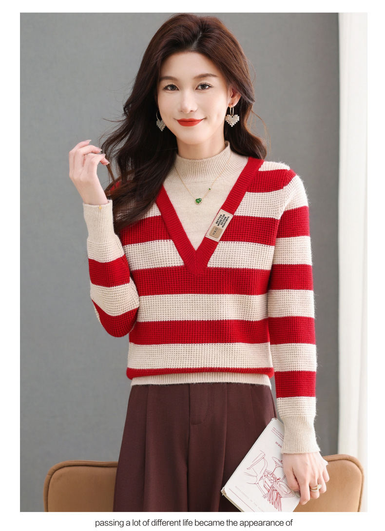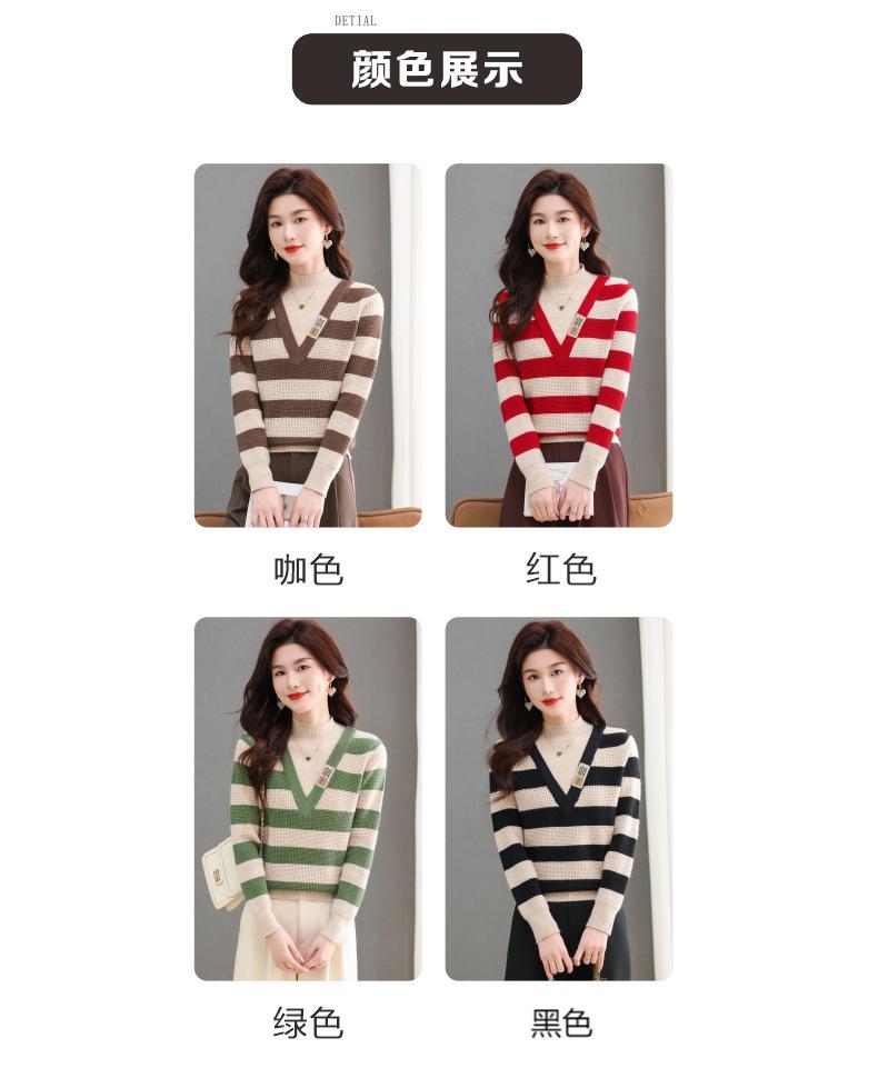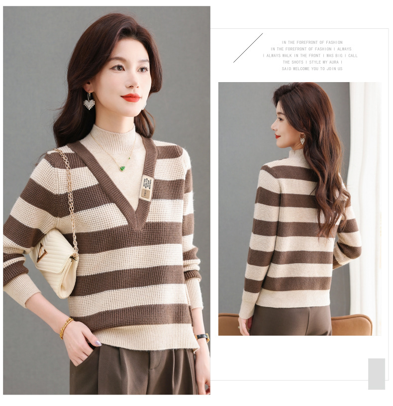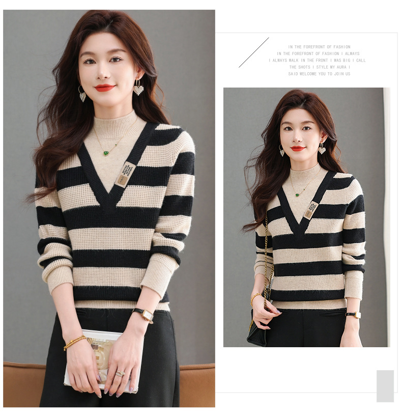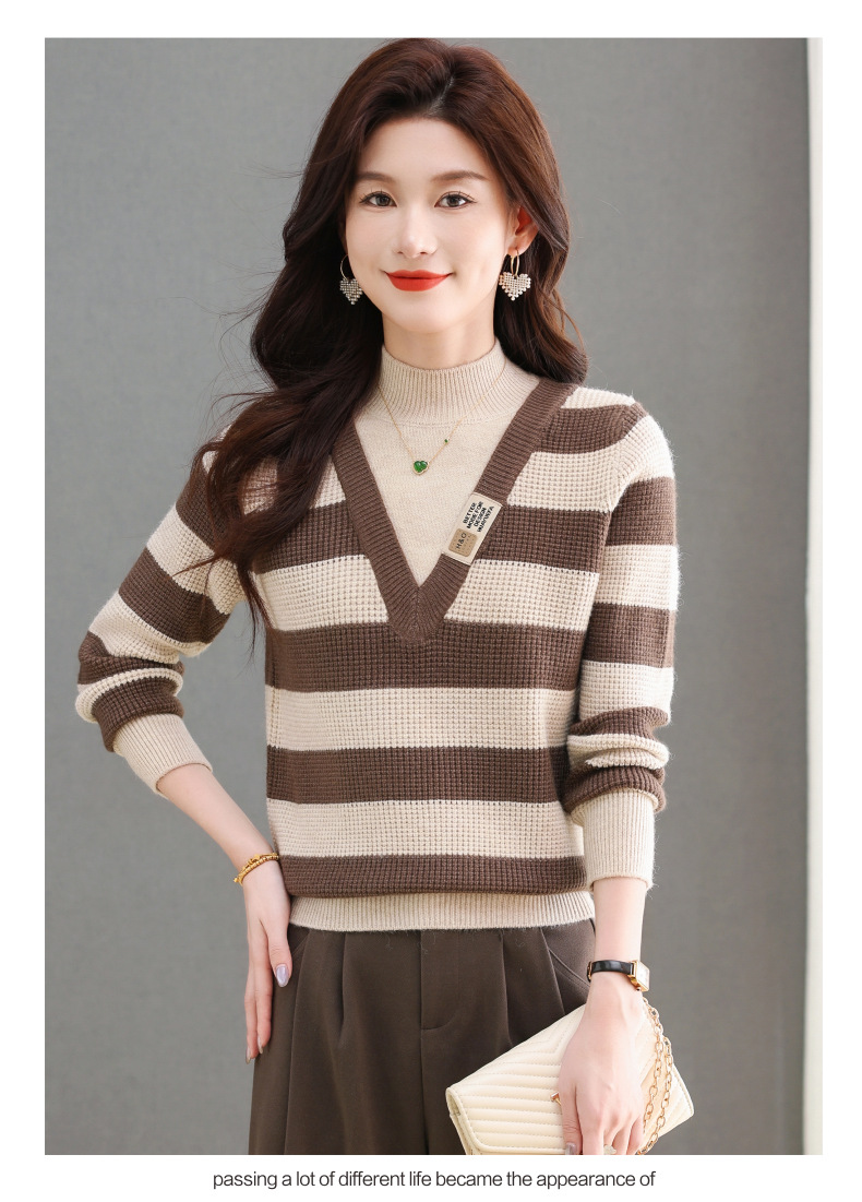 CC-tbrk-X1810条纹半高领打底衫毛衣2024秋冬新款套头厚款撞色宽松假两件上衣女