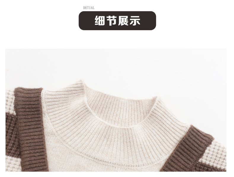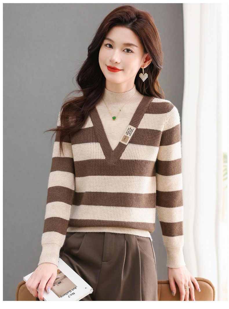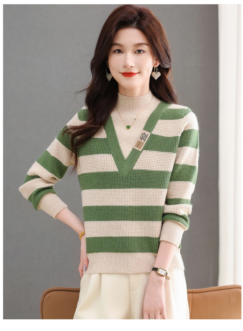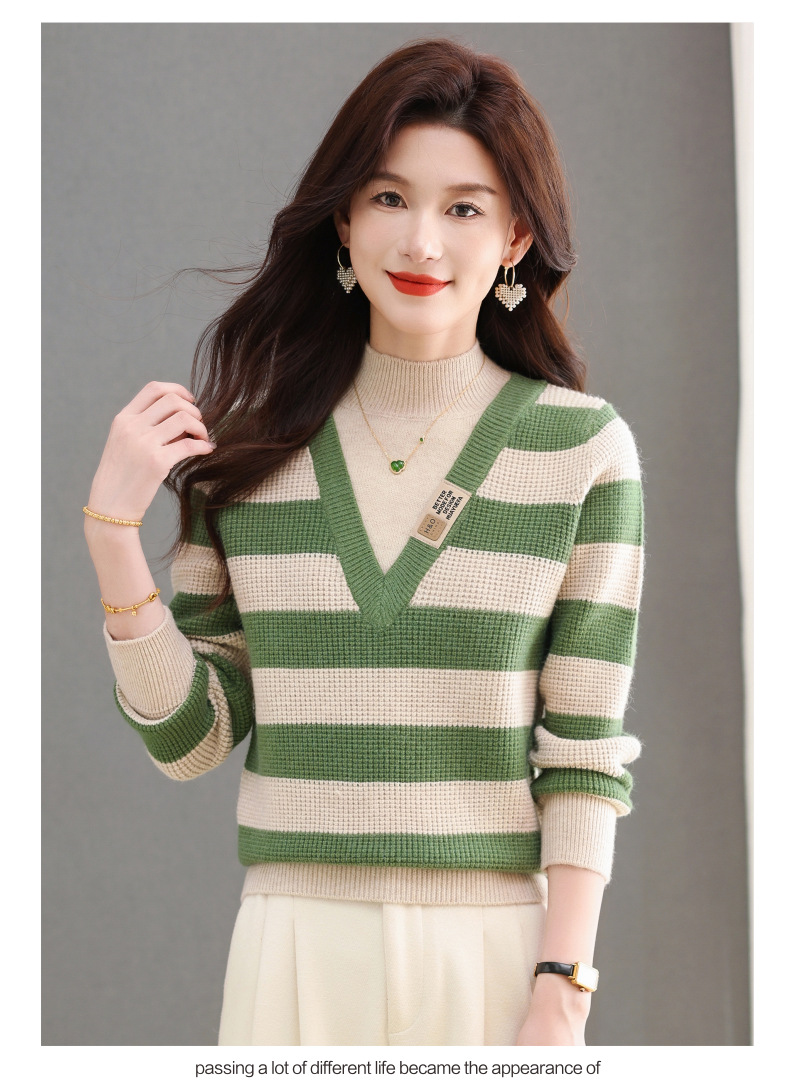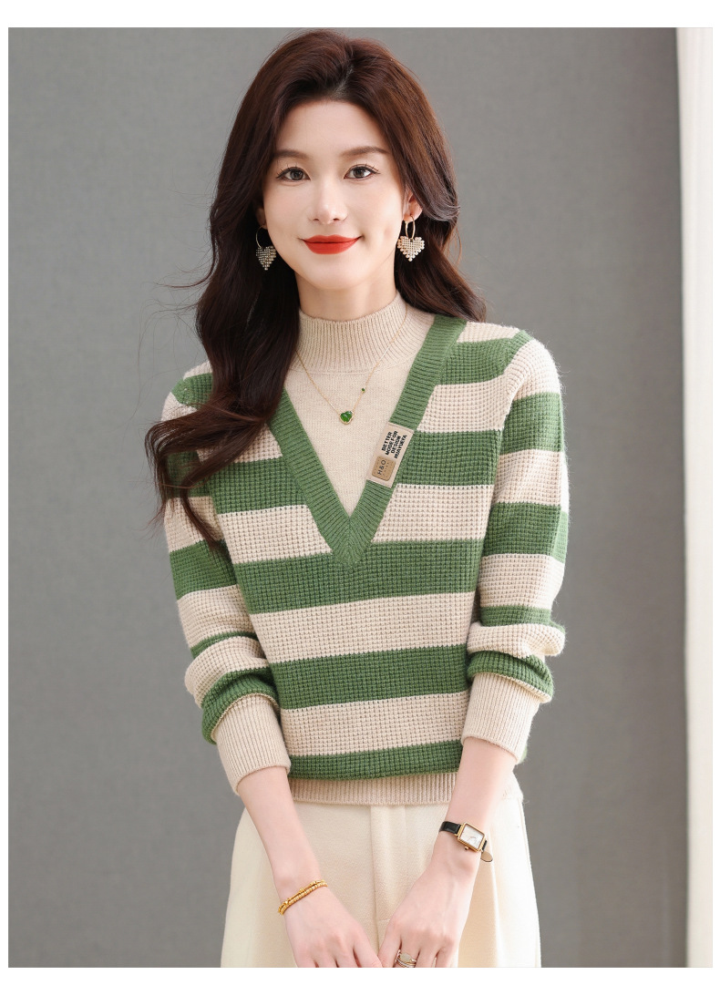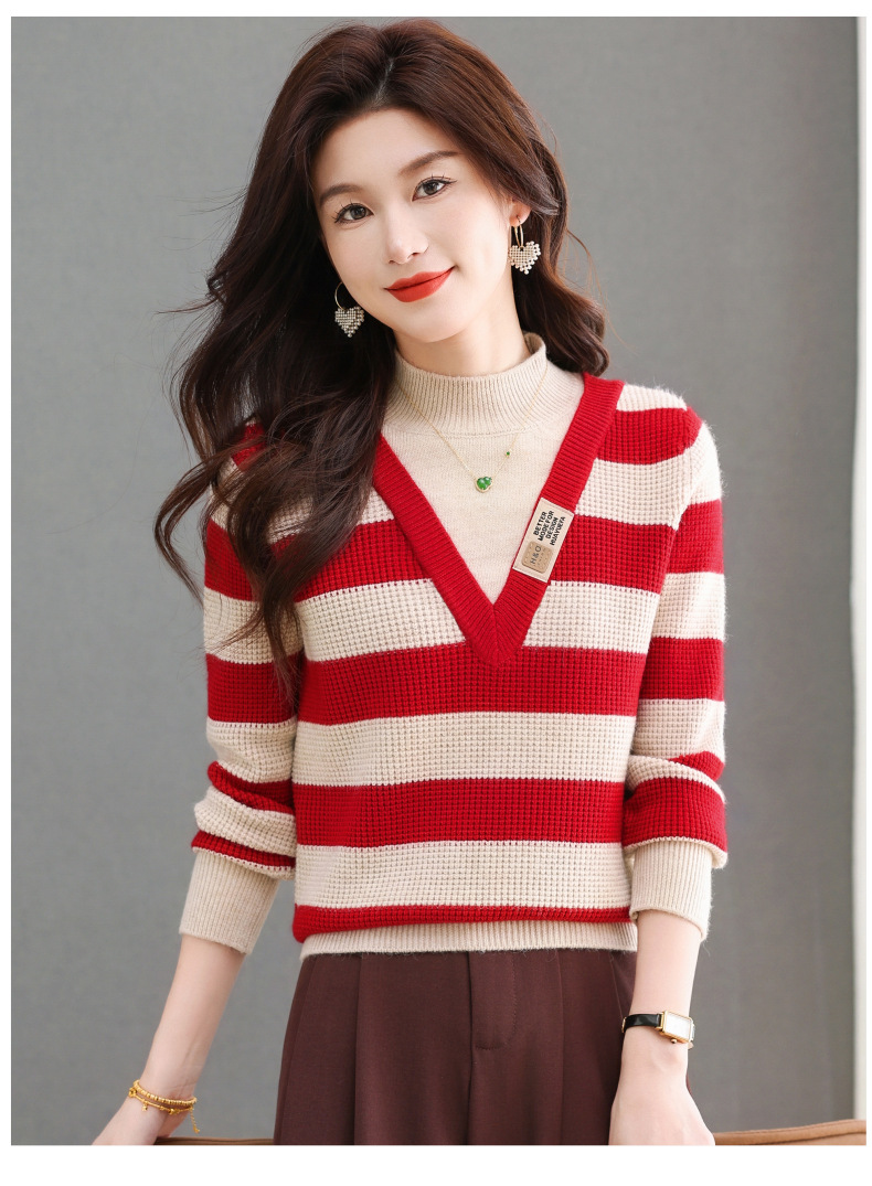CC-tbrk-X1810条纹半高领打底衫毛衣2024秋冬新款套头厚款撞色宽松假两件上衣女