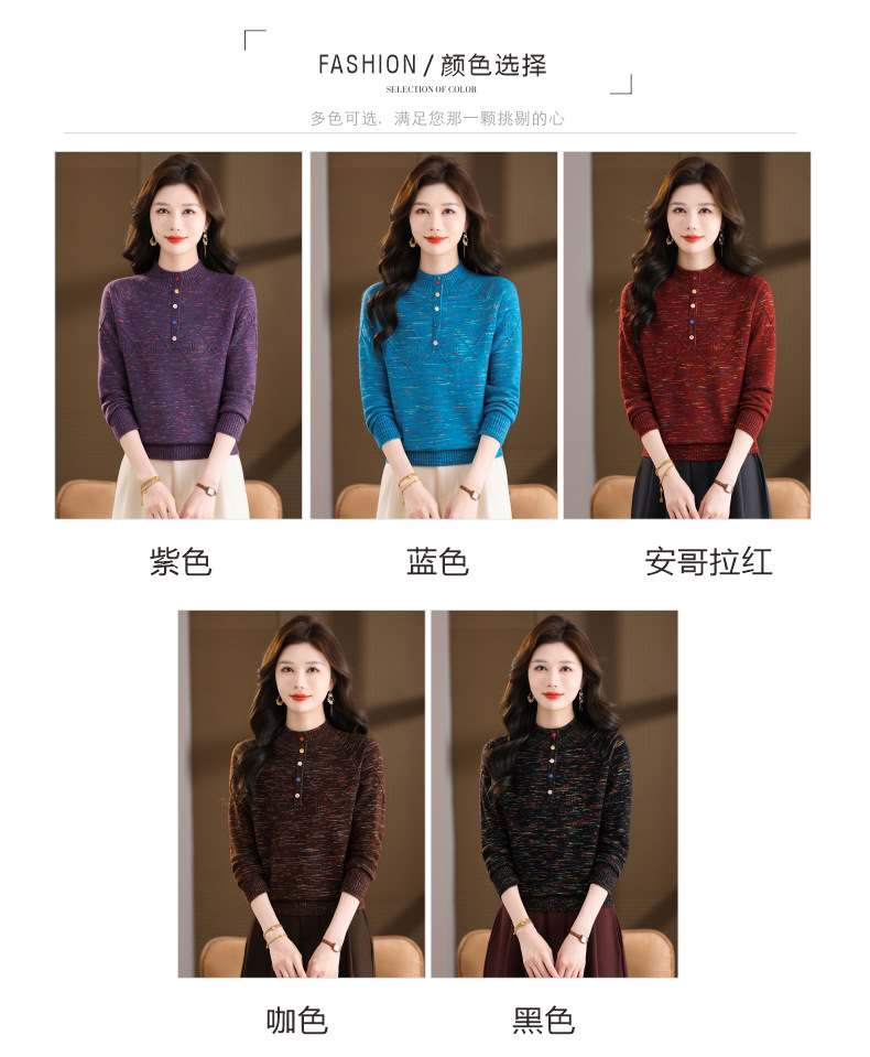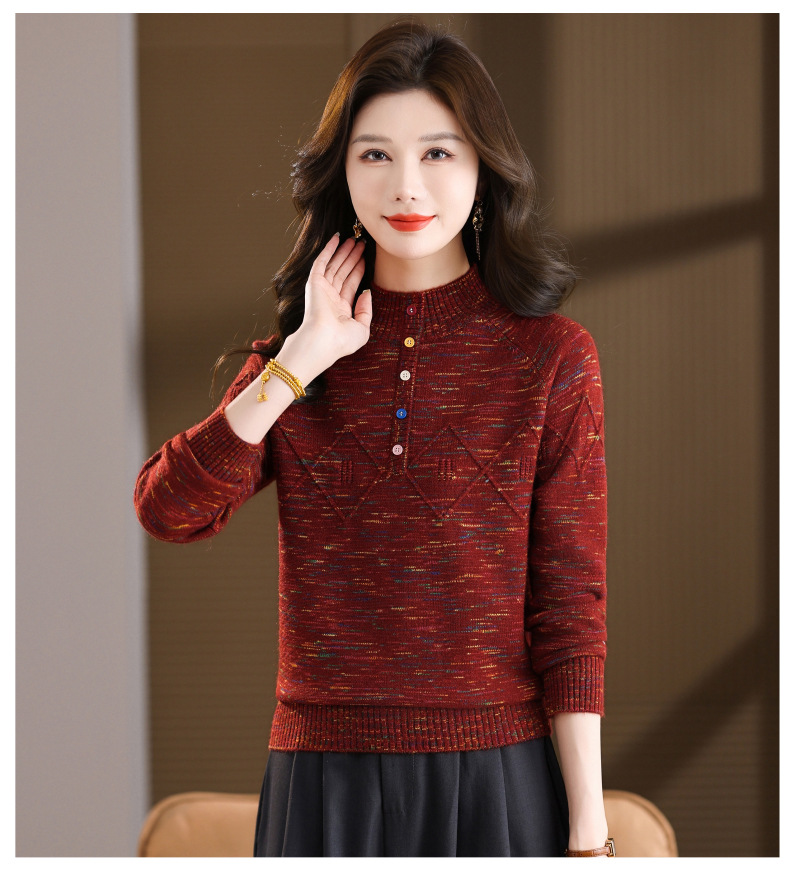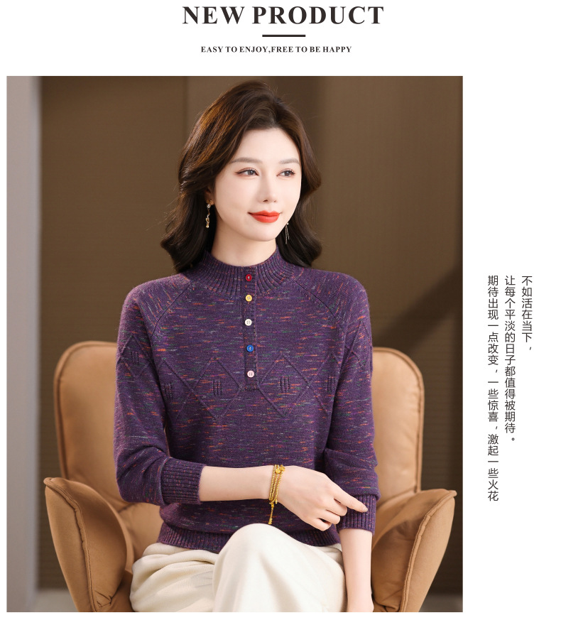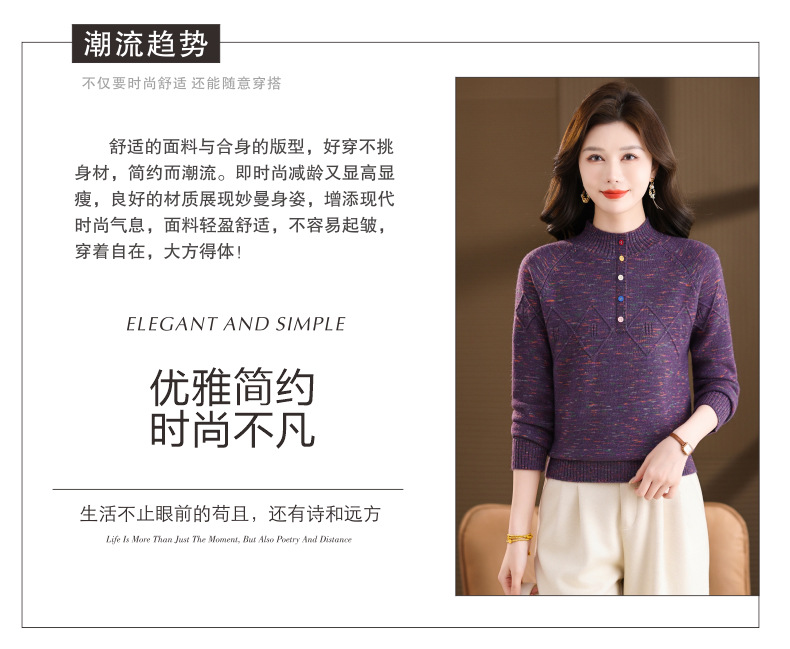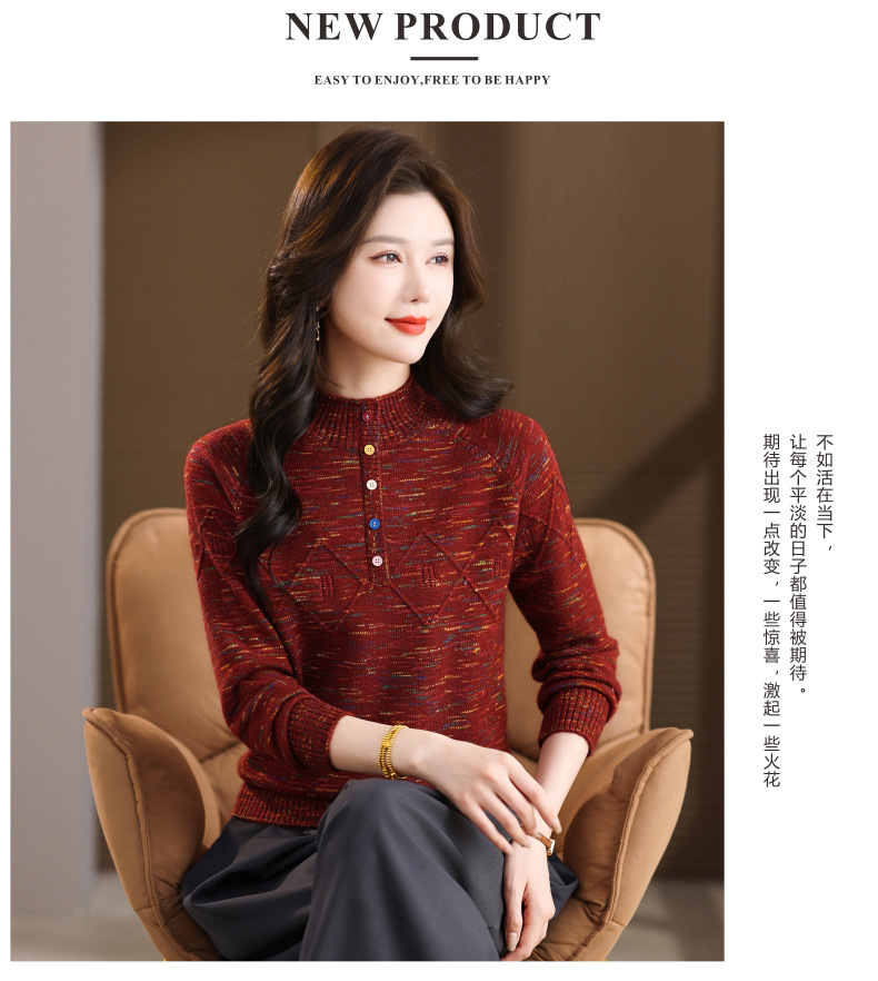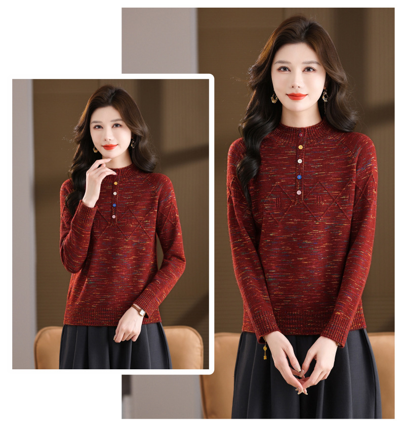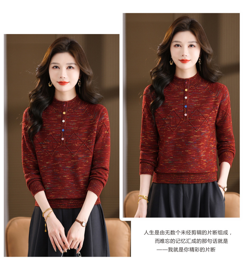 CC撞色彩扣酒红亮丝半高领针织衫女秋冬菱形提花单排扣修身内搭毛衣