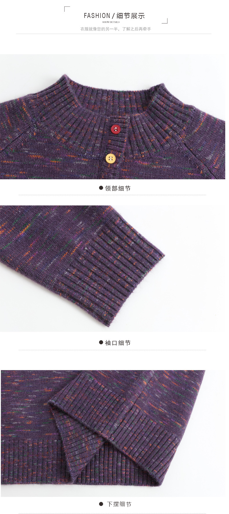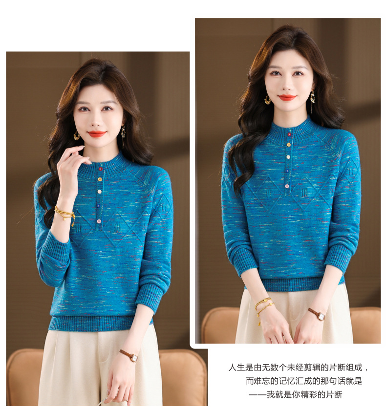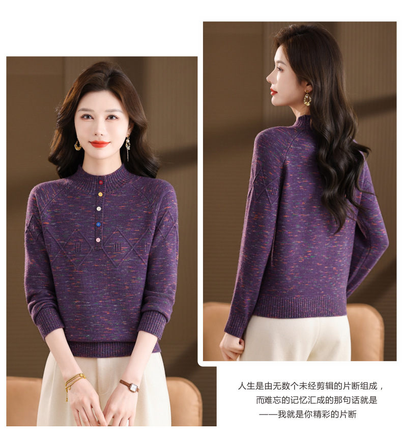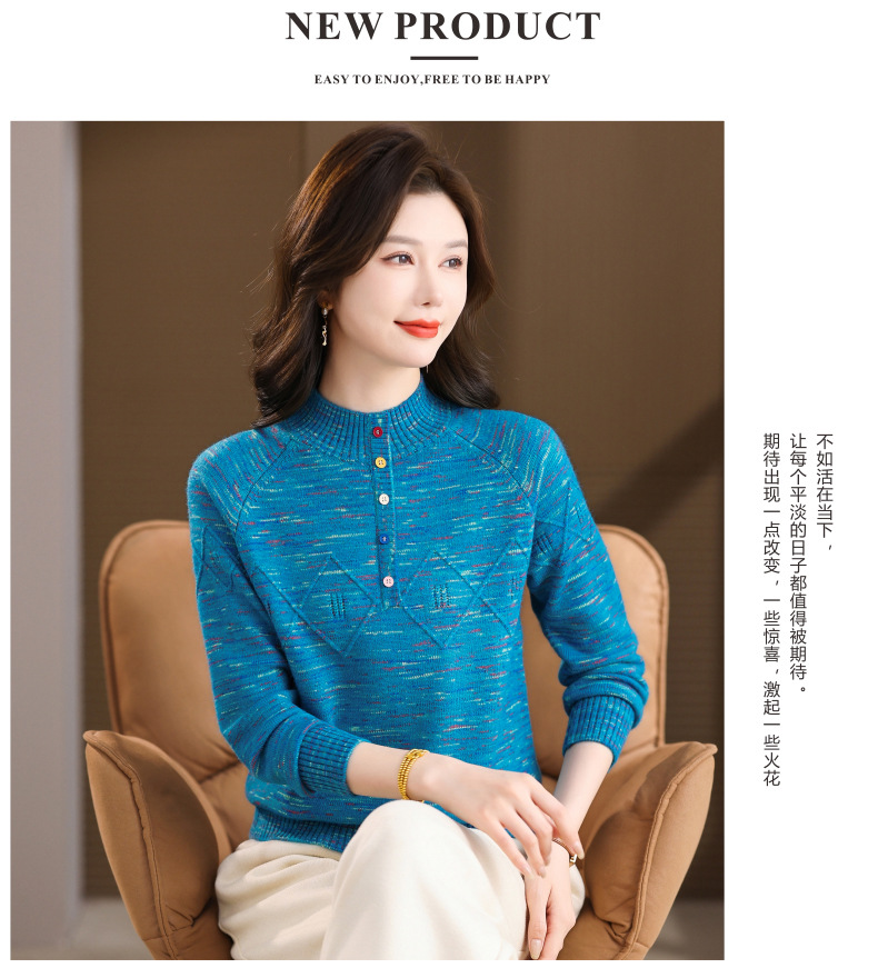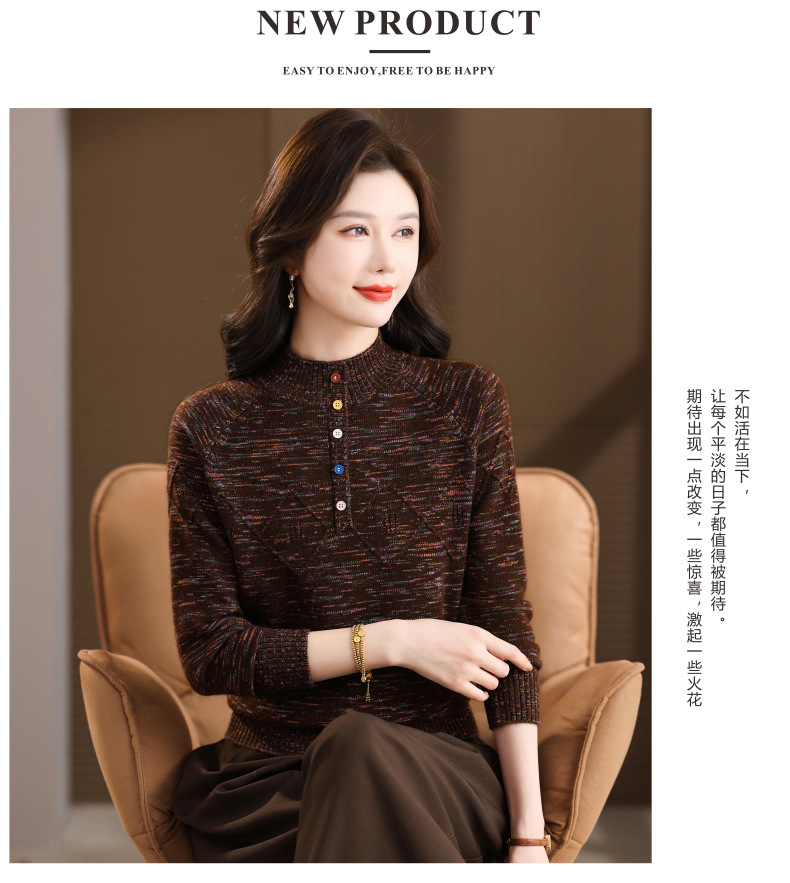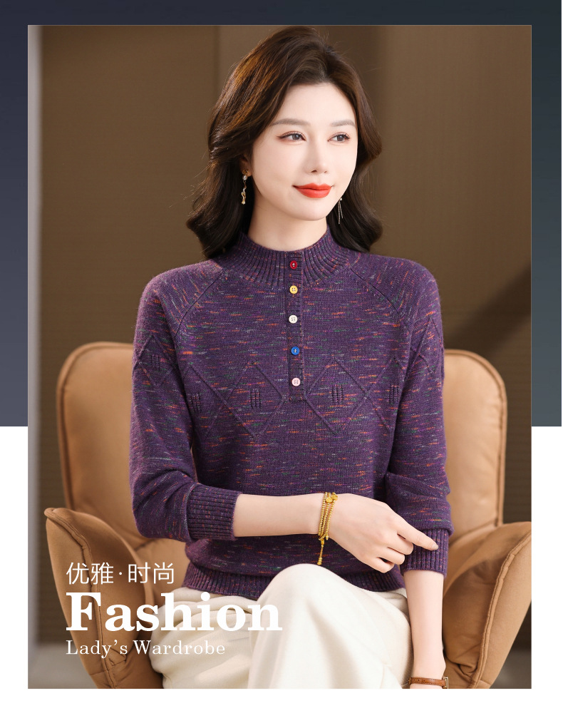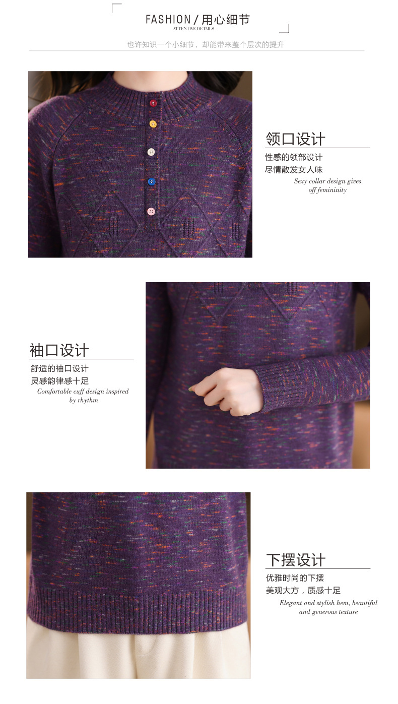 CC撞色彩扣酒红亮丝半高领针织衫女秋冬菱形提花单排扣修身内搭毛衣