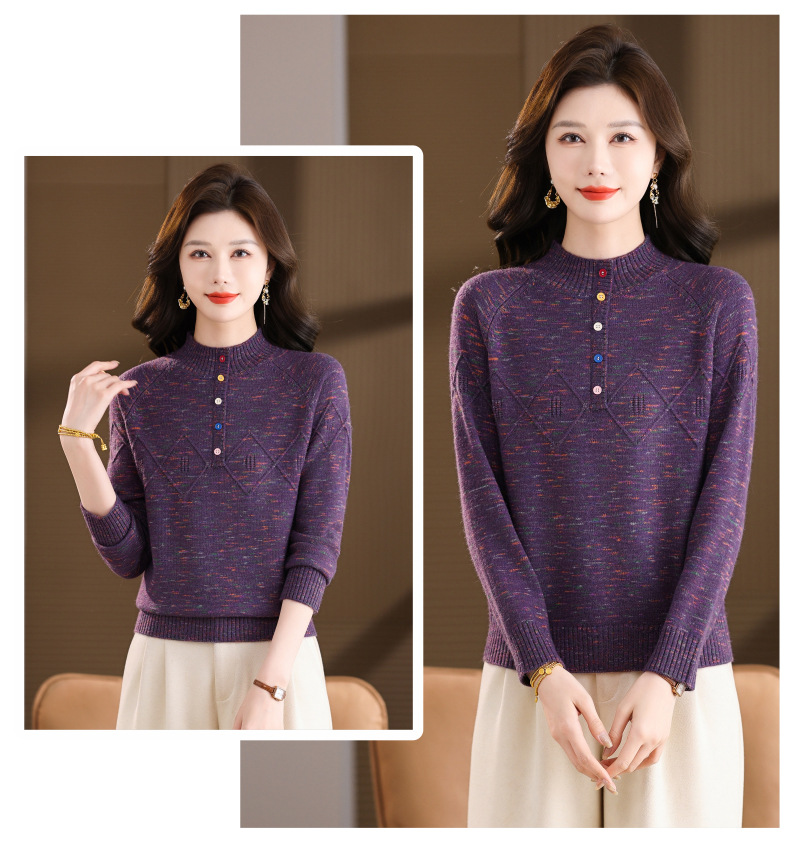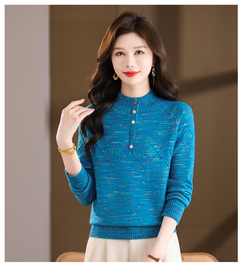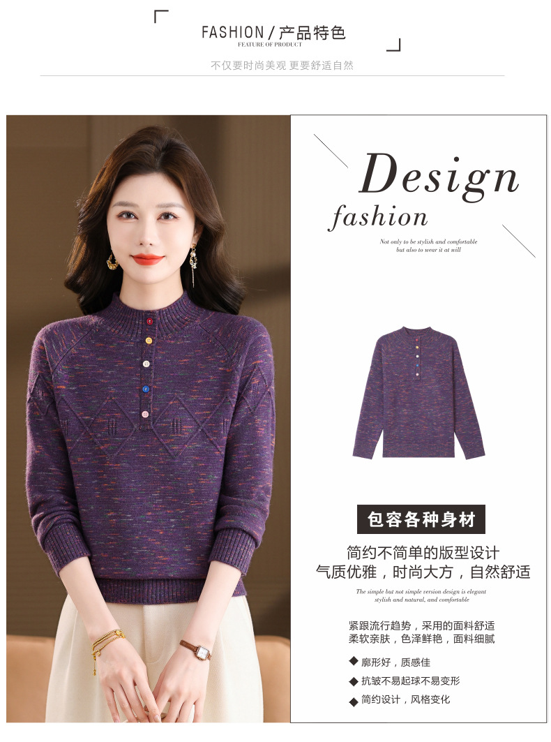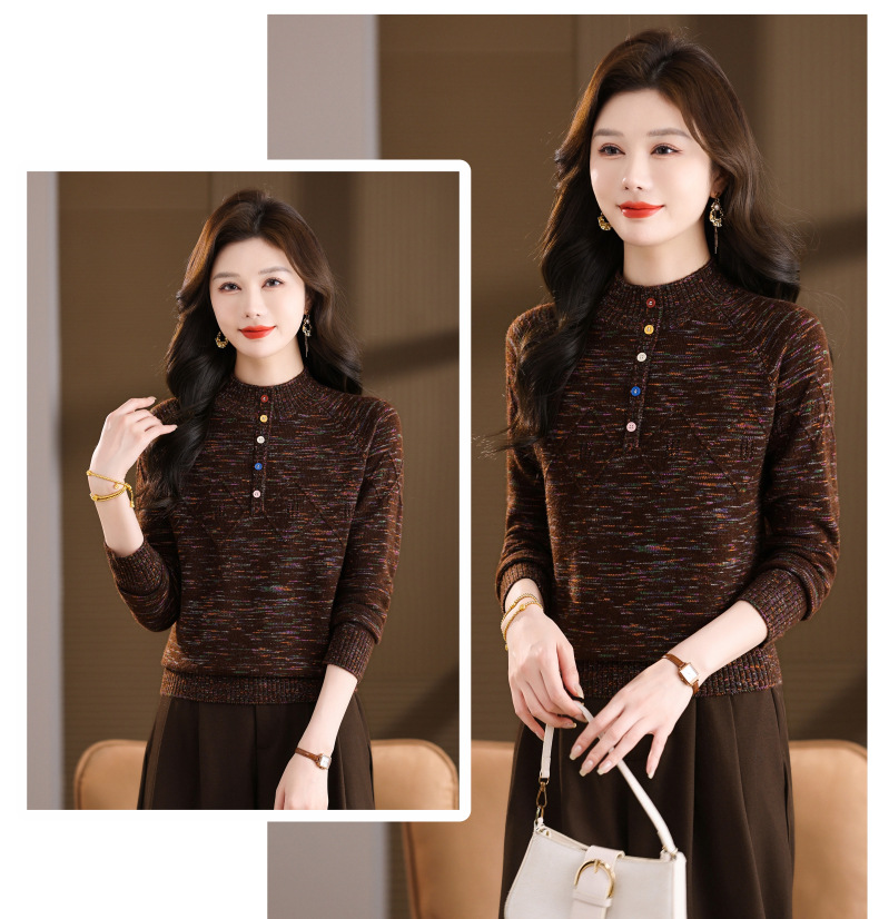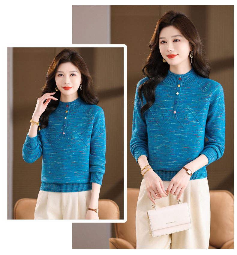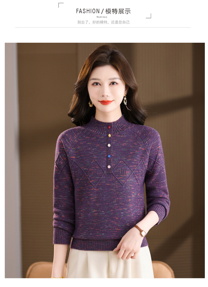 CC撞色彩扣酒红亮丝半高领针织衫女秋冬菱形提花单排扣修身内搭毛衣