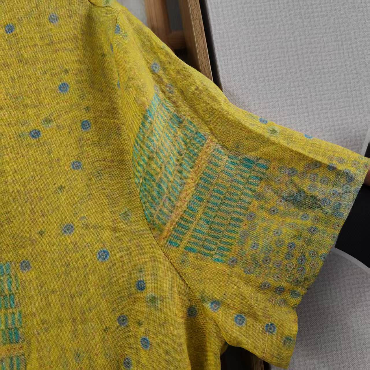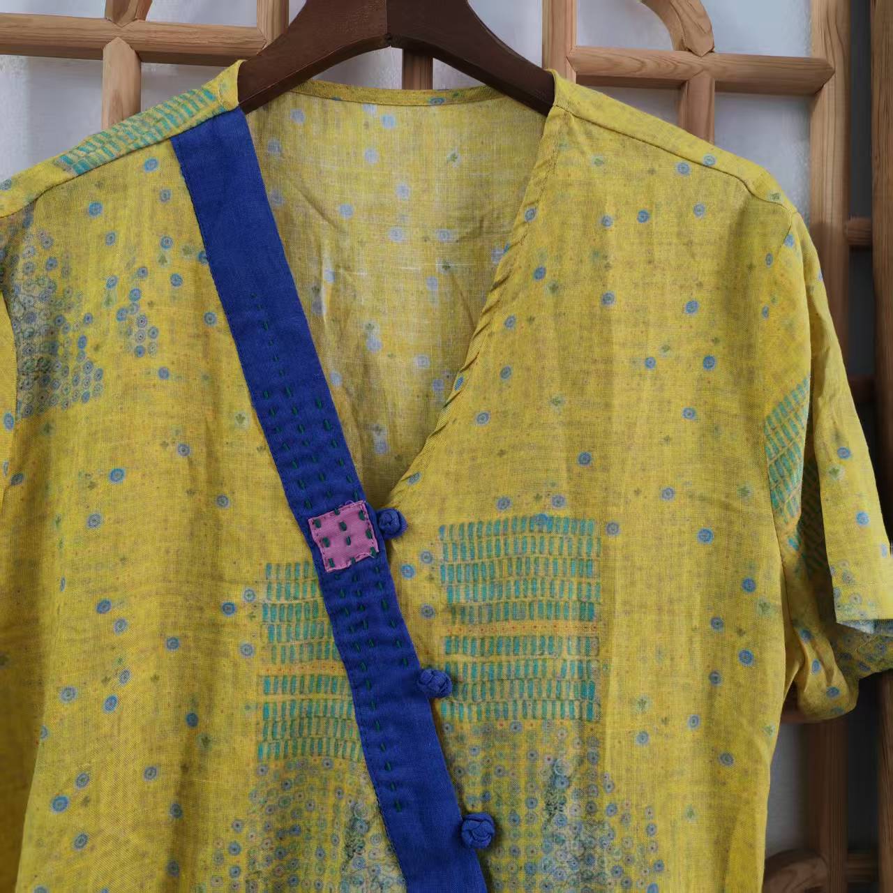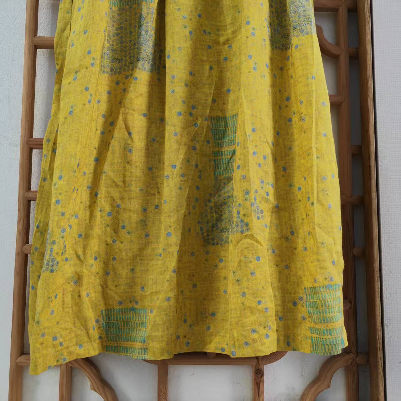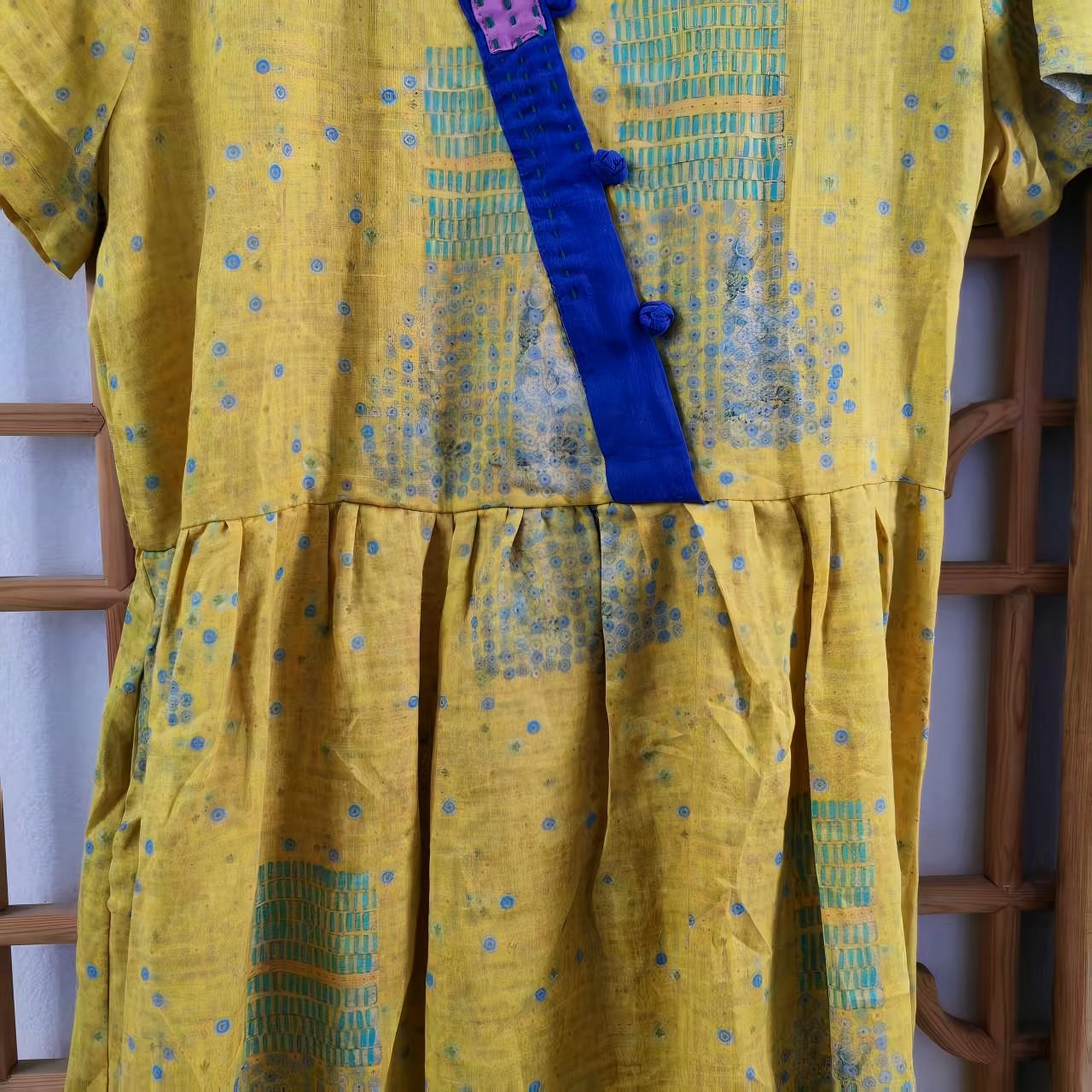 仅一件!XL码 【断码清仓】宽松显瘦文艺复古民族风V领撞色盘扣印花中长款连衣裙ZFYY012
