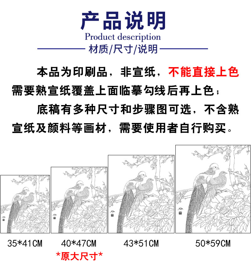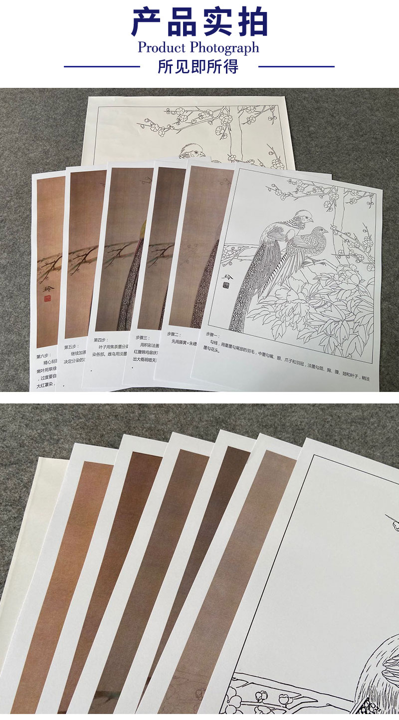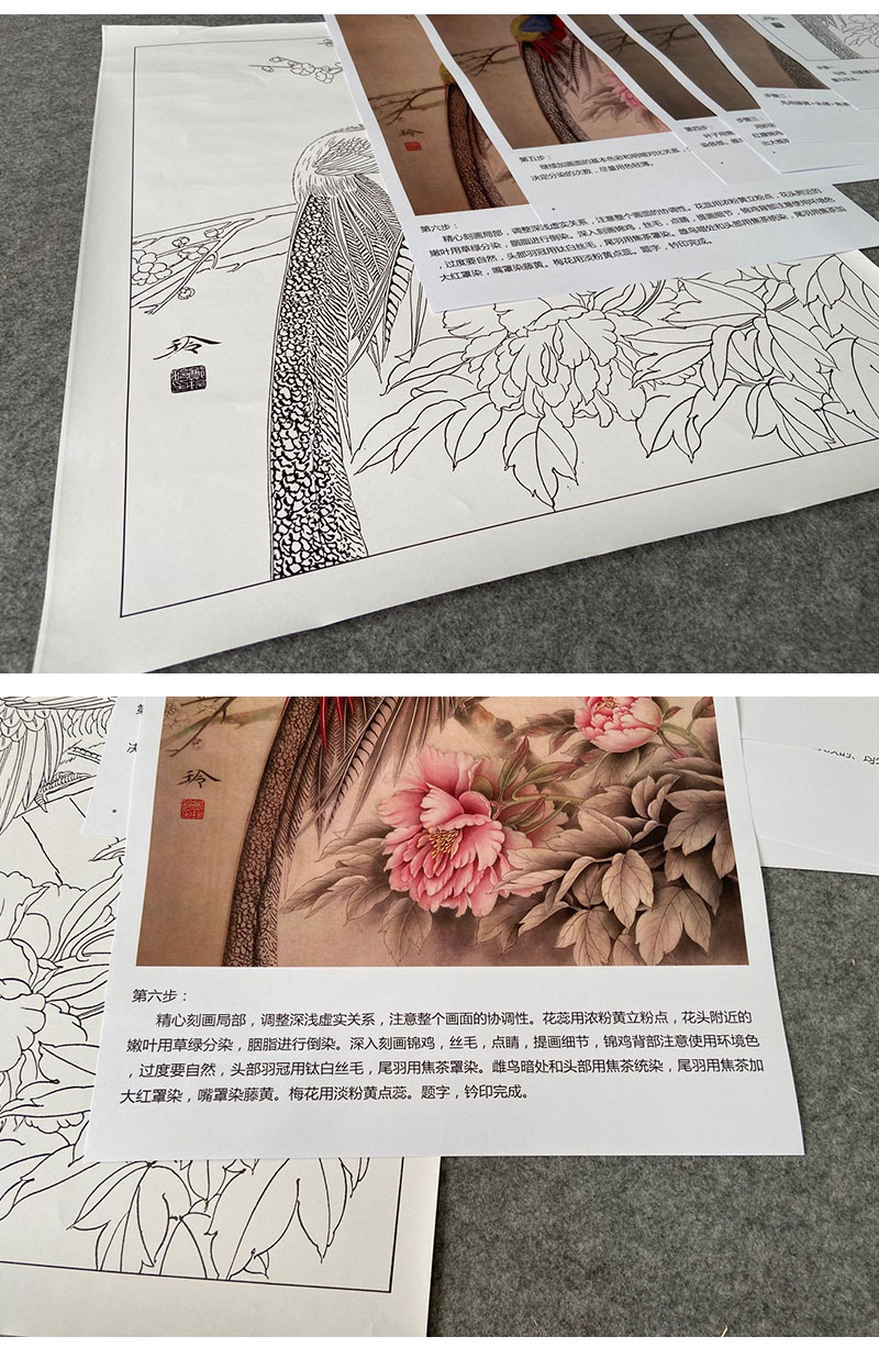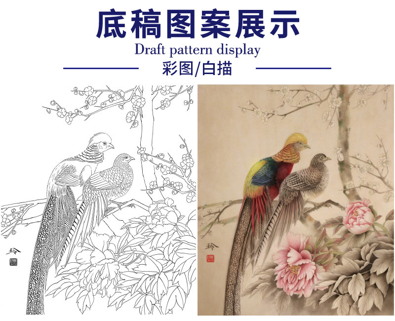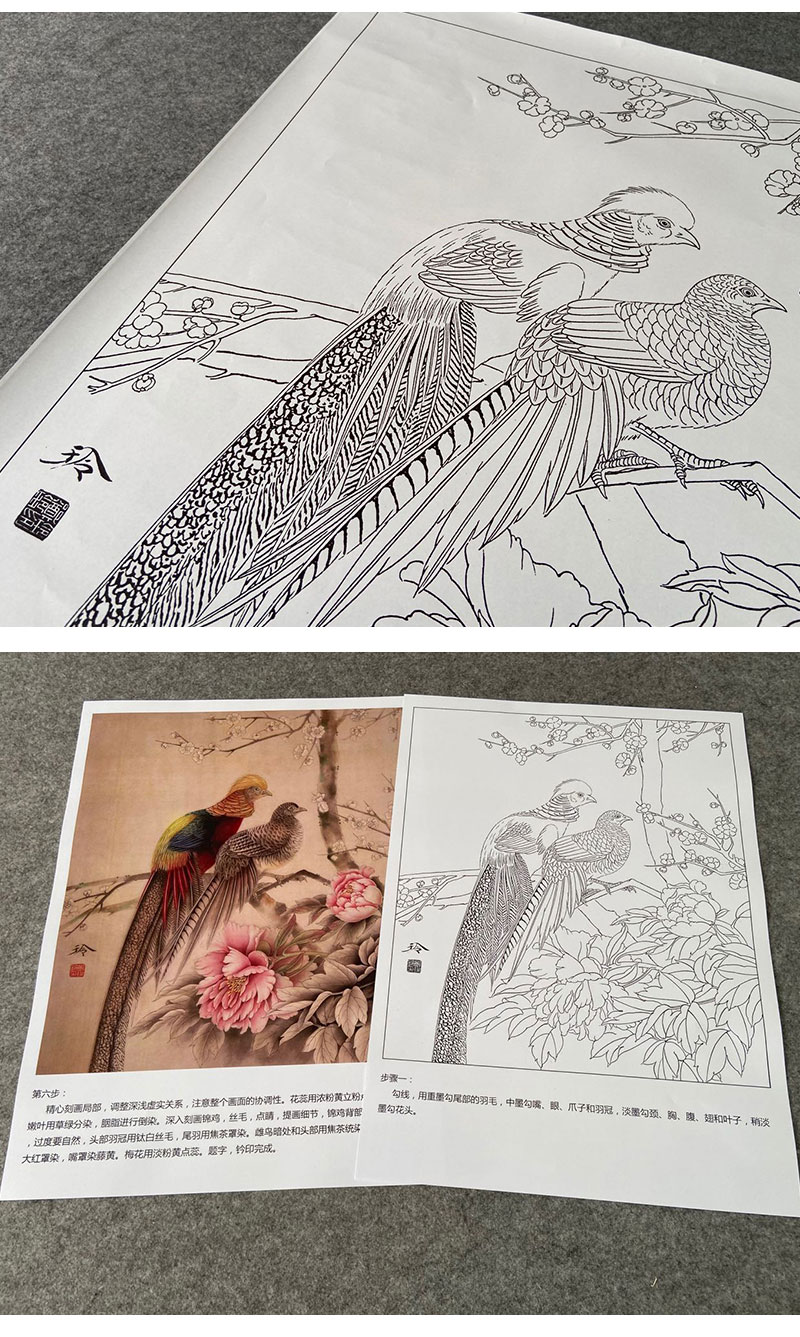 【有步骤、大彩图】郑玲玲工笔画白描底稿《岁月静好》锦鸡图初学者临摹花鸟线稿ZL57