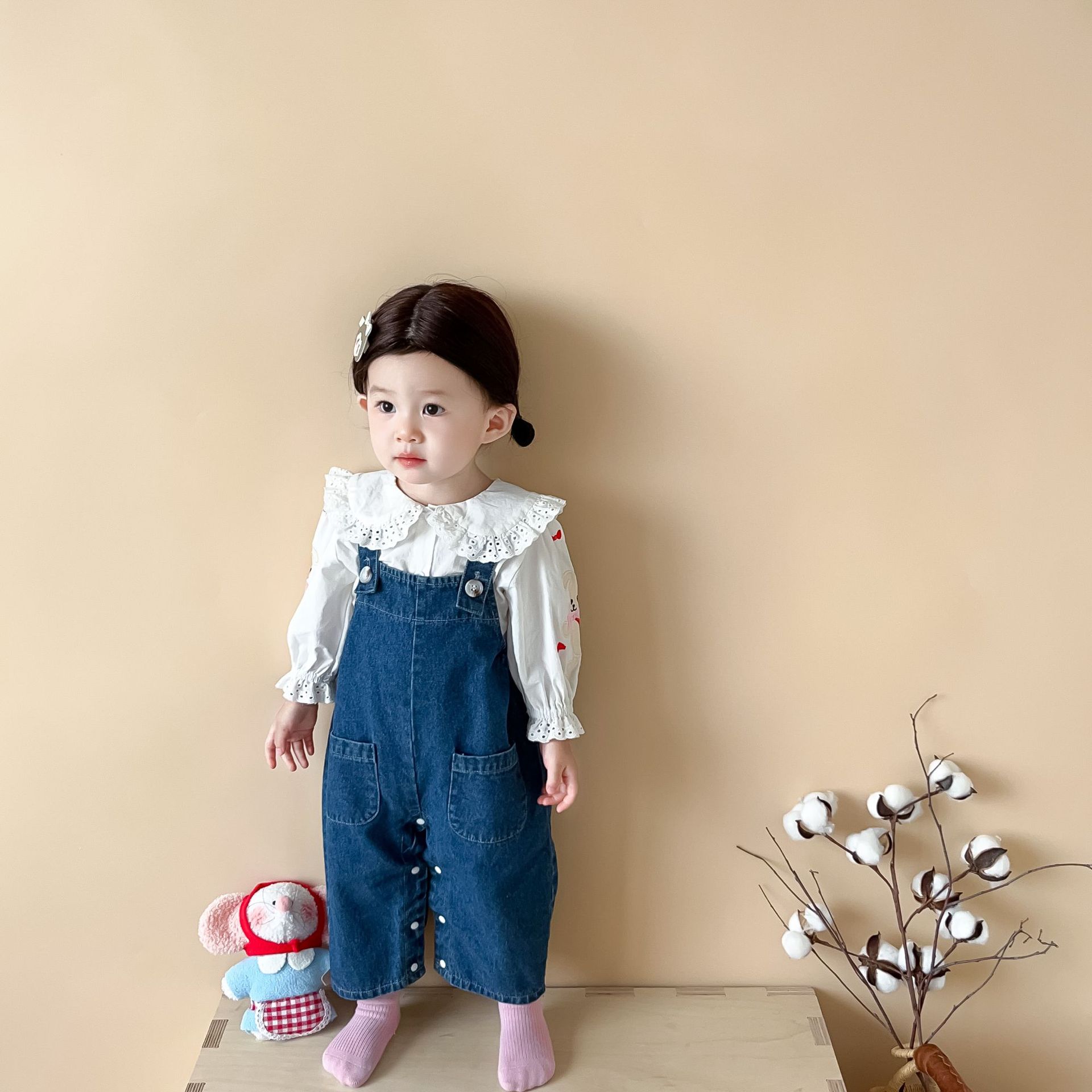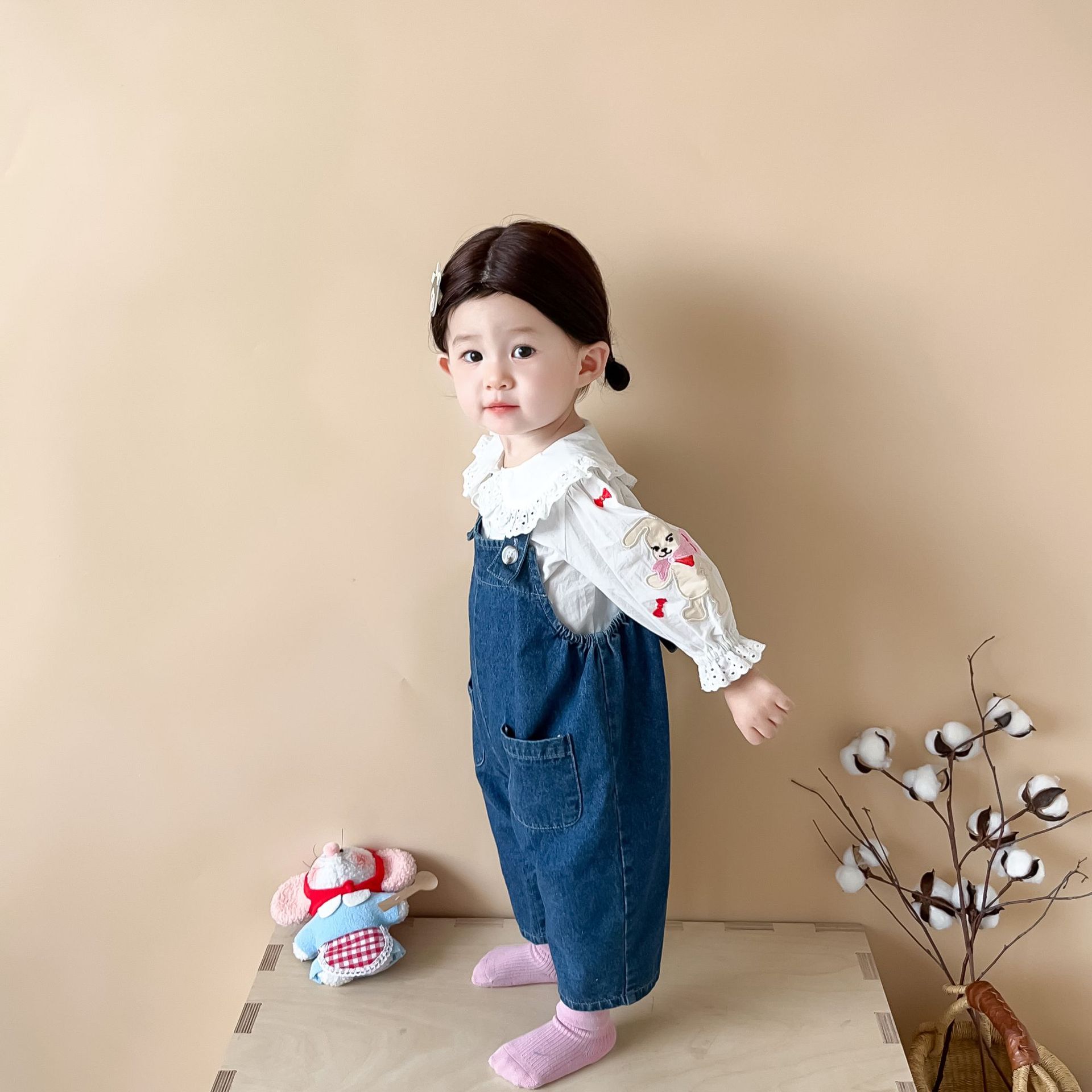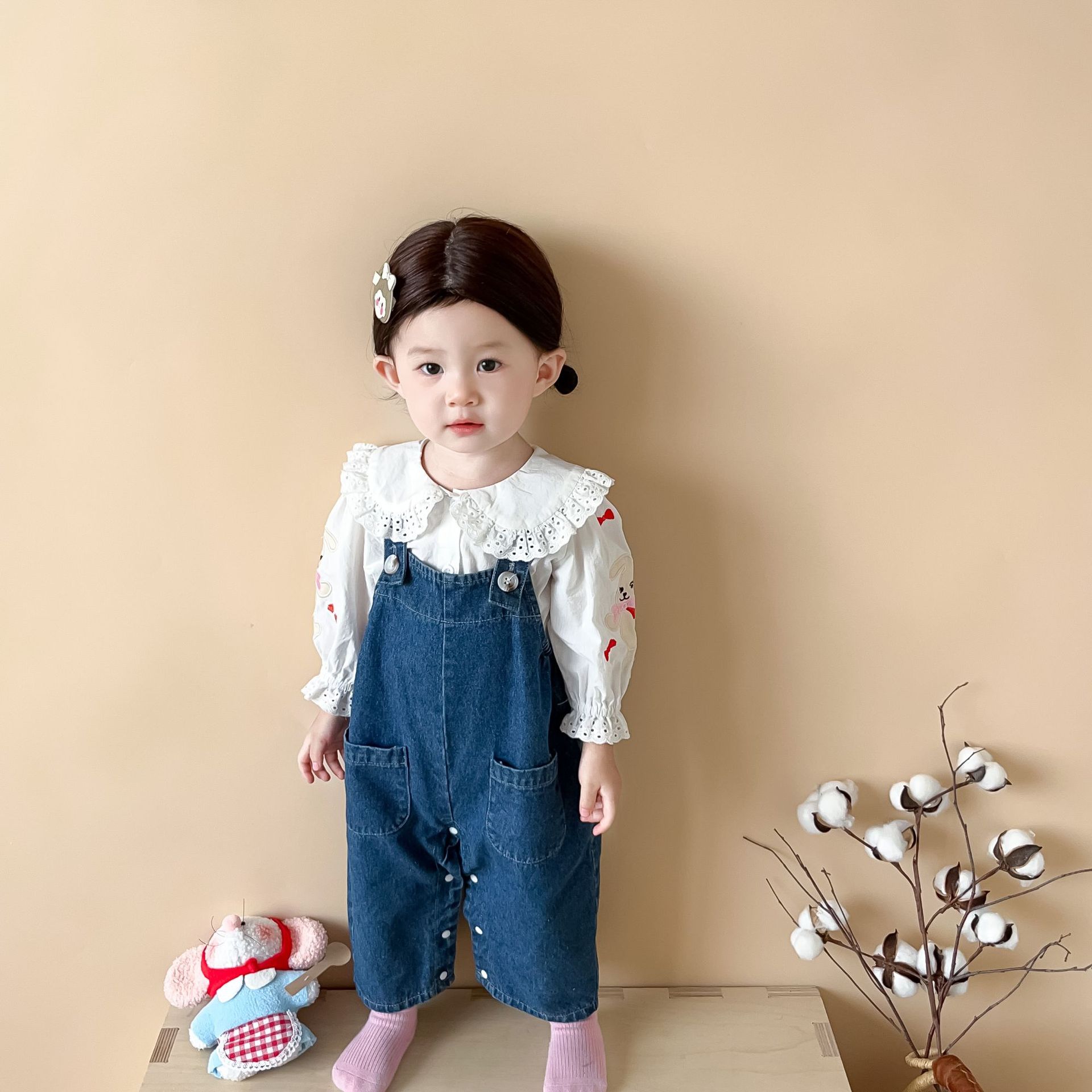 【无袖背带连体设计!舒适又时尚】婴儿衣服秋款韩版婴幼儿童,宝宝软牛仔吊带外出爬服,温柔呵护 兔耳蓬松可爱 软萌细节,百变造型,展现宝贝独特魅力