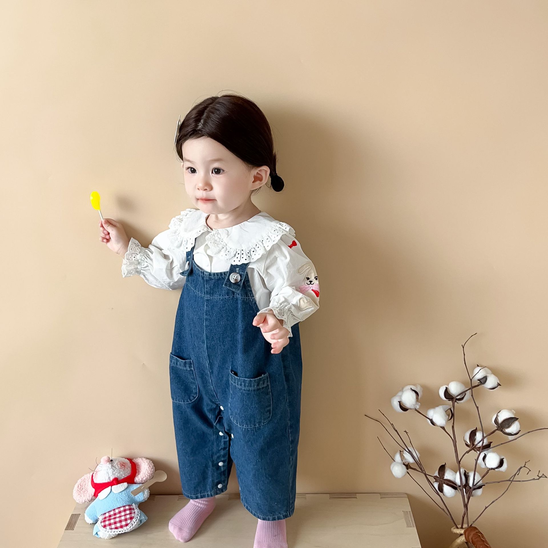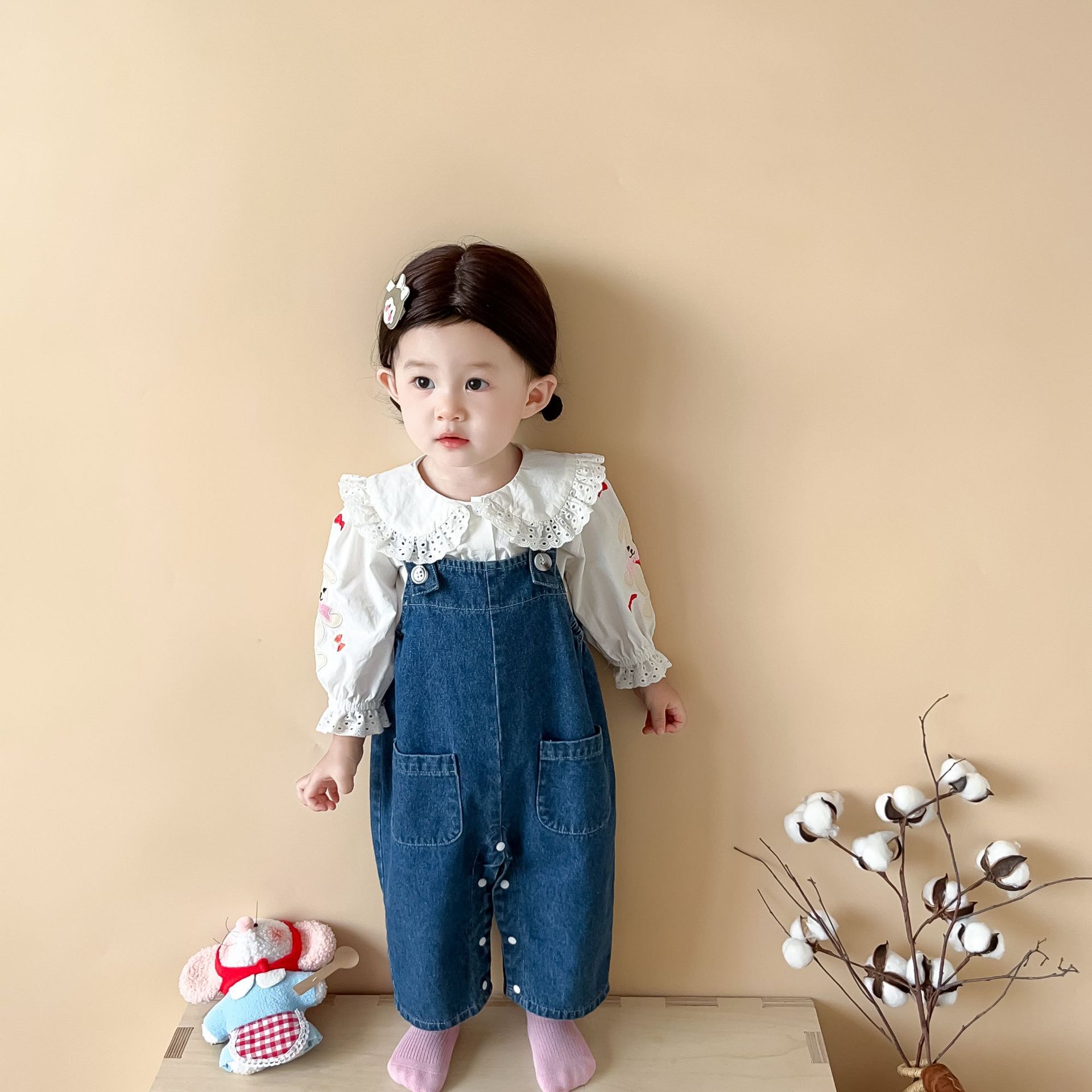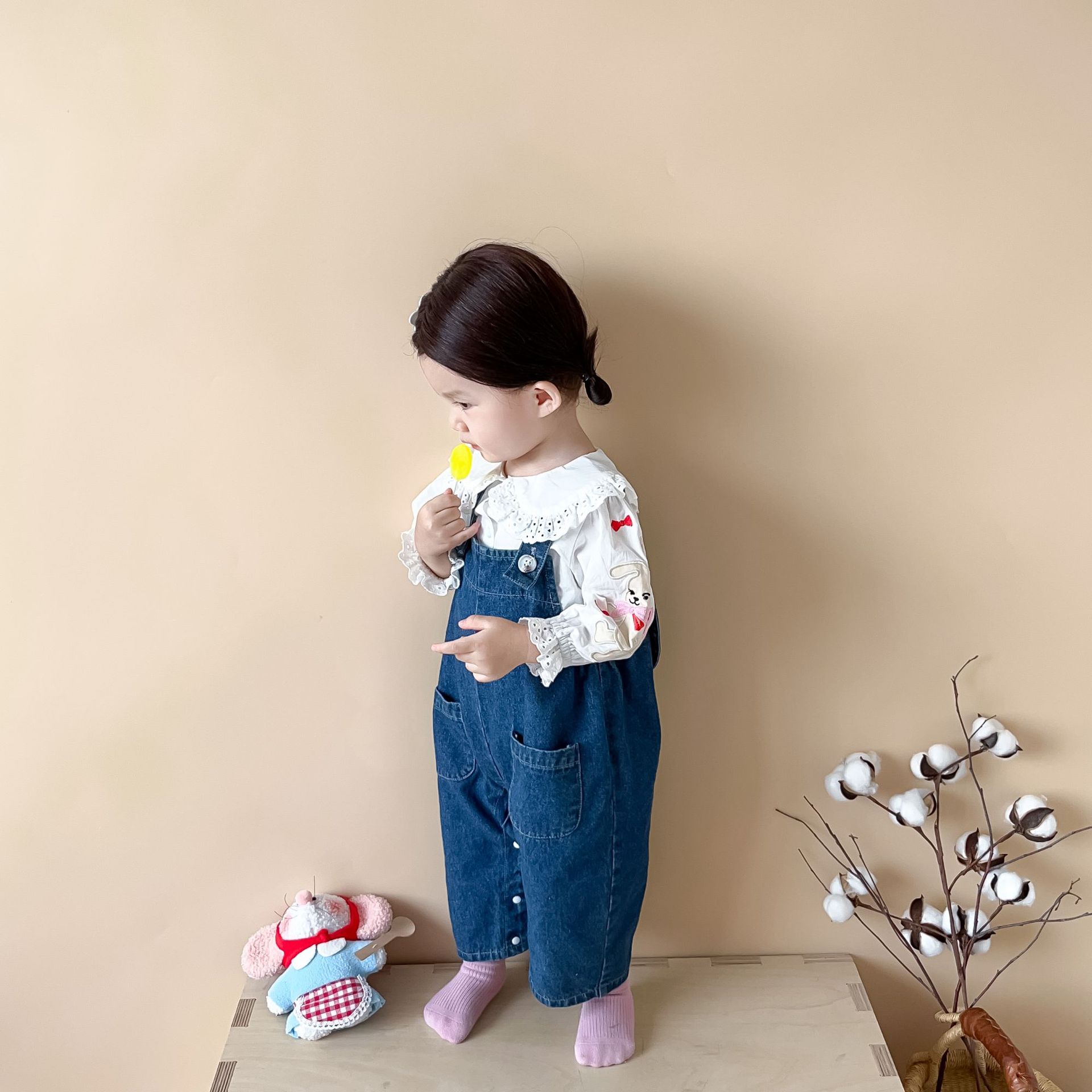 【无袖背带连体设计!舒适又时尚】婴儿衣服秋款韩版婴幼儿童,宝宝软牛仔吊带外出爬服,温柔呵护 兔耳蓬松可爱 软萌细节,百变造型,展现宝贝独特魅力