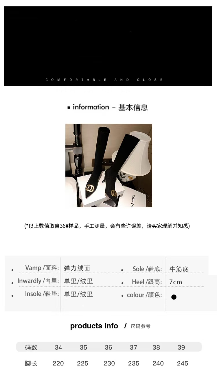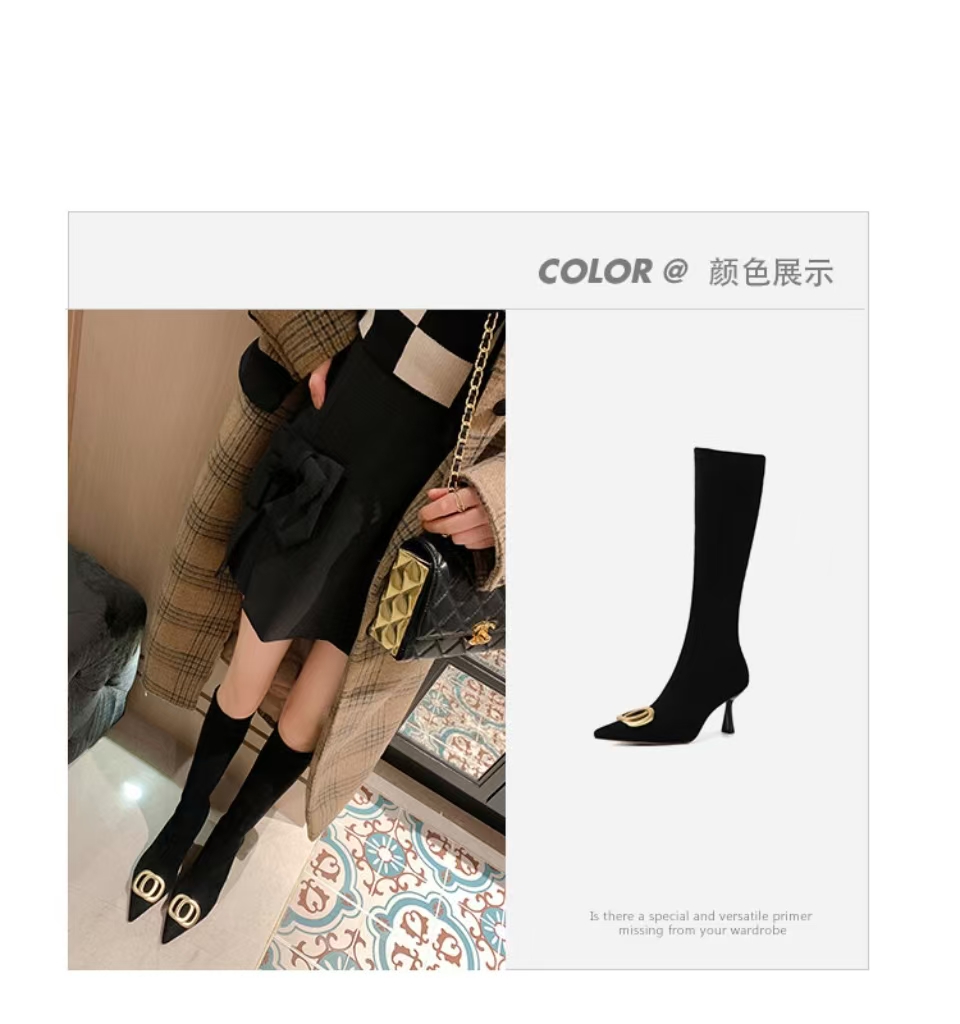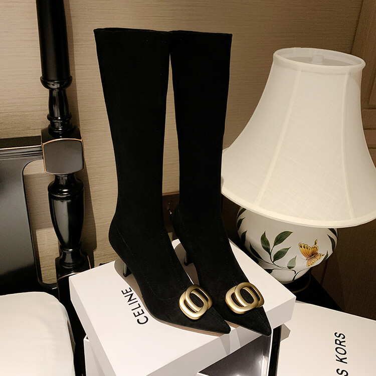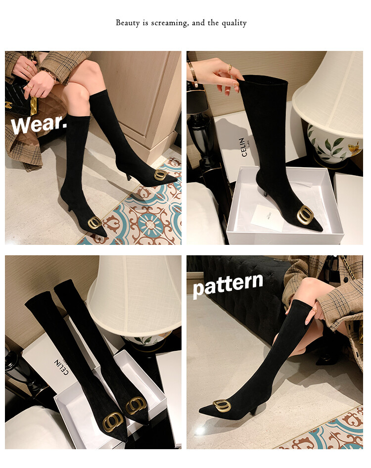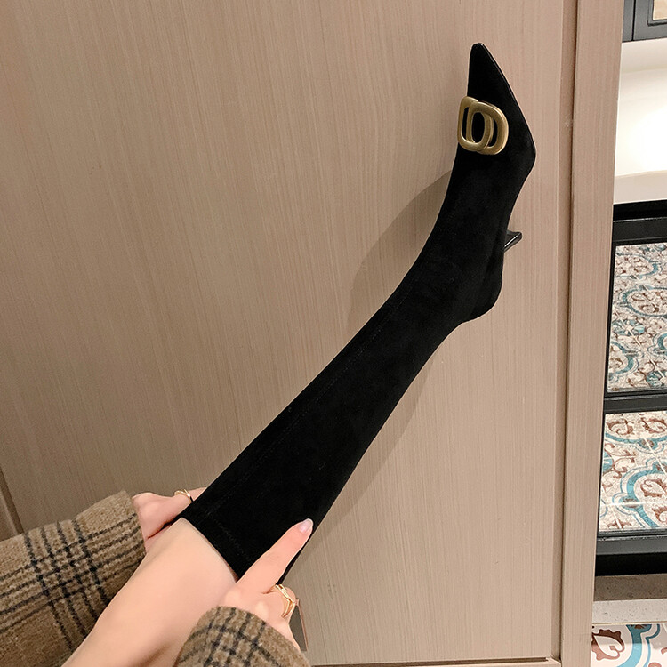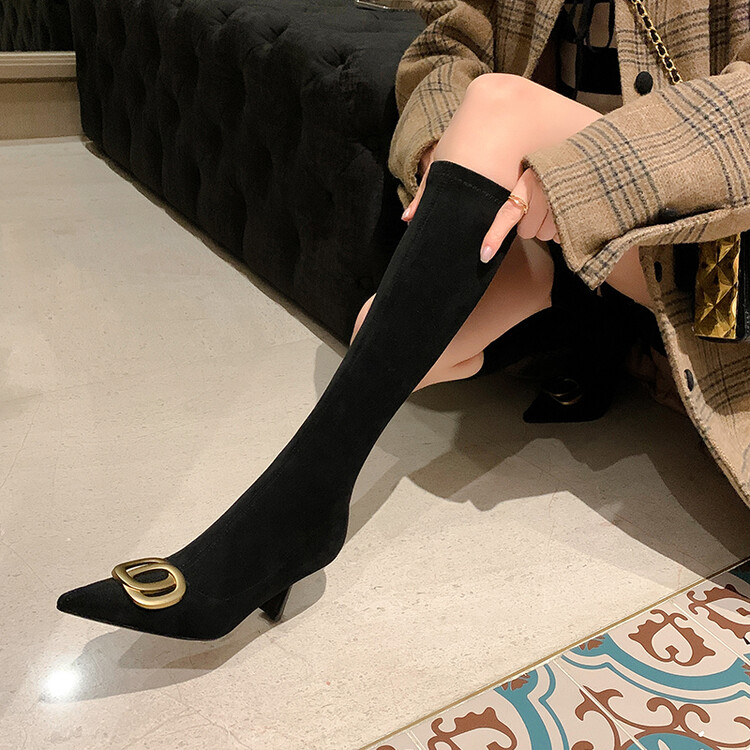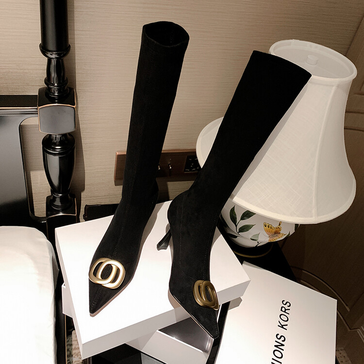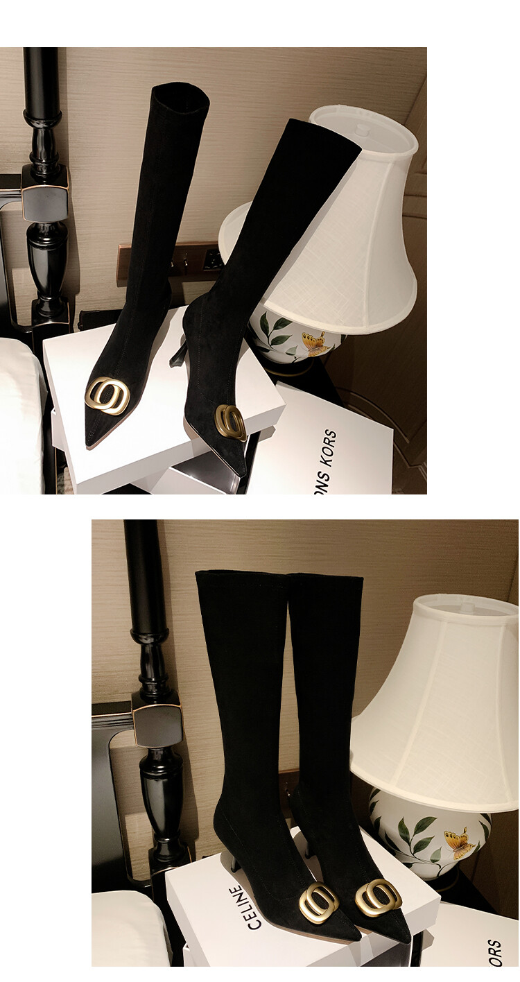 【预售7天】韩版尖头性感高筒靴细跟袜靴高跟7cm包腿瘦瘦靴绒面金属弹力长靴SLLJ&sl-6077