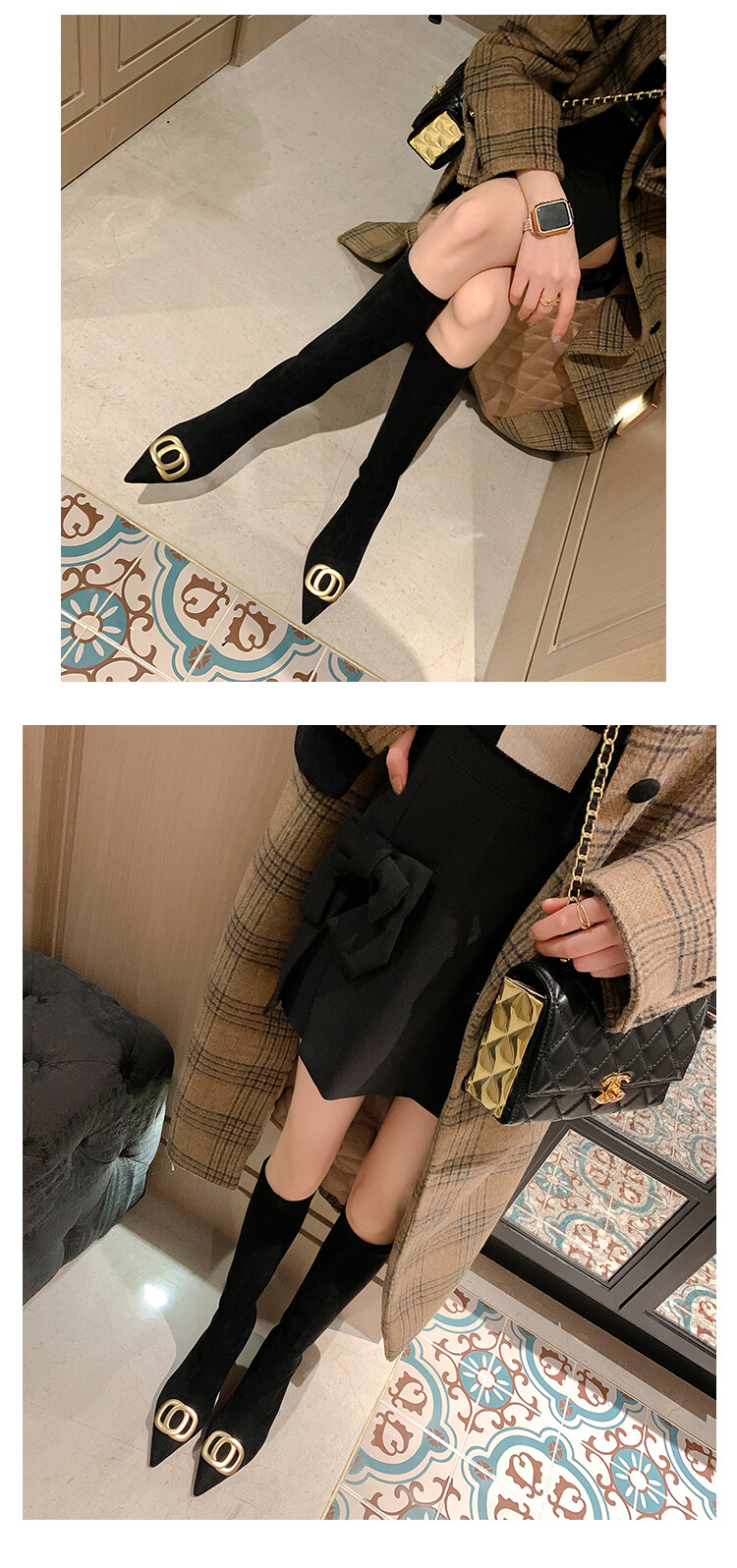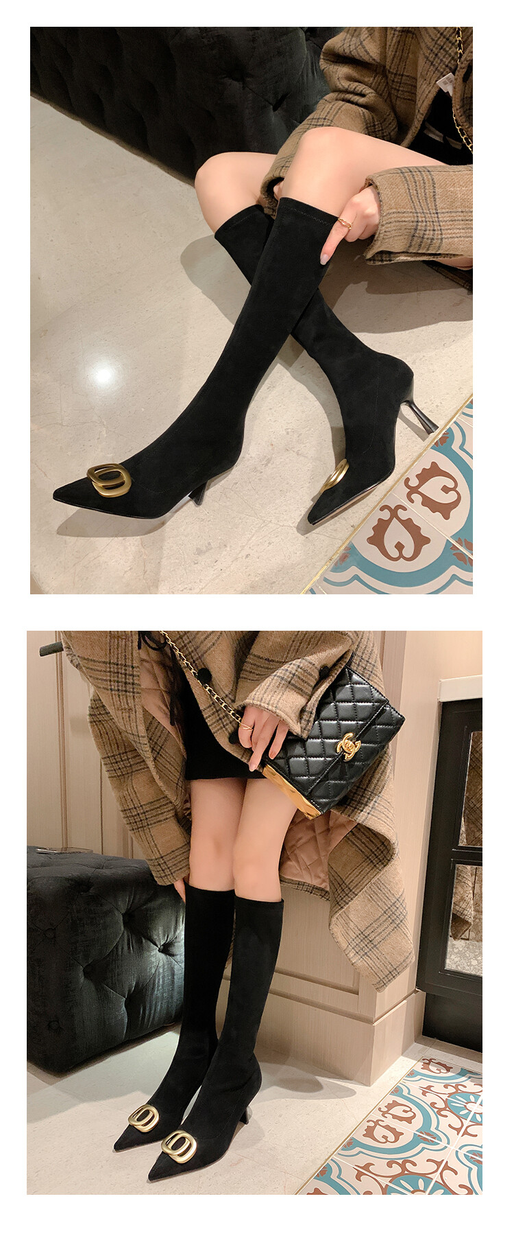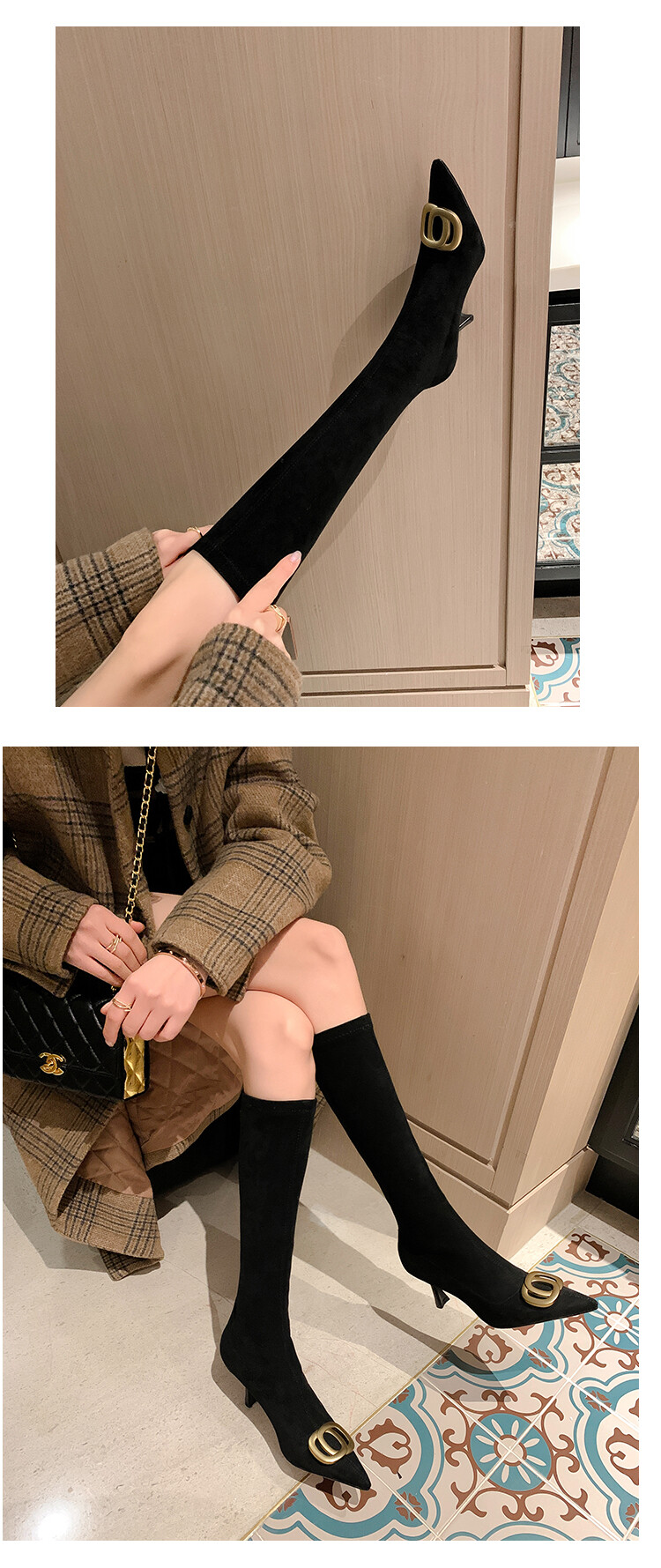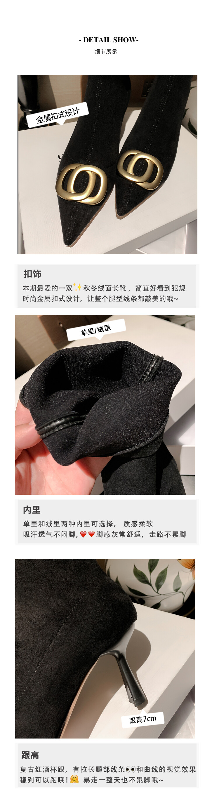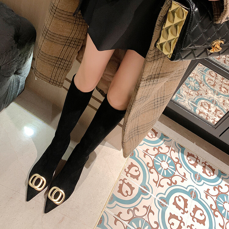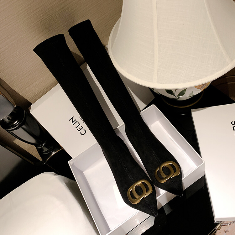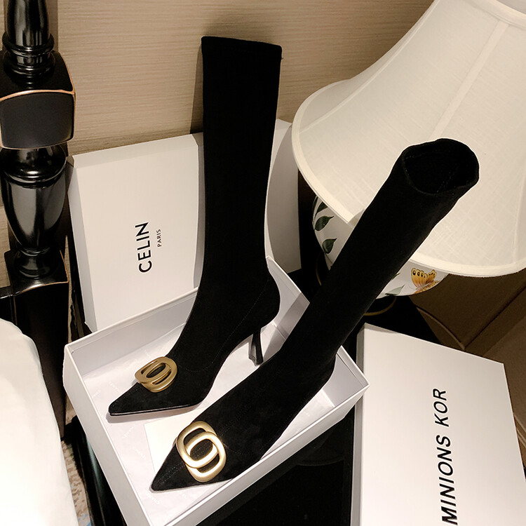 【预售7天】韩版尖头性感高筒靴细跟袜靴高跟7cm包腿瘦瘦靴绒面金属弹力长靴SLLJ&sl-6077