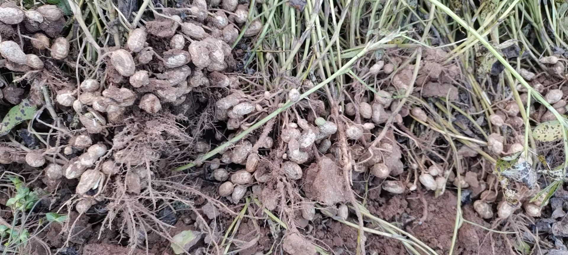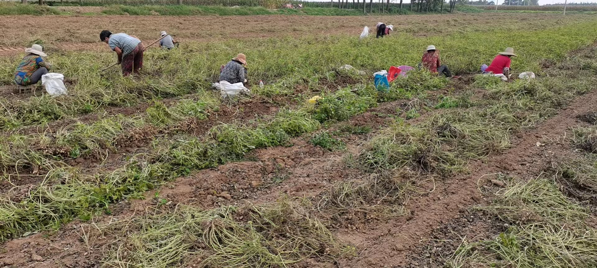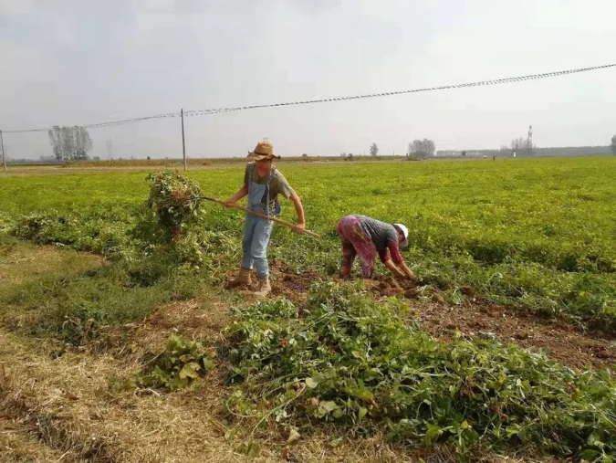 花生是低杆作物,容易被草覆盖掉,所以花生每年都要多次进行除草。10月份花生成熟收获,等到连续晴天时把花生晒干,再用机器脱花生瓤。
