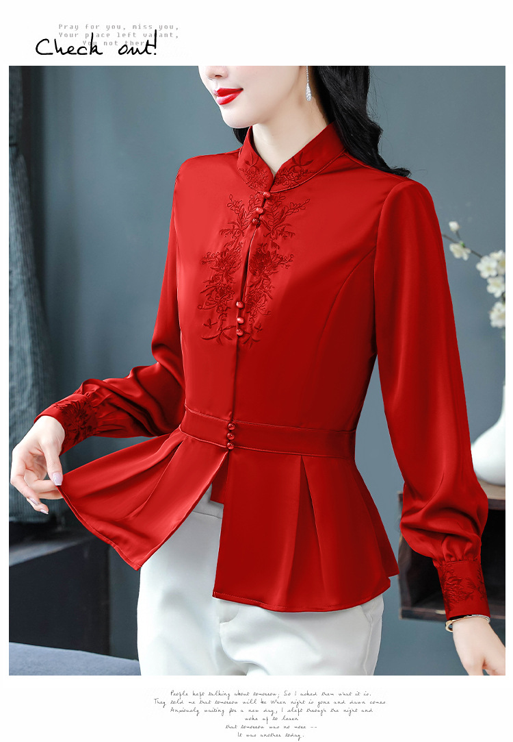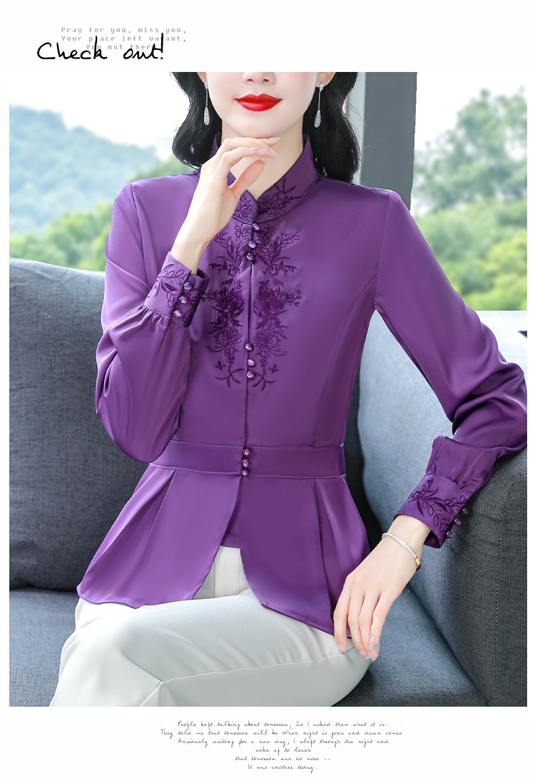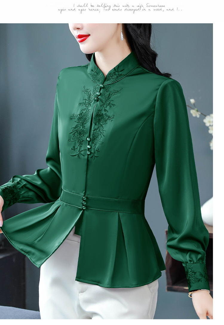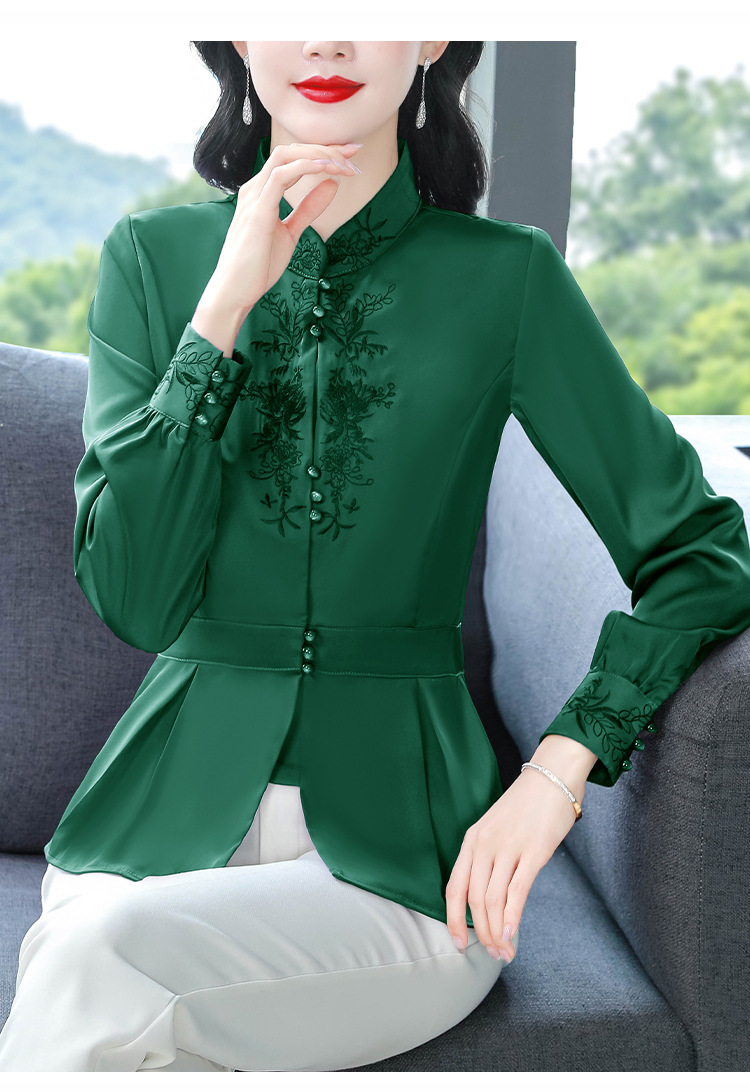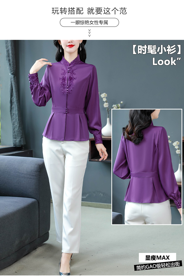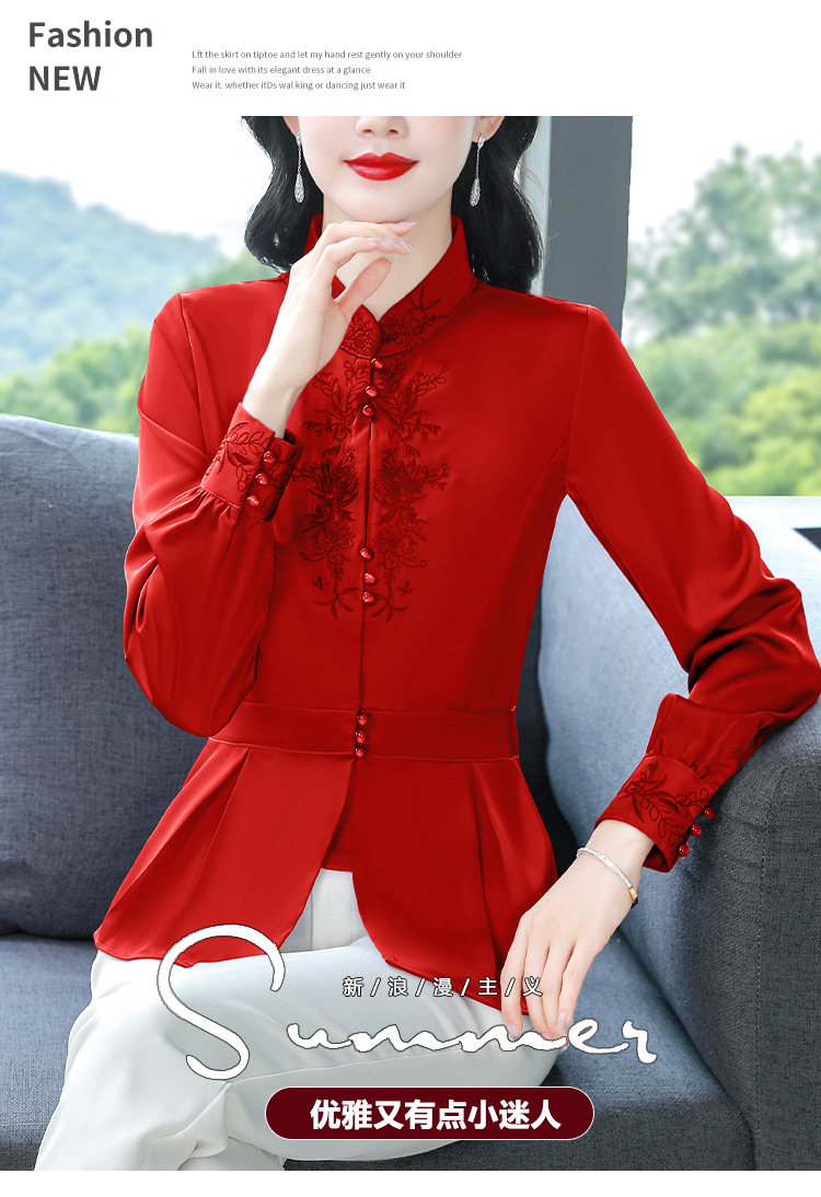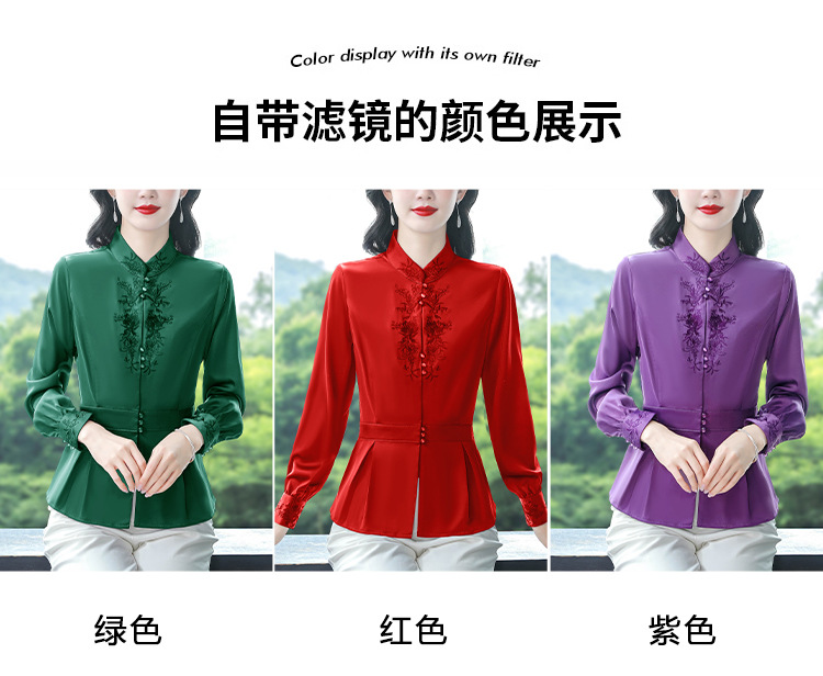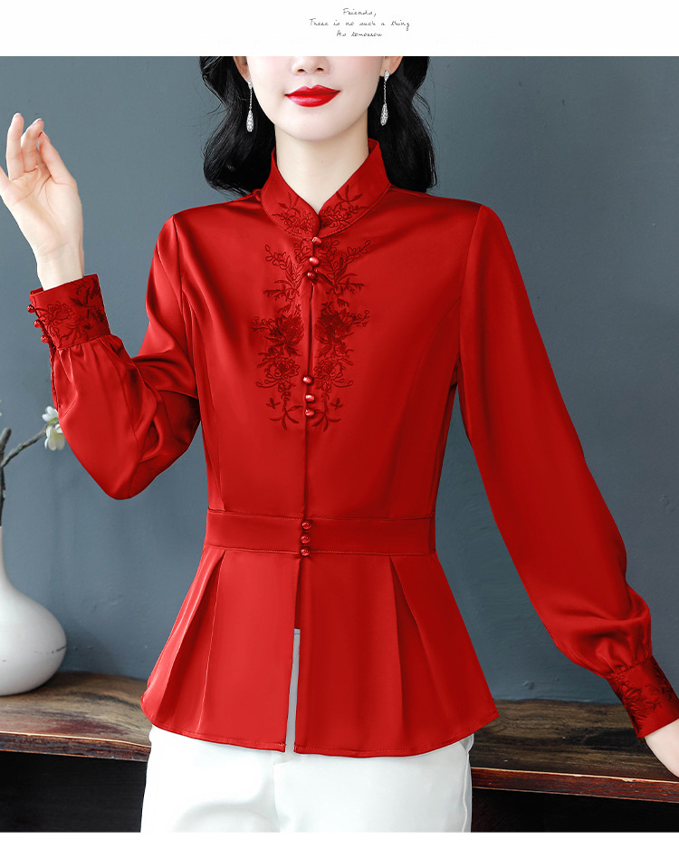 新中式缎面立领长袖衬衫女2025秋季新款高端刺绣衬衣减龄收腰上衣