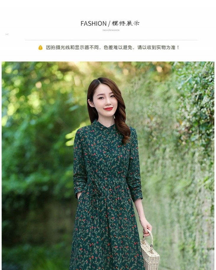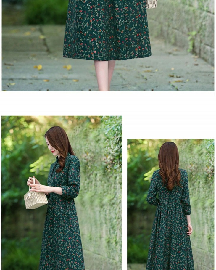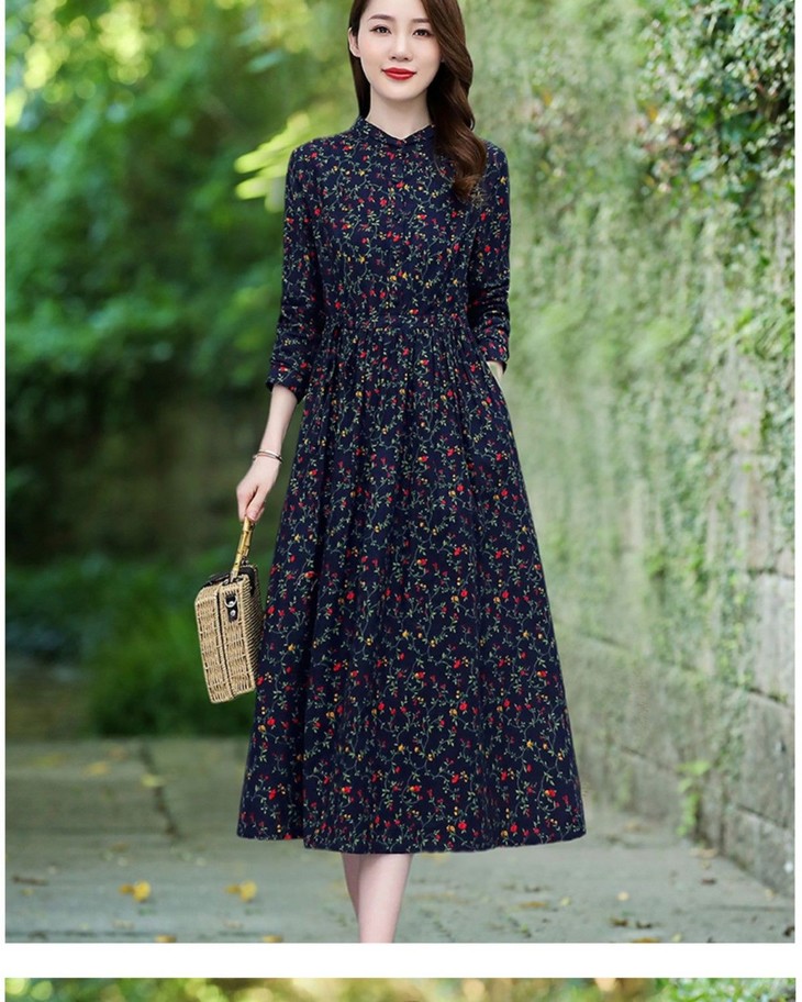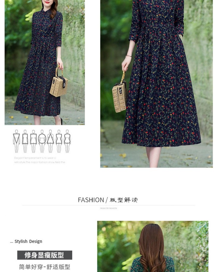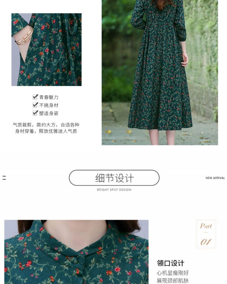 JXG-高端加厚棉麻磨毛碎花连衣裙女春秋2021新款气质显瘦胖mm长袖裙子