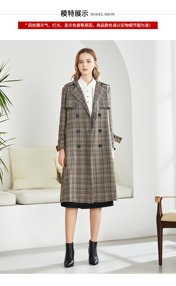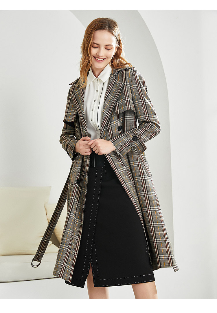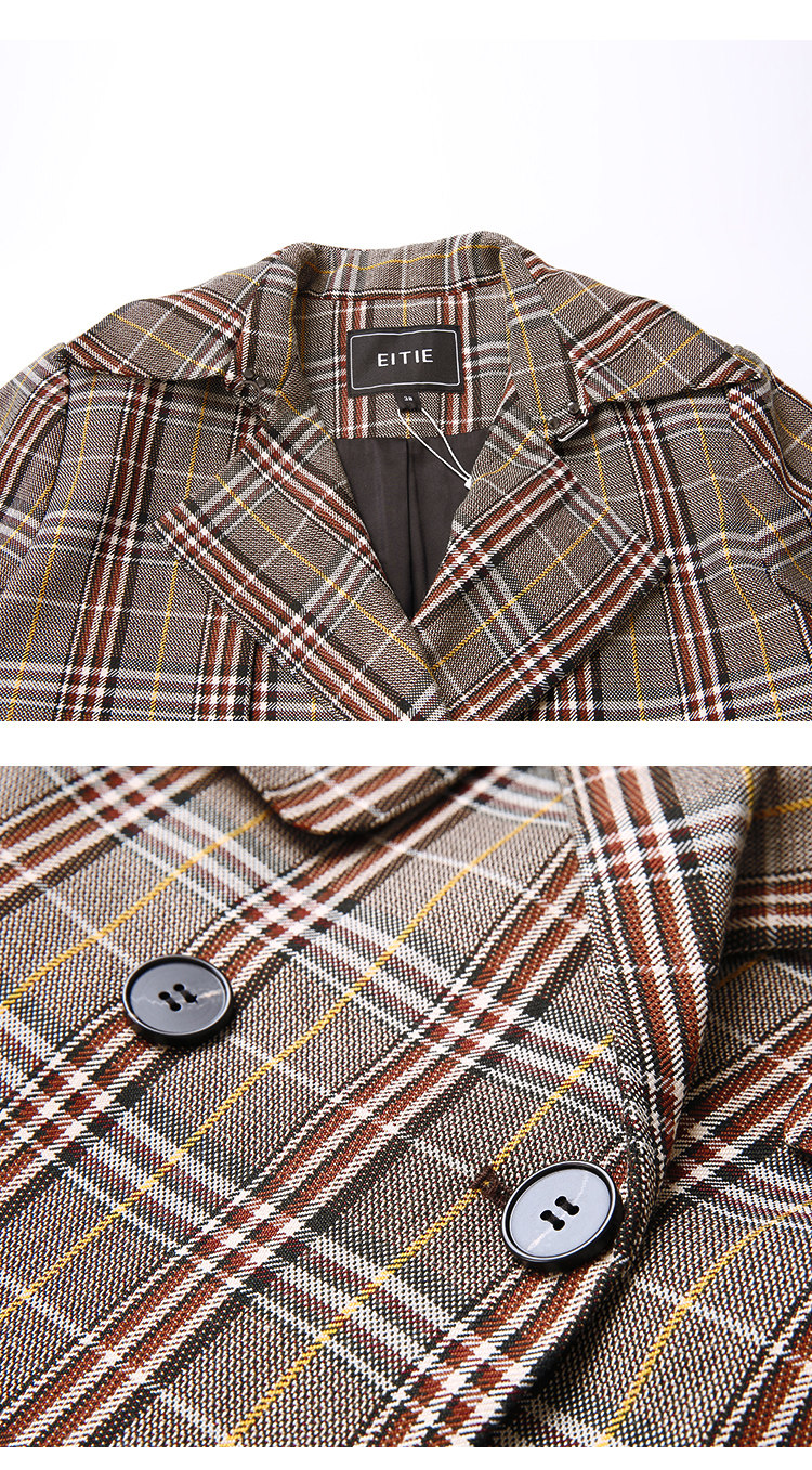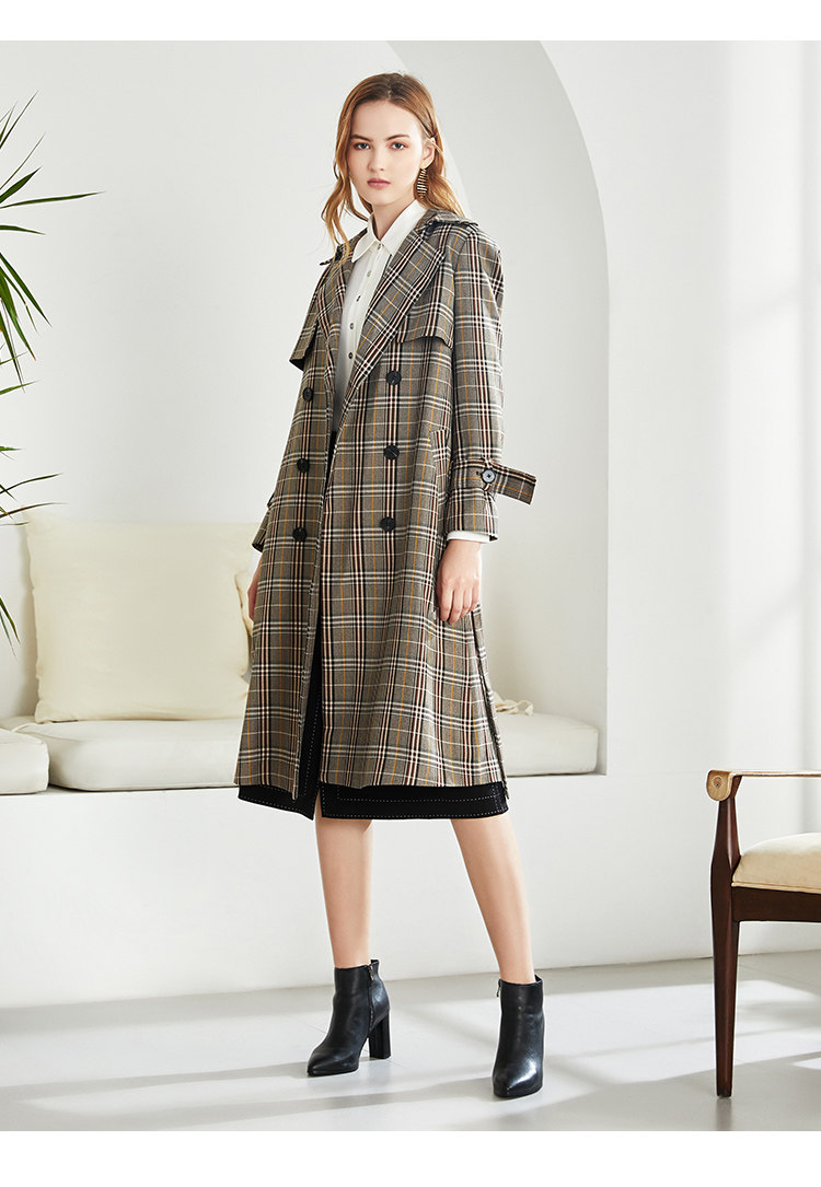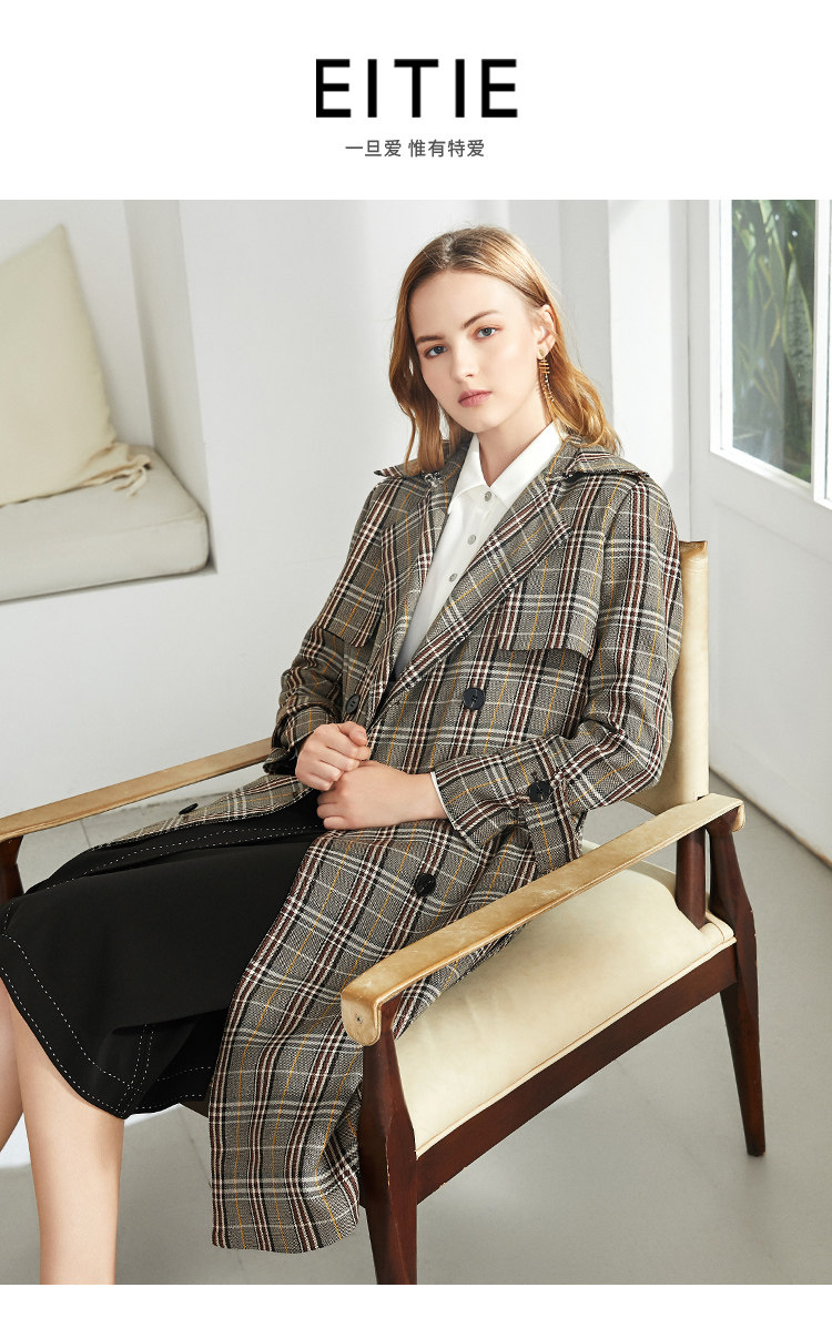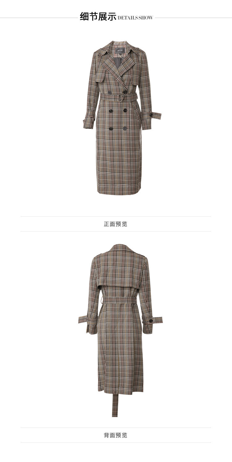 EITIE爱特爱秋季新款时尚洋气复古英伦格纹双排扣风衣外套女6004712