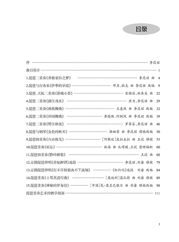 本书是作者三十多年来研究琵琶重奏的成果,精选了近年来创作的优秀佳作,大部分作品是作者及其学生团队原创或改编,包括琵琶二重奏《香格里拉之梦》《鹭江秋夜》《彝族舞曲》、琵琶与打击乐《伊犁的早霞》、琵琶四重奏《黔岭醉歌》《自由探戈》《土耳其进行曲》、琵琶大阮二重奏《蓉城小景》、京剧琵琶弹唱《贵妃醉酒》选段等。这些作品题材丰富多样,且演奏多元化,能充分调动学生的积极性,使其融入其中共同协作,教学效果非常明显。作者长期在高校琵琶教学中,结合民乐艺术的创新模式、学生的个性特征以及多年的教学经验,从教学安排、曲目改编、演奏形式等方面,逐渐探索琵琶重奏教学之路:作者强调琵琶教学不能单一的“个人小课”教学,应以“个人课+集体课”,即“个人小课+集体合作(重奏、齐奏)”的方式,通过集体合作的方式培养学生相互协作、互帮互助的精神;作者还强调根据学生的不同个性因材施教,充分发挥学生特长,融入重奏创作和演奏中,在发挥学生个性的同时,也能帮助学生们互补各自的不足。如节奏控制不稳的学生,让其轮流演奏作品中的打击乐部分,以此提高其节奏控制力;如会唱京剧或南音的同学,指导其将唱腔运用到重奏中,不仅发挥了学生的特长,更增加了课堂的趣味性。书中多数作品均由作者组织的“厦门大学海韵琵琶乐团”演奏过,并在各级琵琶比赛中获奖,有较高的教学实用性和艺术性。