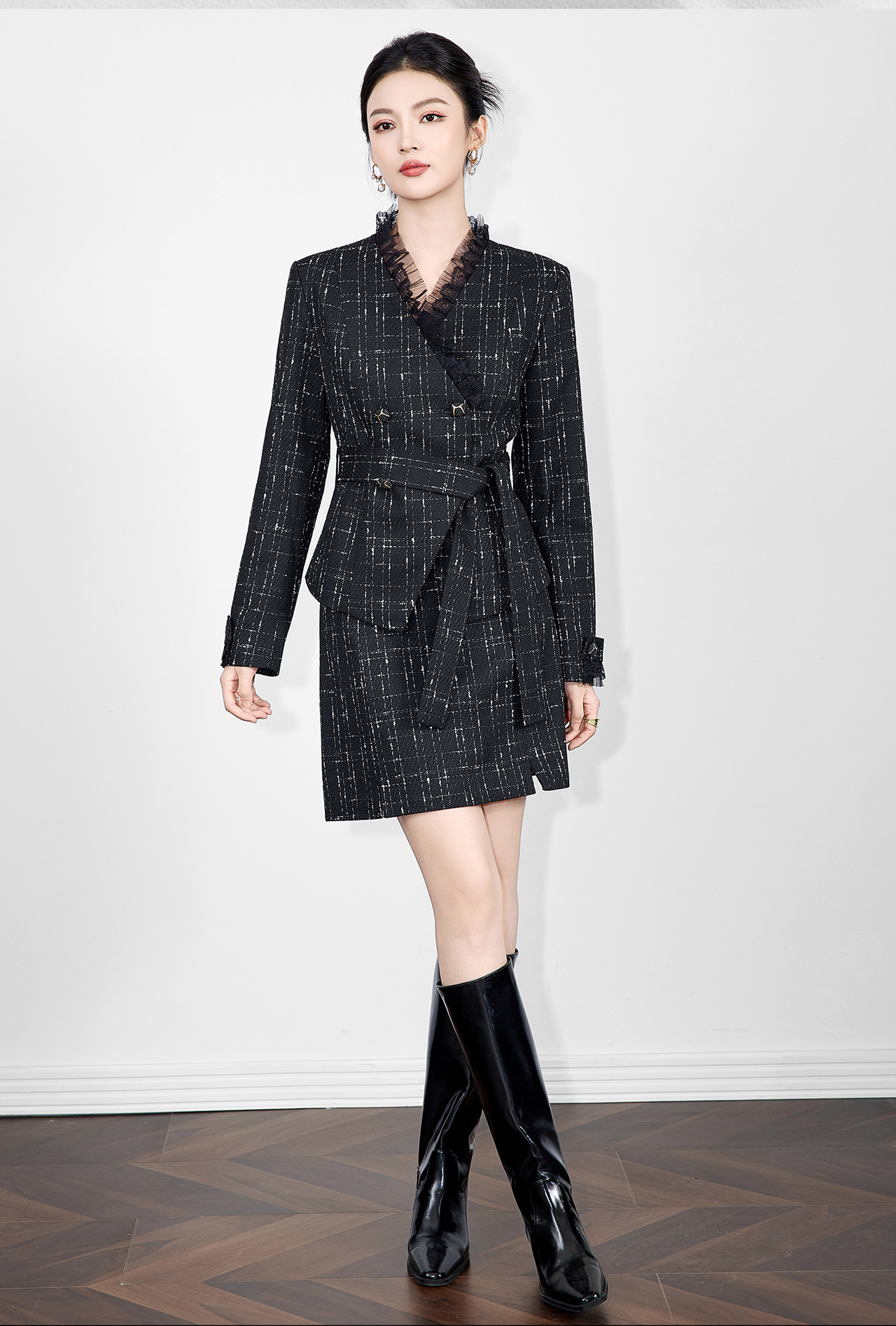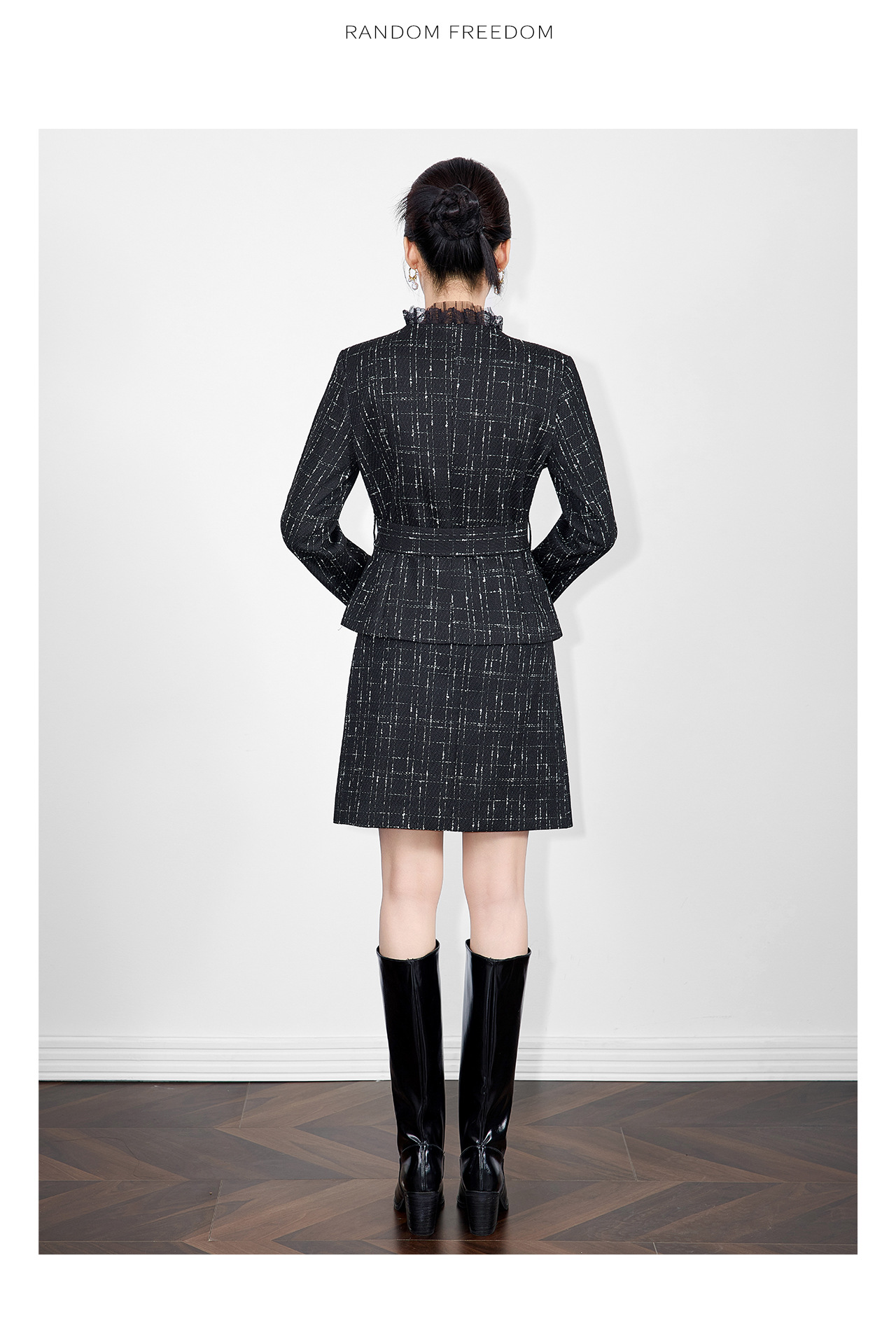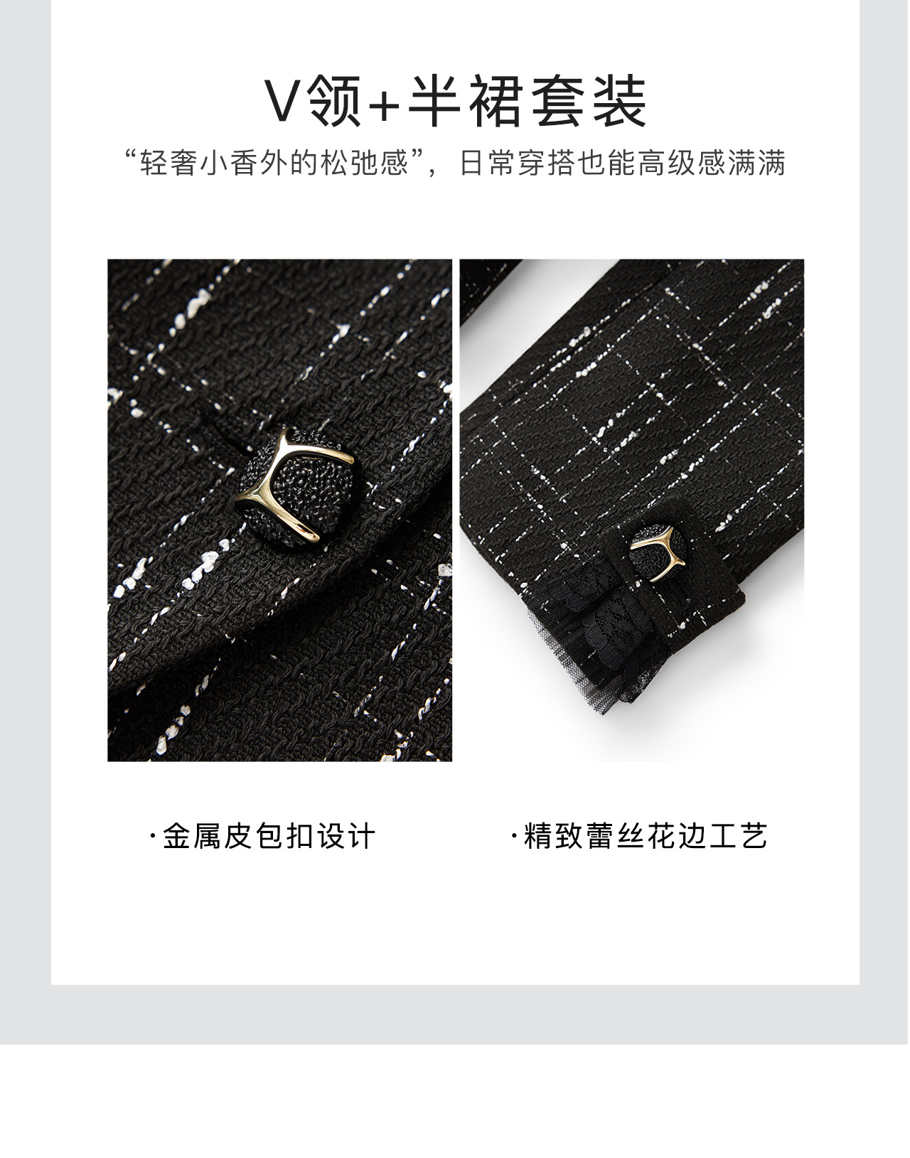 「高货wl」全新升级【铂金会员441/天猫599/差价158】(99236)洛诗琳2025秋冬小香风格纹蕾丝拼接外套高腰半裙两件套