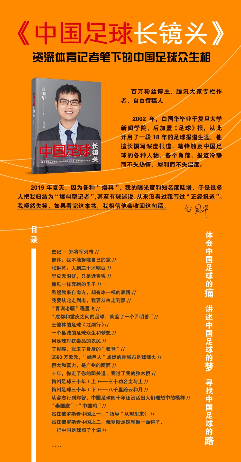 2002年从复旦大学新闻系毕业后,白国华进入《足球》报工作,是中国首屈一指的一线足球记者,尤其擅长深度专题报道,曾作为国家足球队和广州恒大队的《足球》报跟队记者,“腾讯大家”专栏作家。十数年的足球运动采访经历,令作者对中国足球的参与者、运行机制及内涵文化有着独特的、深刻的理解,借助于通俗流畅的文字,作者将普通民众视野外的中国足球景象,清晰地展现在读者面前。