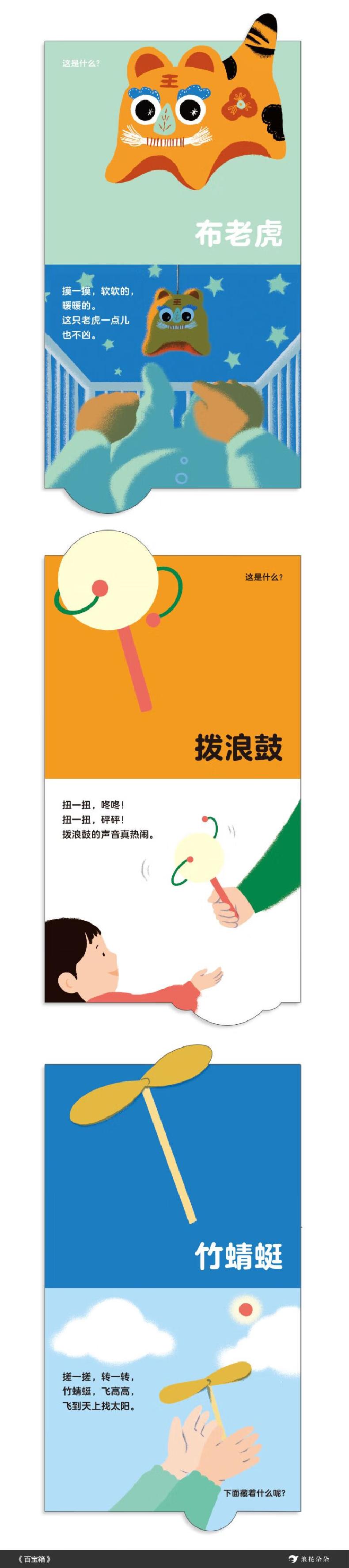 包含布老虎、拨浪鼓、不倒翁等中国传统玩具,可以让孩子了解中国有很多历史悠久、充满特色的玩具。并且这些玩具按照孩子能玩的年龄顺序排列,比如在还是小宝宝的时候可以玩布老虎,再大一些时就可以玩不倒翁、竹蜻蜓……以巧妙的方式体现出孩子的成长轨迹,给孩子和家长都留下很多关于童年的美好记忆。