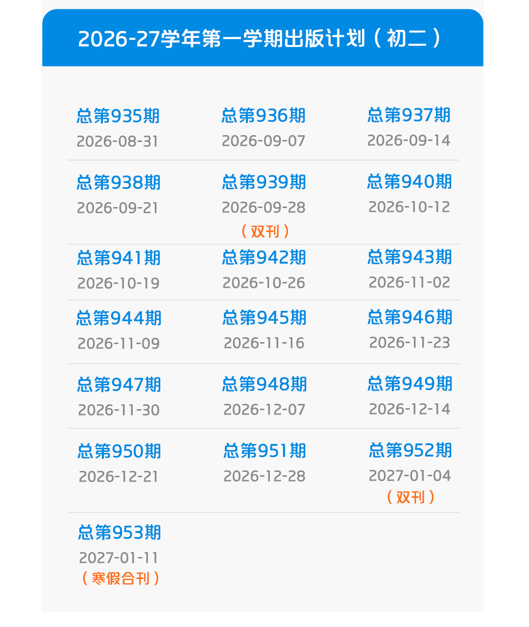 全年出版计划共包含7期合刊。其中5期为双刊,定价6.4元,出版日期分别为3月30日、4月27日、5月25日、9月28日、27年1月4日;1期为暑假合刊,定价16元,出版日期为2026年6月29日;1期为寒假合刊,定价16元,出版日期为2027年1月11日。