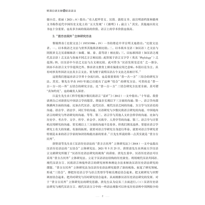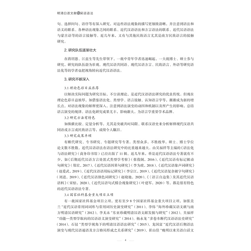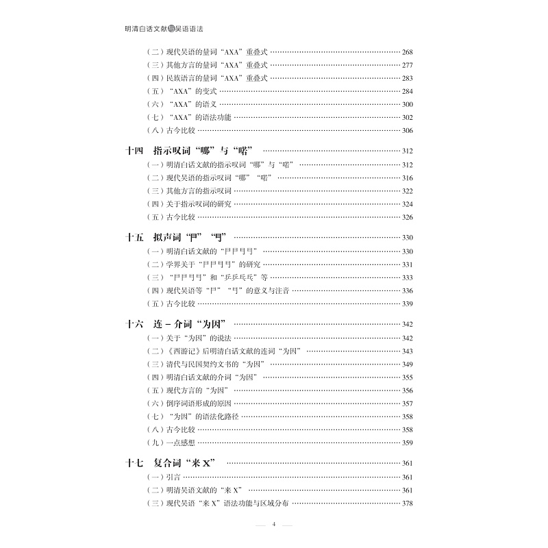 《浙学与现代文明》丛书之一种。国家社会科学基金项目“明清白话文献与吴语语法专题比较研究”(18BYY047))研究成果。明清白话文献与现代吴语的语法研究各自都取得了丰硕成果,但把两者结合起来的研究成果则相对薄弱。本书稿主要研究吴语语法的历时演变,细致考察明清白话小说、戏曲的语法现象,充分利用传教士文献、契约文书等,并与其他方言、南方民族语言、海外华人社区方言等进行共时比较。与同类成果相比,本书稿有如下几点特点:(1)理论色彩浓厚:如类型学、语法化、认知语言学、接触语言学等理论。(2)纠正了一些错误认识:对瑞典著名汉学家高本汉认为“为因”等明代白话小说中使用的词语在《红楼梦》中已消失,进行了更正补充。(3)充分挖掘新事实:比如明清白话文献的一些拟声词,但音未明,本书进行了补充。
