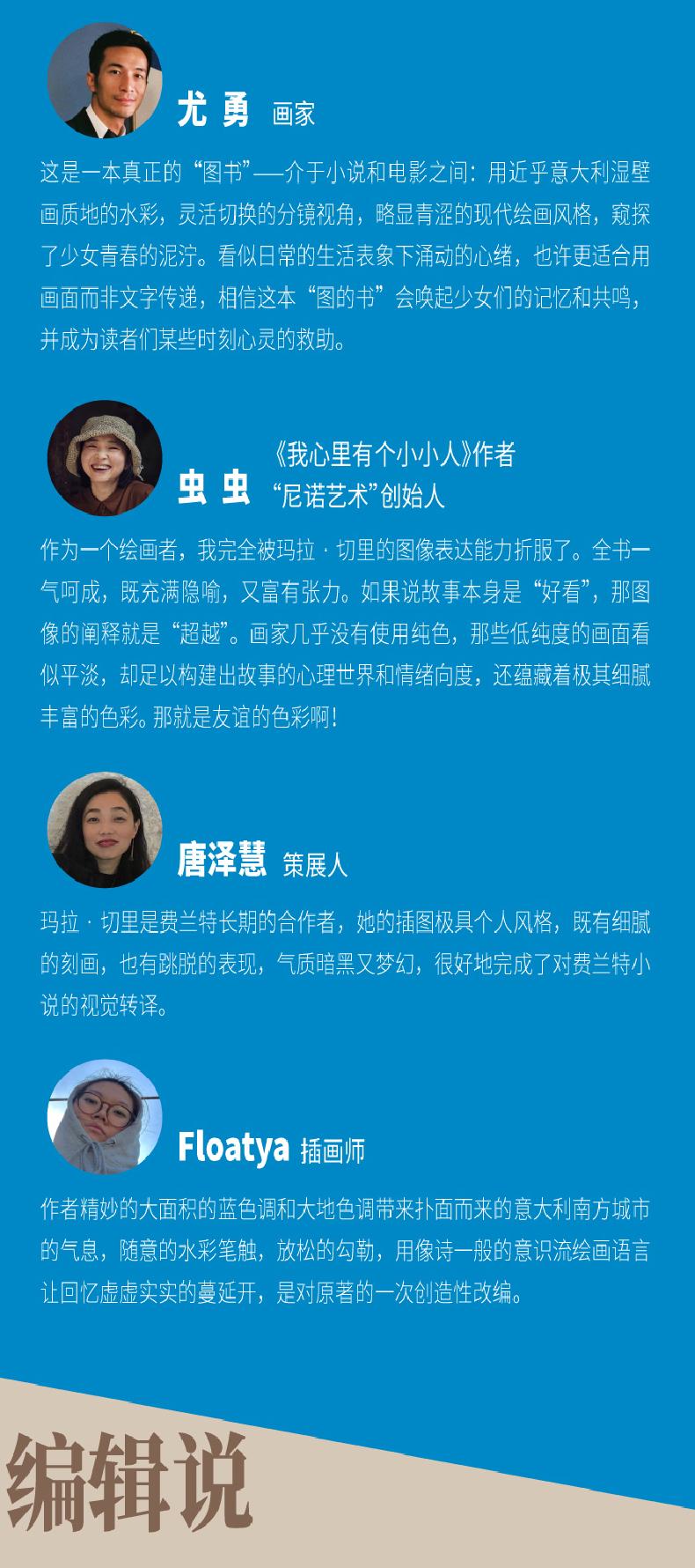 ✸2016年意大利“斯特雷佳”文学奖获得者、记者尼科拉•拉齐亚曾采访费兰特,他们之间的对话非常精彩。他说在这部小说里,这种关系是让他嫉妒的,因为两个人会争吵,相互背叛,但除了年老和死亡,任何事情都不会使她们断绝,假如这种关系断绝的话,那她们会陷入一种绝对的孤独之中。其实,任何一种丰盈的、让人相互依存的关系都会一波三折,带来喜悦,也会带来巨大的痛苦。