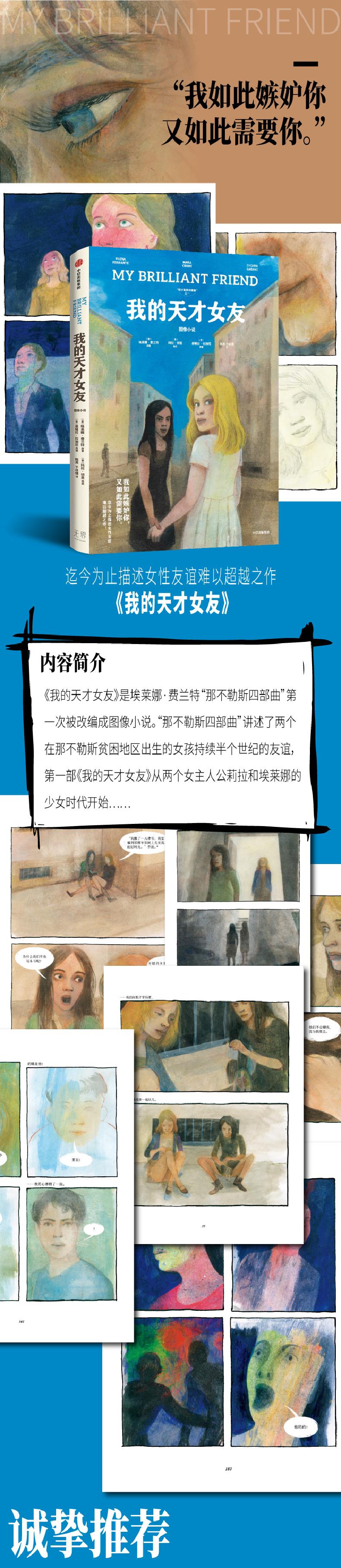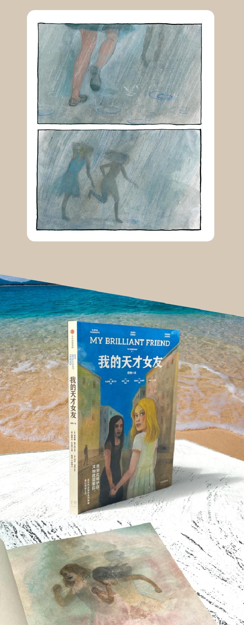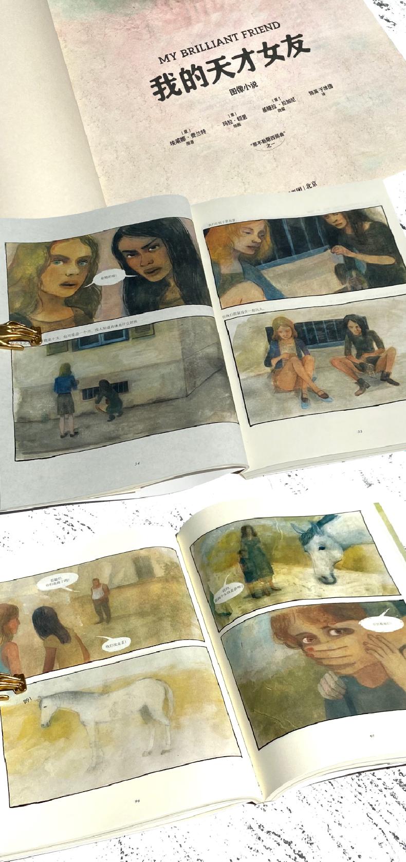 《我的天才女友》是埃莱娜·费兰特“那不勒斯四部曲”一次被改编成图像小说。“那不勒斯四部曲”讲述了两个在那不勒斯贫困地区出生的女孩持续半个世纪的友谊,一部《我的天才女友》从两个女主人公莉拉和埃莱娜的少女时代开始……再现混沌、危险的环境里,两位充满生命力的女孩那绝望、愤怒、困惑、焦灼,以及时而无限晴朗的生命体验。介于小说和电影之间的意大利湿壁画质地的水彩,灵活切换的分镜视角,略显青涩的现代绘画风格,低纯度的画面看似平淡,却足以构建出故事的心理世界和情绪向度,度细腻地展现了两个女孩交叠又分离的命运,窥探了少女青春的泥泞。读者们仿佛触摸到女性情谊不断变幻的那种质感,相信这本图像小说会唤起少女们的记忆和共鸣。