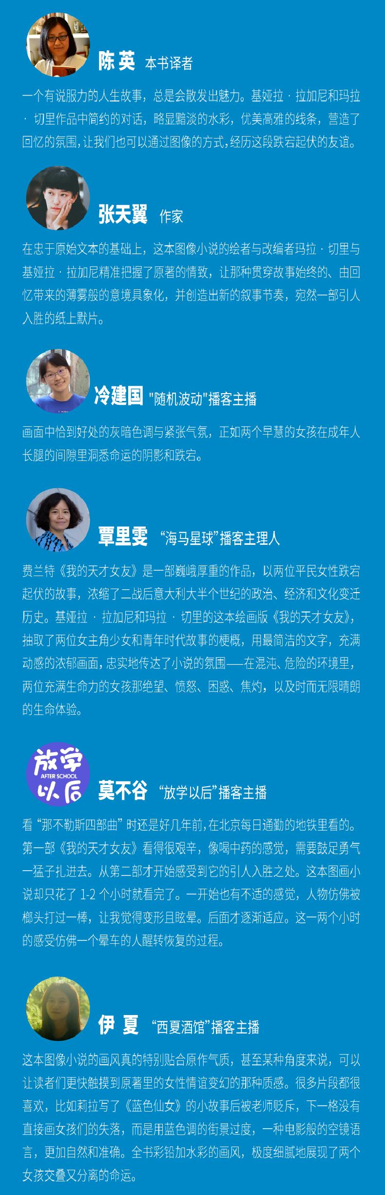 这本图像小说的画风真的特别贴合原作气质,甚至某种角度来说,可以让读者们更快触摸到原著里的女性情谊变幻的那种质感。很多片段都很喜欢,比如莉拉写了《蓝色仙女》的小故事后被老师贬斥,下一格没有直接画女孩们的失落,而是用蓝色调的街景过度,一种电影般的空镜语言,更加自然和准确。全书彩铅加水彩的画风,度细腻地展现了两个女孩交叠又分离的命运。——“西夏酒馆”播客主播伊夏