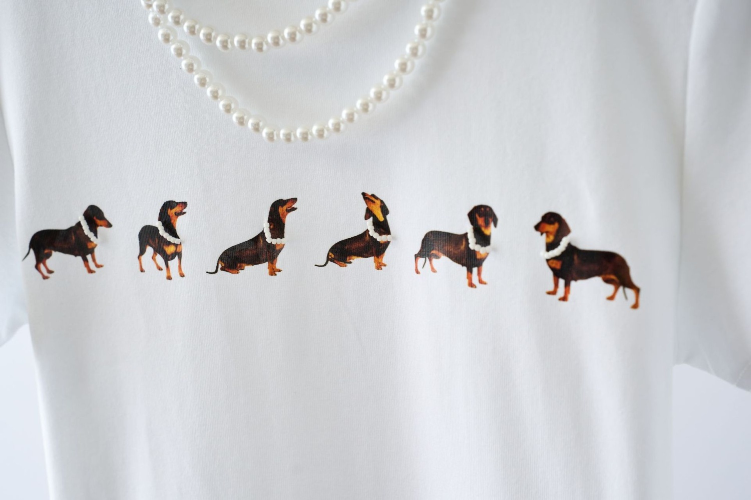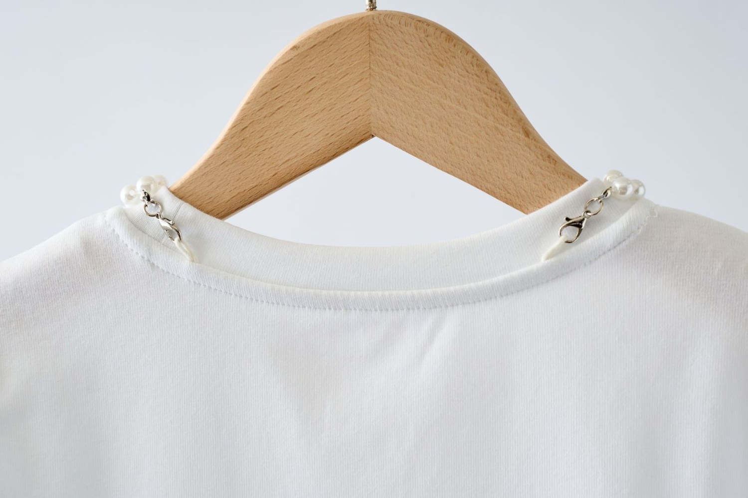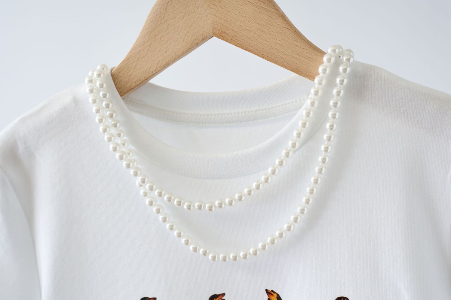 「自」全新升级【铂金会员146/天猫189/差价43】(21255)洛诗琳气质印花弹力棉质珍珠项链修身正肩圆领短袖T恤女