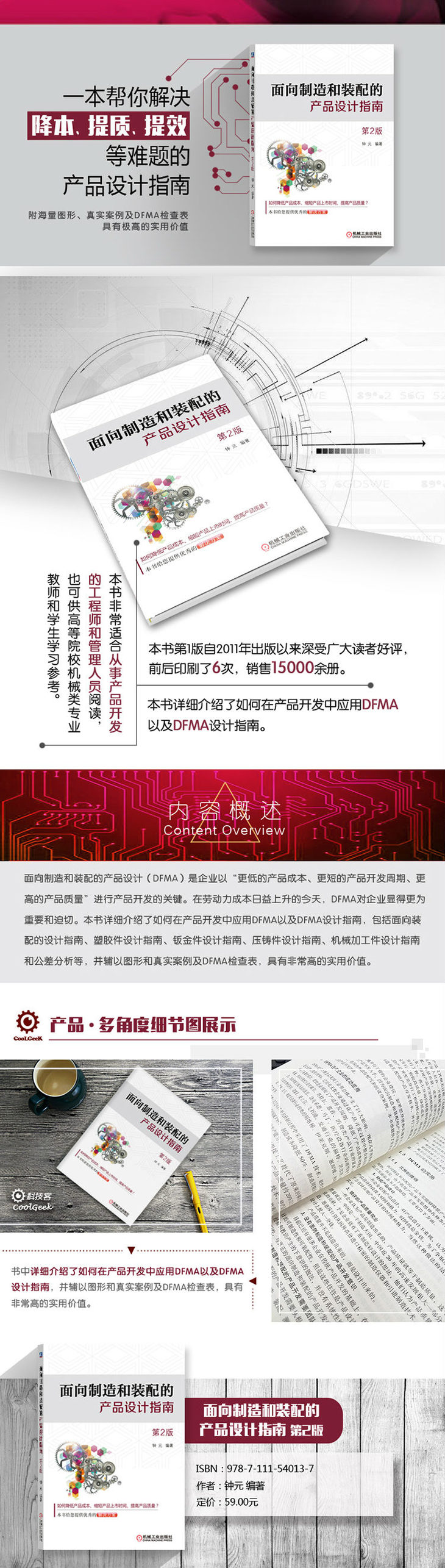本书第1版自2011年出版以来深受广大读者的好评,前后印刷6次,累计销售15000余册。为答谢广大读者的厚爱,同时使本书更符合大家的需求、更实用,我们根据近几年的技术发展和许多读者的反馈进行了修订再版。很多读者对本书的评价是非常实用,不少企业把本书当作工程师必备的培训教材。承蒙广大读者和企业的厚爱,在过去的5年中,我有机会从事有关面向制造和装配的产品设计(DFMA)的培训、咨询、应用和推广工作,服务对象包括ABB、艾默生、欧普照明、北京阿奇夏米尔、旭东(中国)、康佳电子和特灵空调等各行业知名企业。这不但让我获得了许多宝贵的实战经验,加深了我对DFMA的认识和理解,同时也让我更进一步意识到DFMA确实能给企业带来实实在在的价值,包括降低产品成本和提高产品质量等。 借此再版之际,我结合对DFMA更深层次的理解,对本书做了以下主要修改:1.增加了Design For X(面向各种设计要求的设计,简称DFX)的内容。从产品设计全局的角度介绍DFX,指出DFMA在DFX中的地位及其重要性,但同时不能忽略产品设计时需要考虑的其他要求,例如来自客户或消费者对产品的功能、外观、易使用性等方面的要求,产品可靠性的要求,以及产品低成本的要求等。2.在塑胶件设计指南一章中增加了常用塑胶材料性能的解读,这有助于工程师在选择材料时做出正确的选择,同时对塑胶件进行有针对性的零件设计。另外,更加详细地介绍了塑胶件的超声波焊接,包括工艺介绍、焊接结构设计及指南等。3.增加了新的一章:机械加工件设计指南。通过面向机械加工的设计,实现零件机械加工时的高效率、低成本和高质量等。4.重新调整了公差分析一章的结构。以常见错误公差分析方法为入口,系统化地介绍了在产品开发过程中进行公差分析的具体步骤和具体指南。