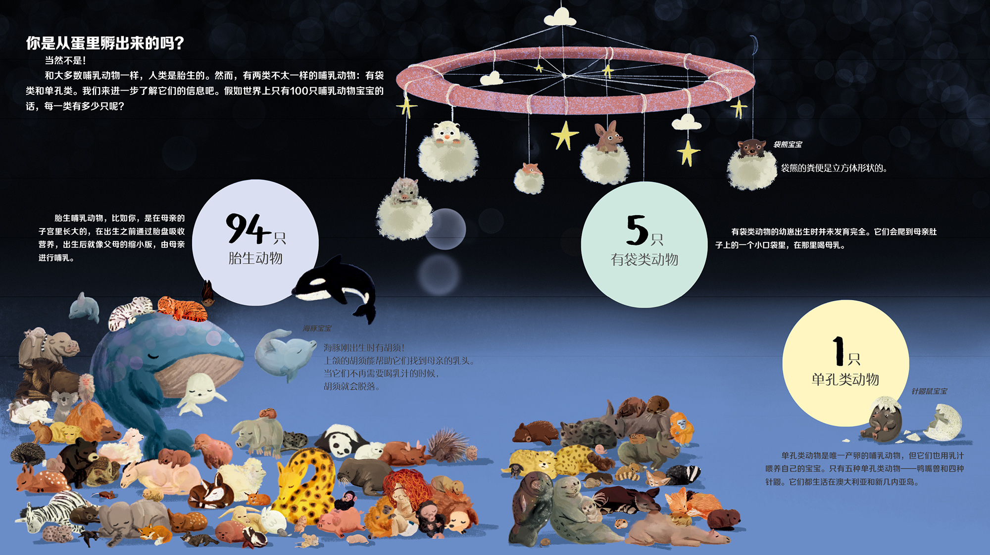 插画细腻,每张跨页有 100 只小动物,以适当大小分组,不仅能让读者立即掌握相对比例,还能在仔细翻阅时辨认不同物种,欣赏其光彩夺目的多样性。