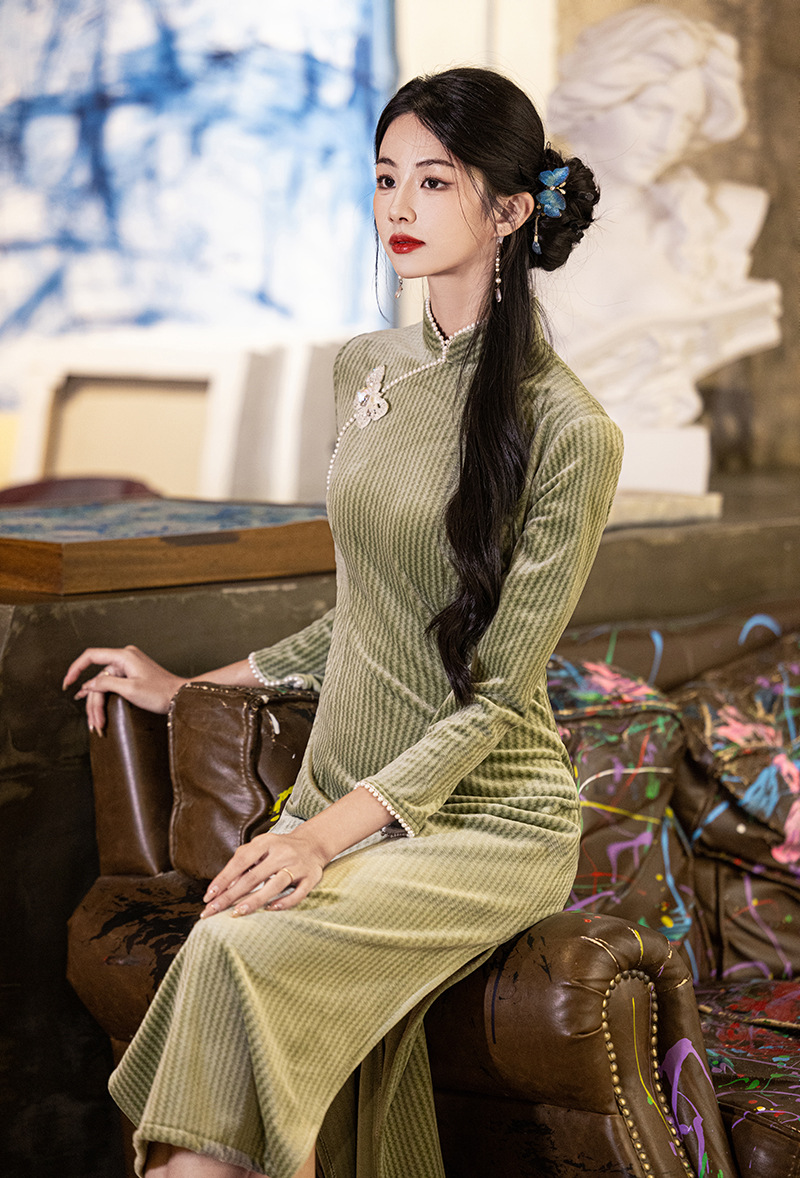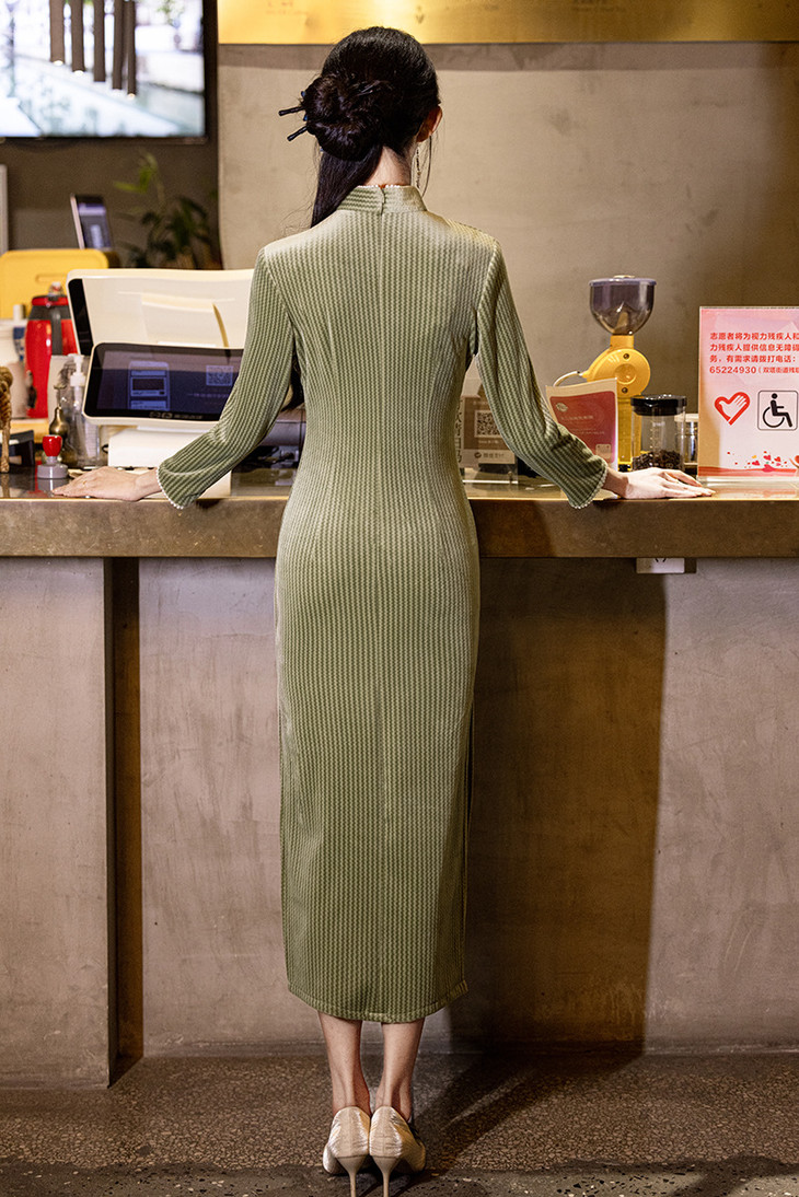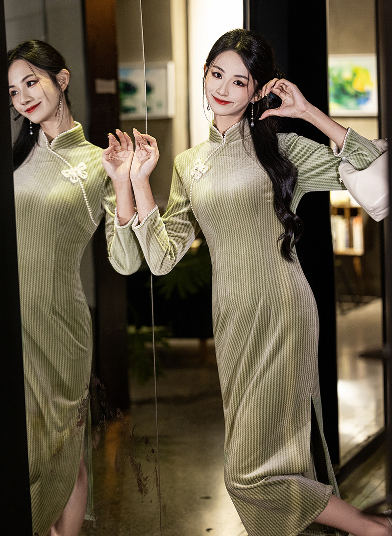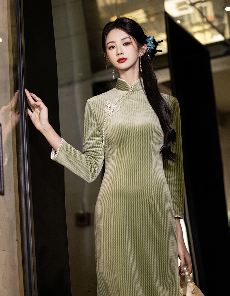 TX-8809秋季新款海岛绒绿色旗袍年轻款女复古日常改良长款连衣裙