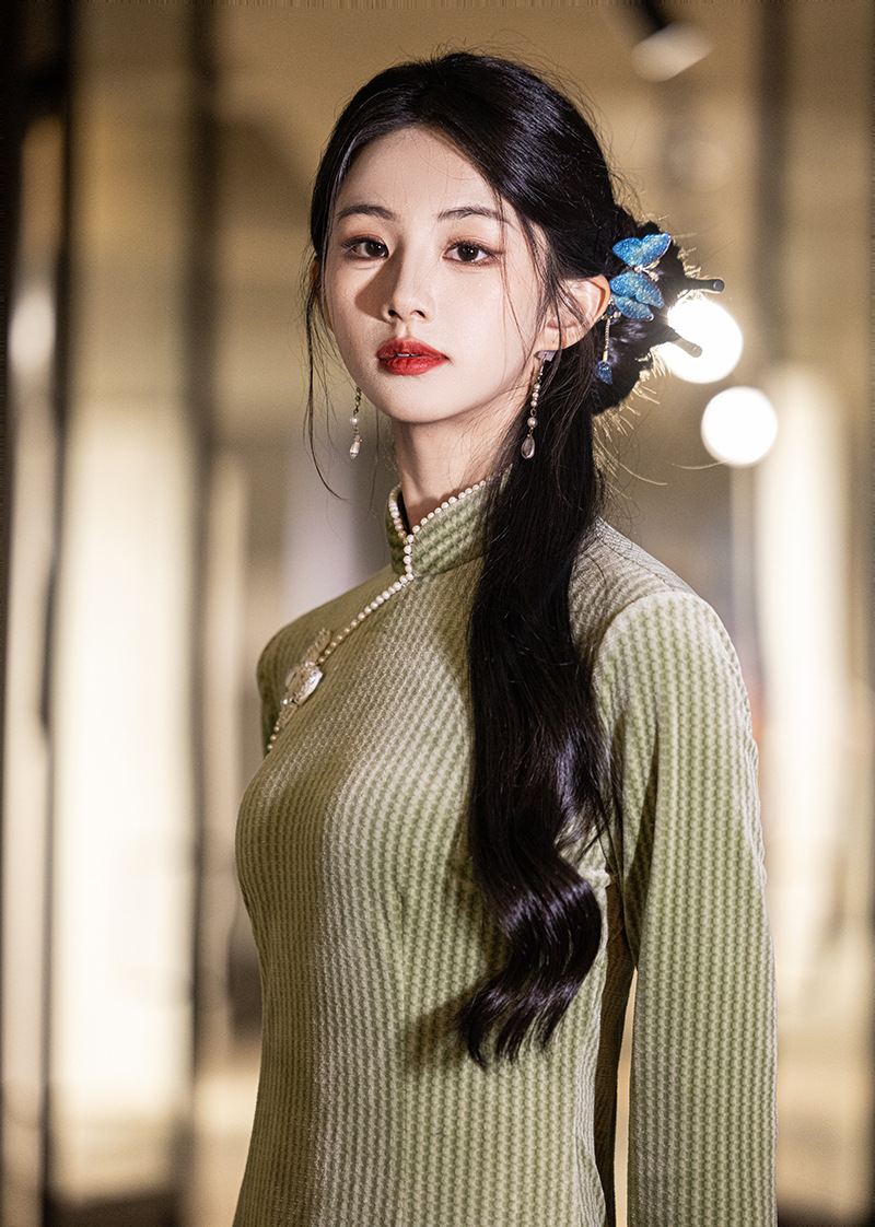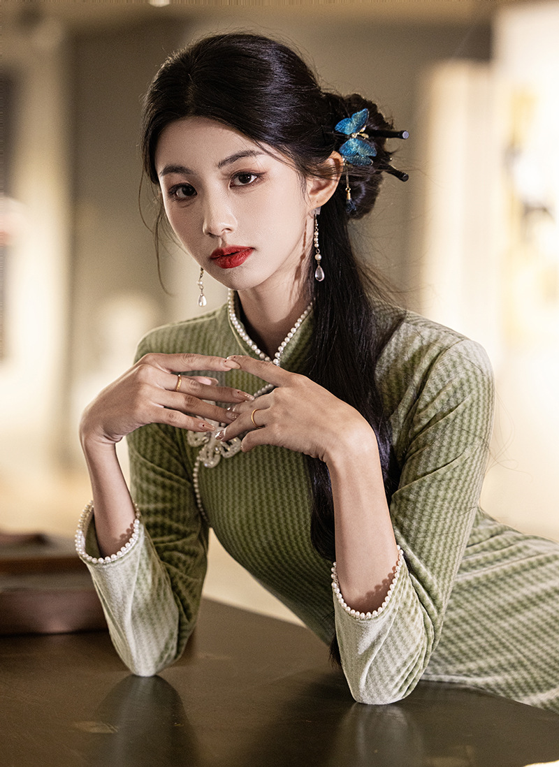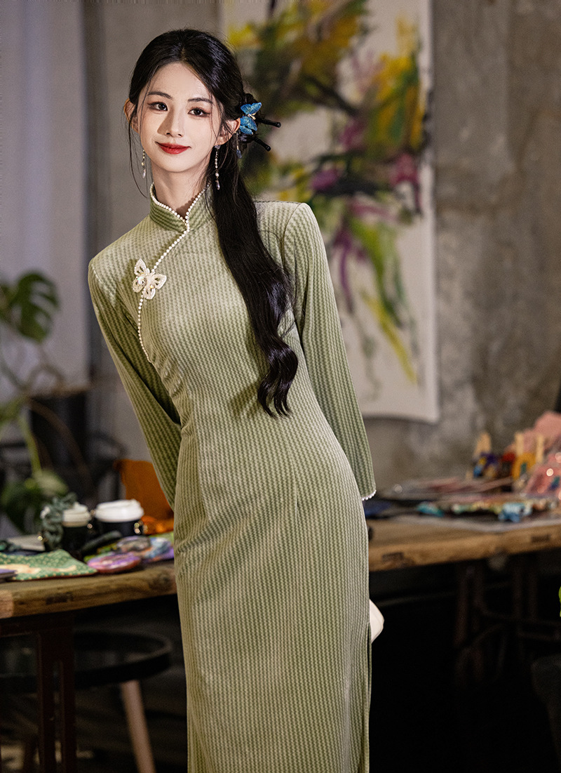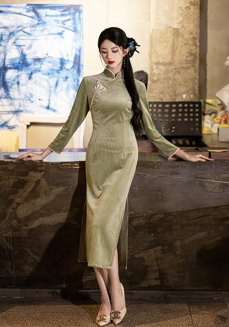 TX-8809秋季新款海岛绒绿色旗袍年轻款女复古日常改良长款连衣裙