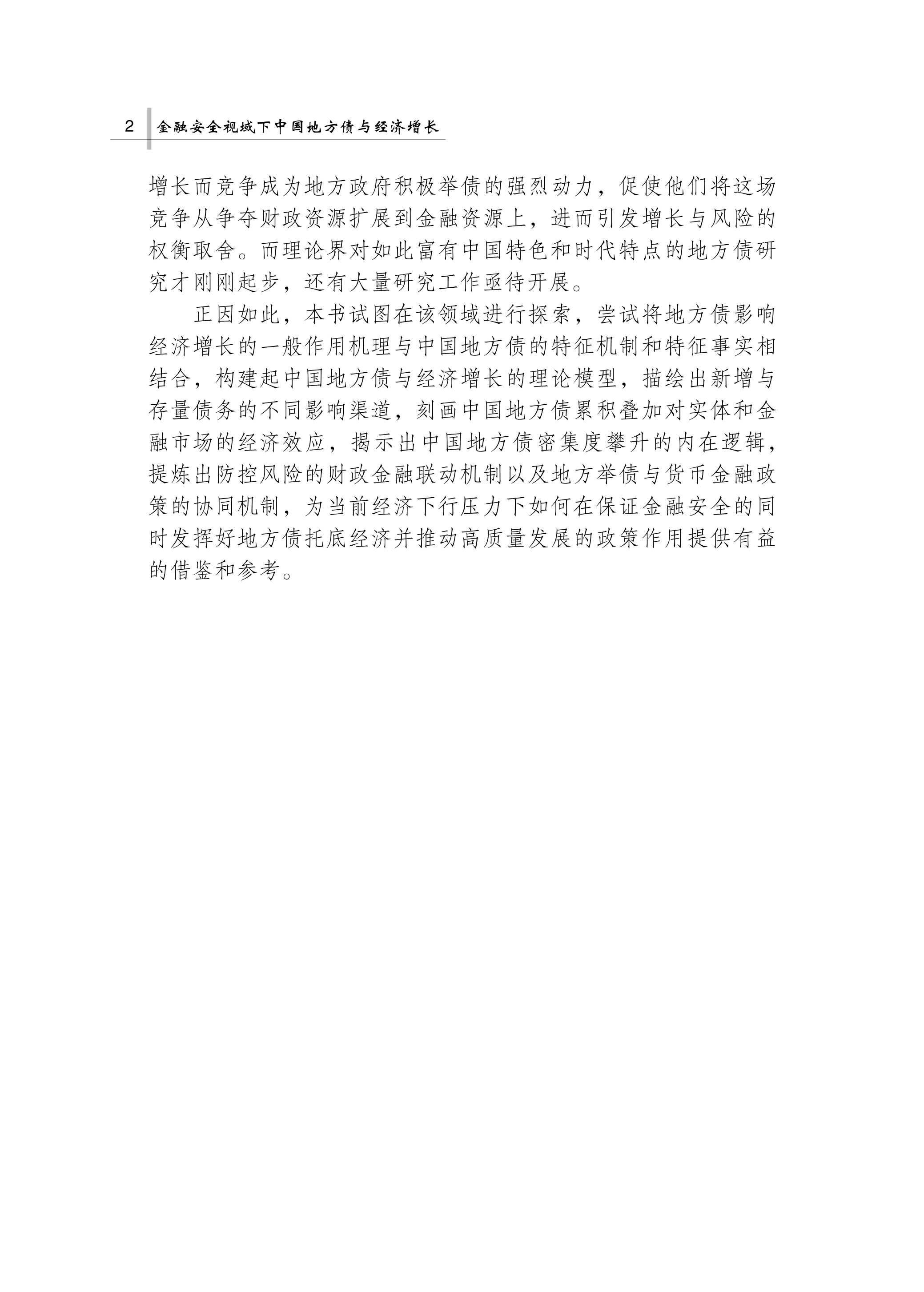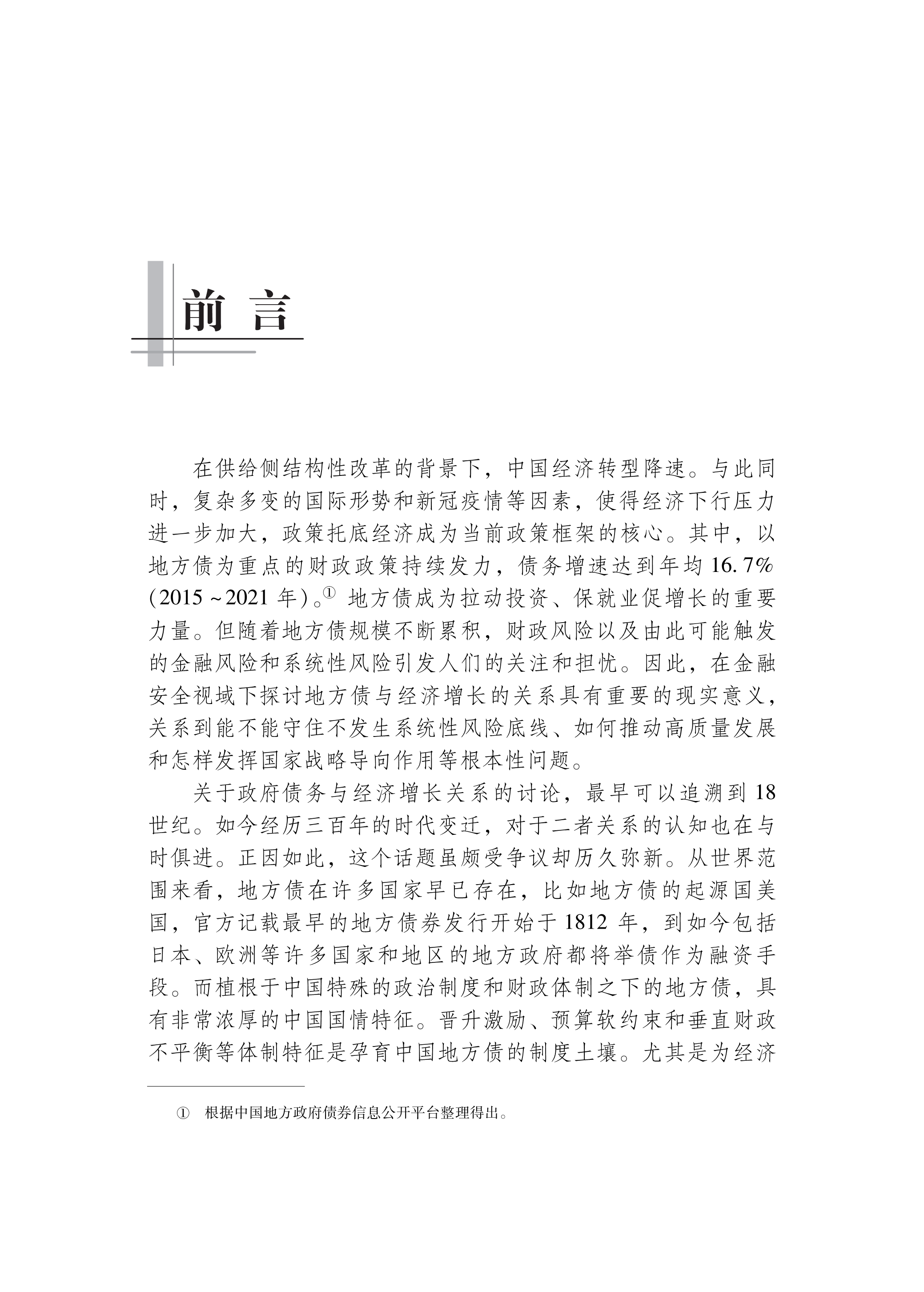 面对供给冲击、需求收缩、预期转弱的严峻形势,促投资稳增长成为当前政策框架的核心,地方债成为国家宏观调控的重要工具。同时,地方债是财政与金融的连接点,是风险传递和转化的桥梁。如何在保障金融安全的前提下发挥好地方债促投资稳增长的作用,是当前亟待深入讨论的重要课题。本书全面审视中国地方债的发展历程和形成机理,客观反映其规模和事实特征,在对其经济效应考察中创新性区分实体挤出和金融挤出,提出新增和存量分而治之的理念,并从经济货币化、金融剩余、风险转化等视角探讨其与经济增长和金融安全的关系,最终提出中国地方债与货币金融政策的协同机制,以期为这一重要课题的讨论提供参考和借鉴。