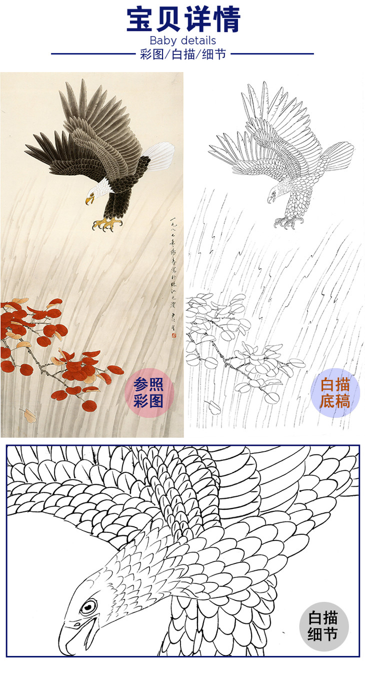 竖幅工笔花鸟白描底稿-鹰-周彦生《雄姿》-多种白描尺寸可选-QN29