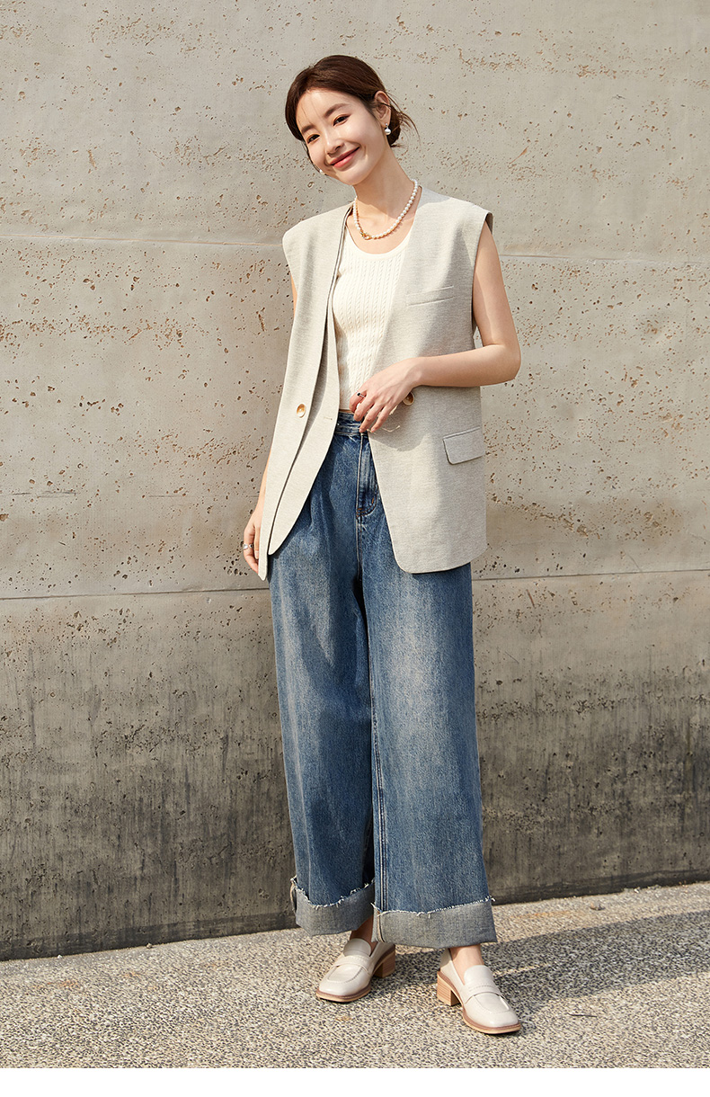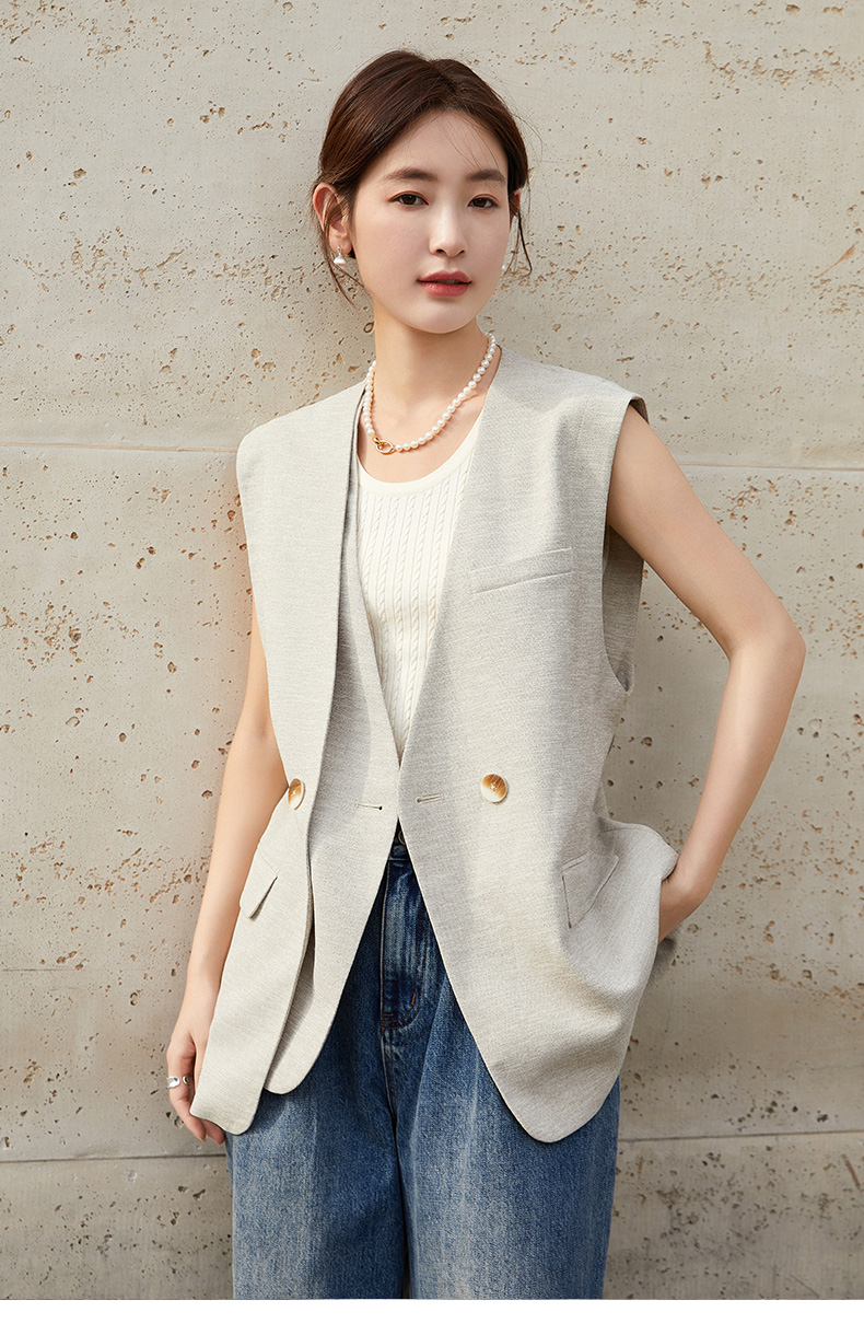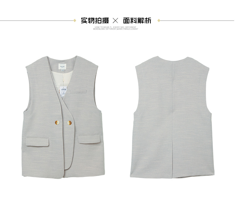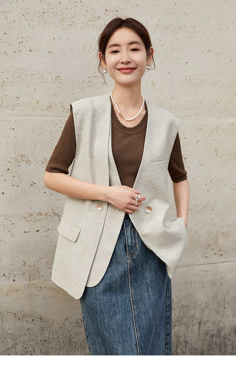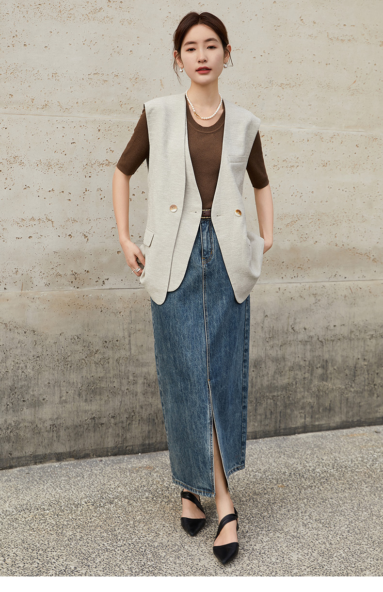 韩系简约风!米白色质感马甲 双排扣设计 配牛仔裙超有范