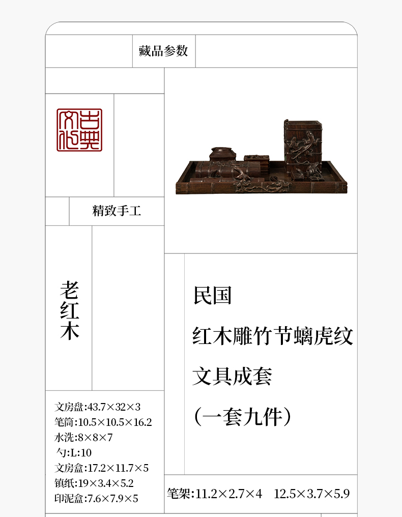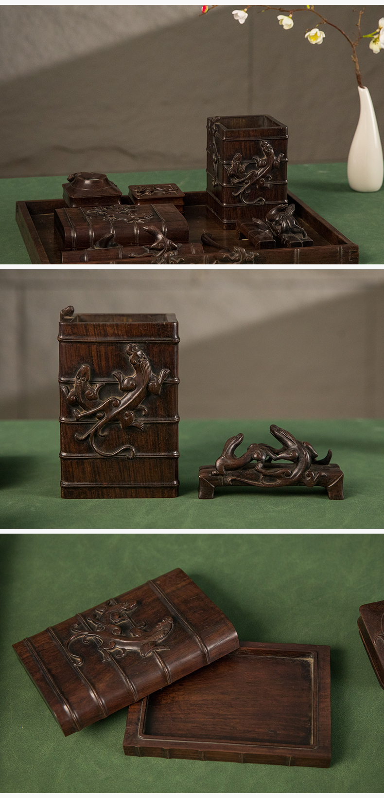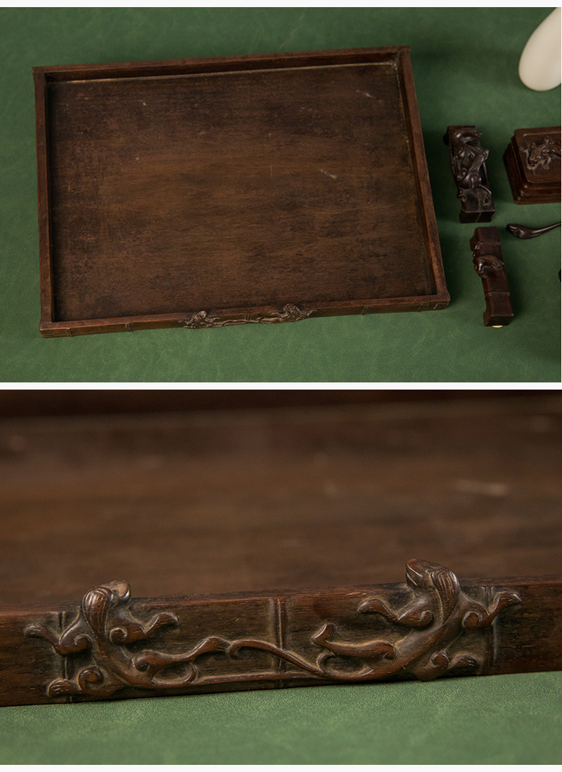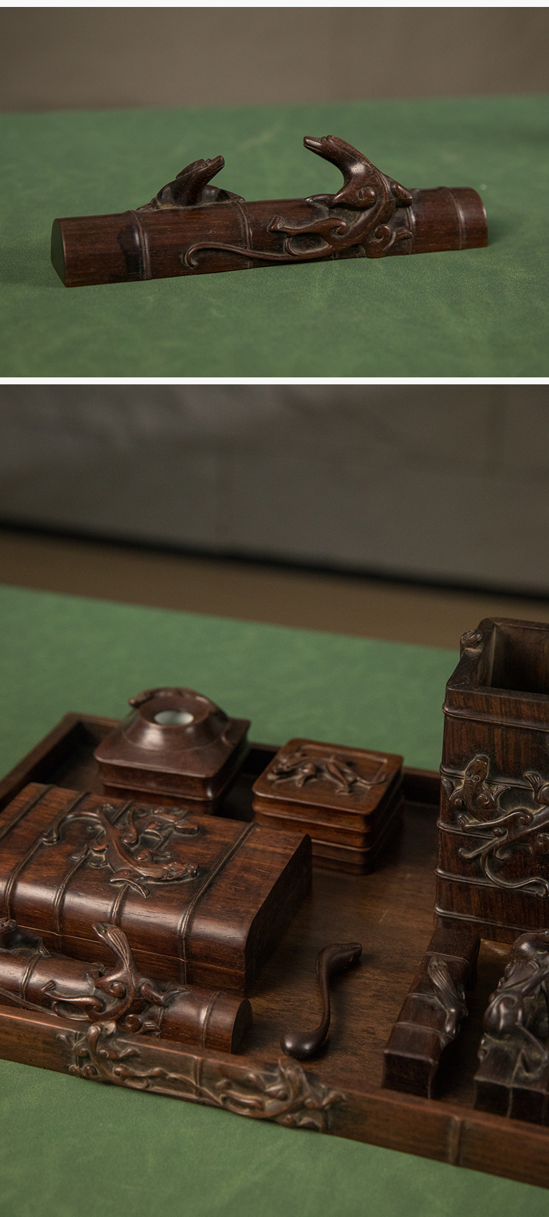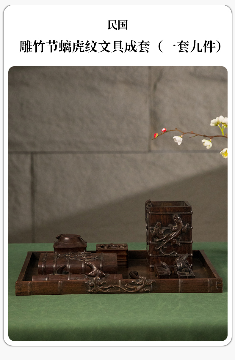 民国 红木雕竹节螭虎纹文具成套(一套九件)