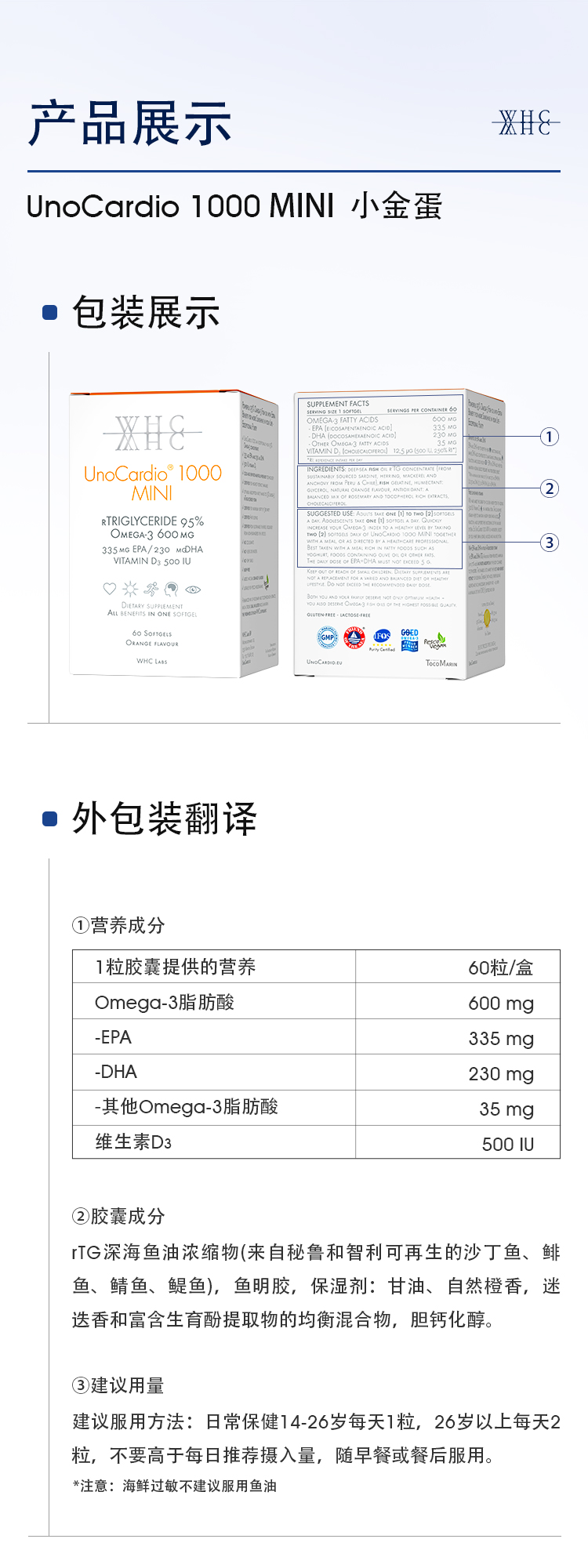 【2件-40】WHC比利时 小金蛋鱼油Omega3高纯度95% rTG结构青少年学生备考补脑60粒