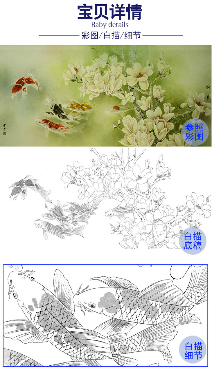 龚雪青横幅工笔花鸟白描底稿-玉兰鲤鱼-《玉堂锦绣》-多种白描尺寸可选-XQ62