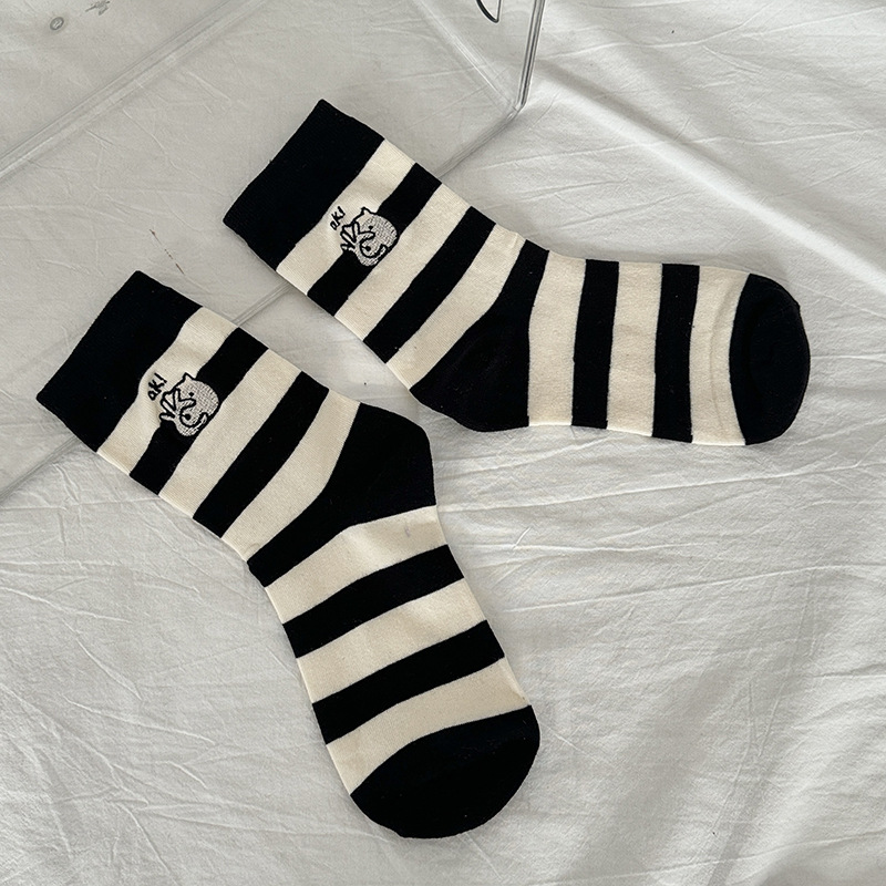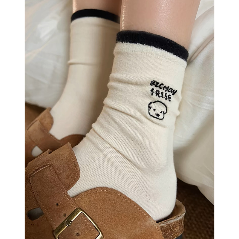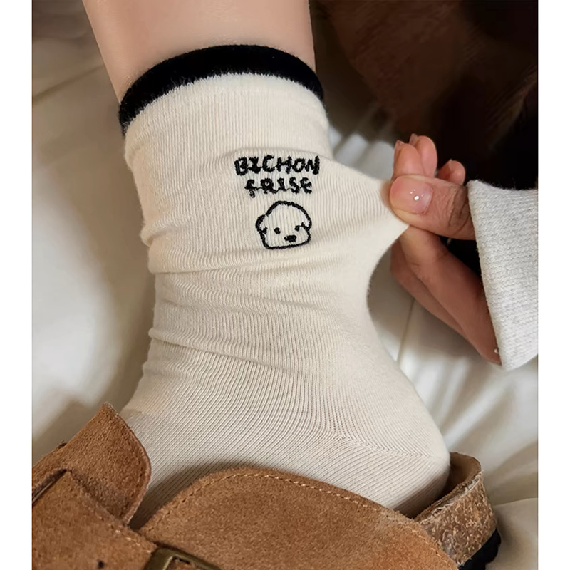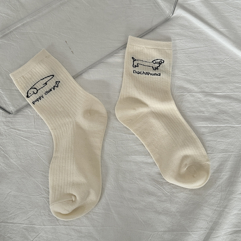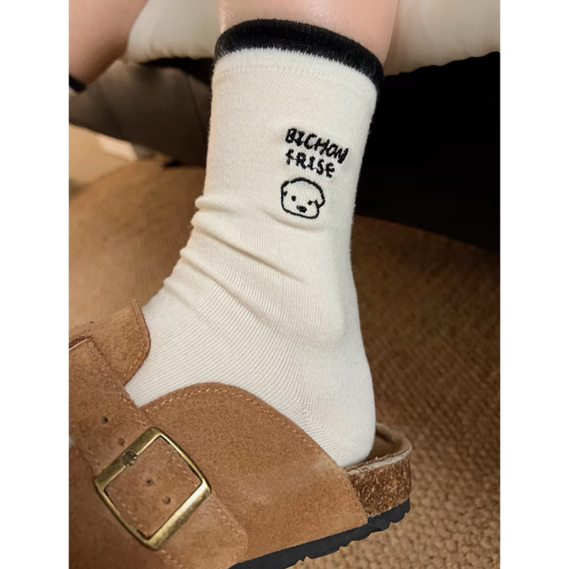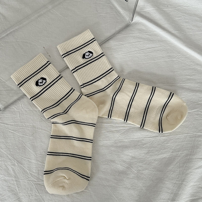 【舒适棉质,透气不闷热】卡通小狗袜子 女生可爱中筒袜 春秋棉袜 ins潮网红韩国条纹长袜-QQ
