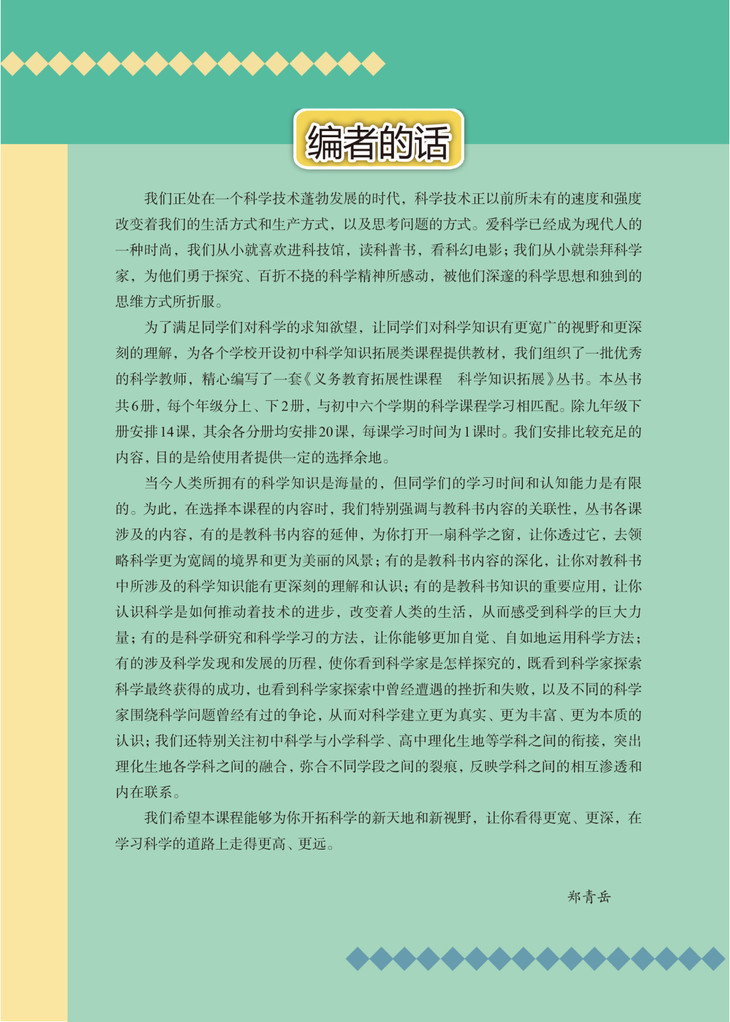 郑青岳,浙江省特级教师、功勋教师,浙江省义务教育教材《科学》主要作者之一。